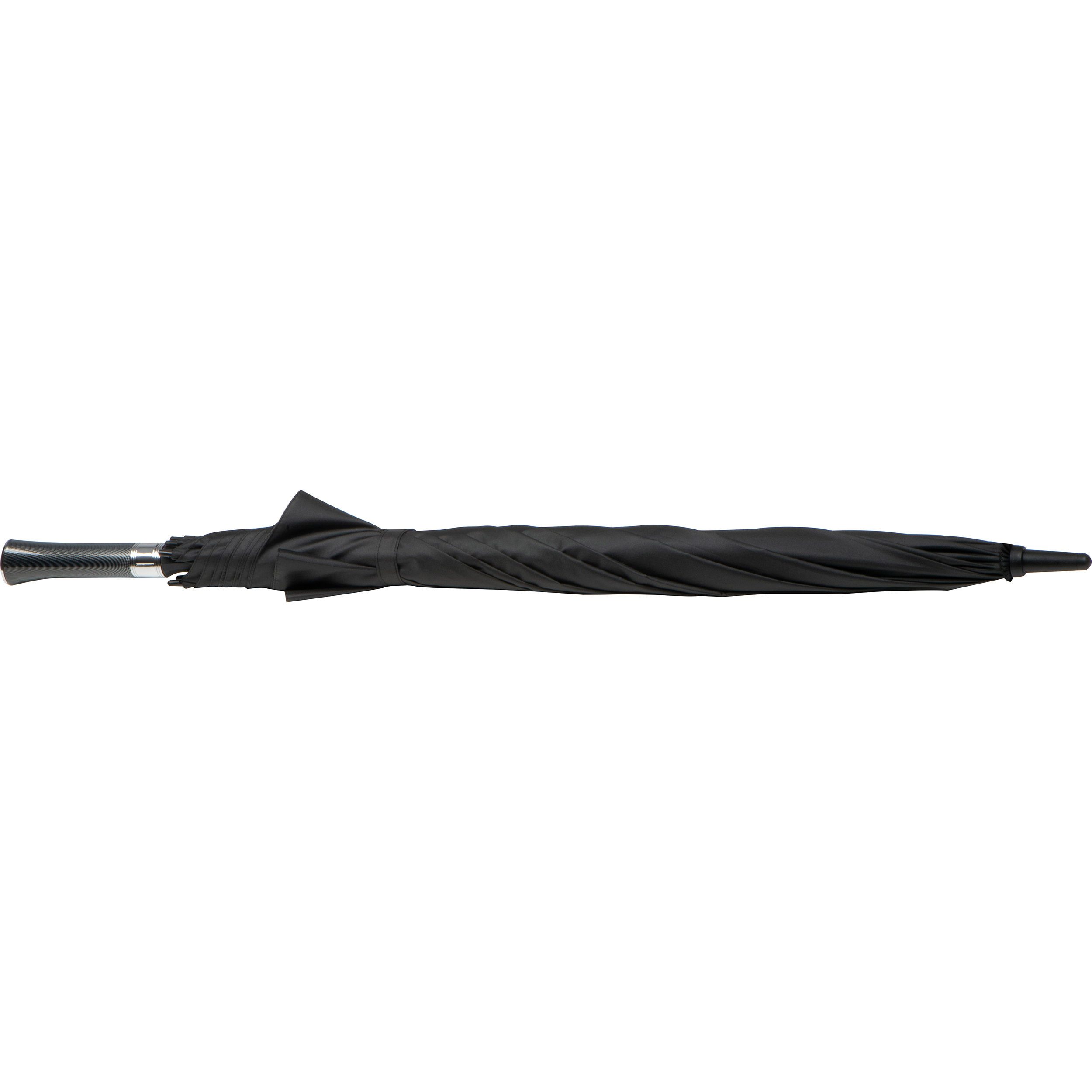 Hochwertiger Regenschirm aus 190T Pongee mit schwarzem Fiberglassgestänge, edlem Griff und automatischer Öffnung auf Knopfdruck. Ihre Werbung drucken wir auf ein Segment.