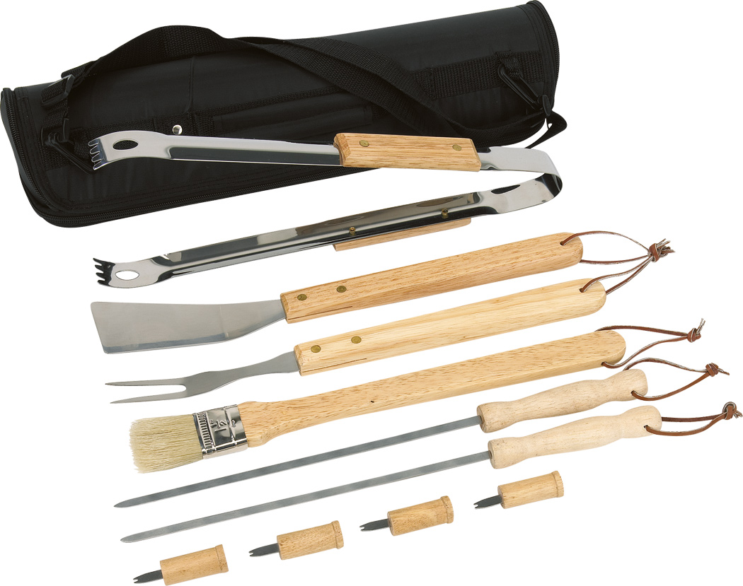 Hochwertiges Grillbesteck FRIED: aus Edelstahl mit Holzgriffen, im Reißverschlussetui
