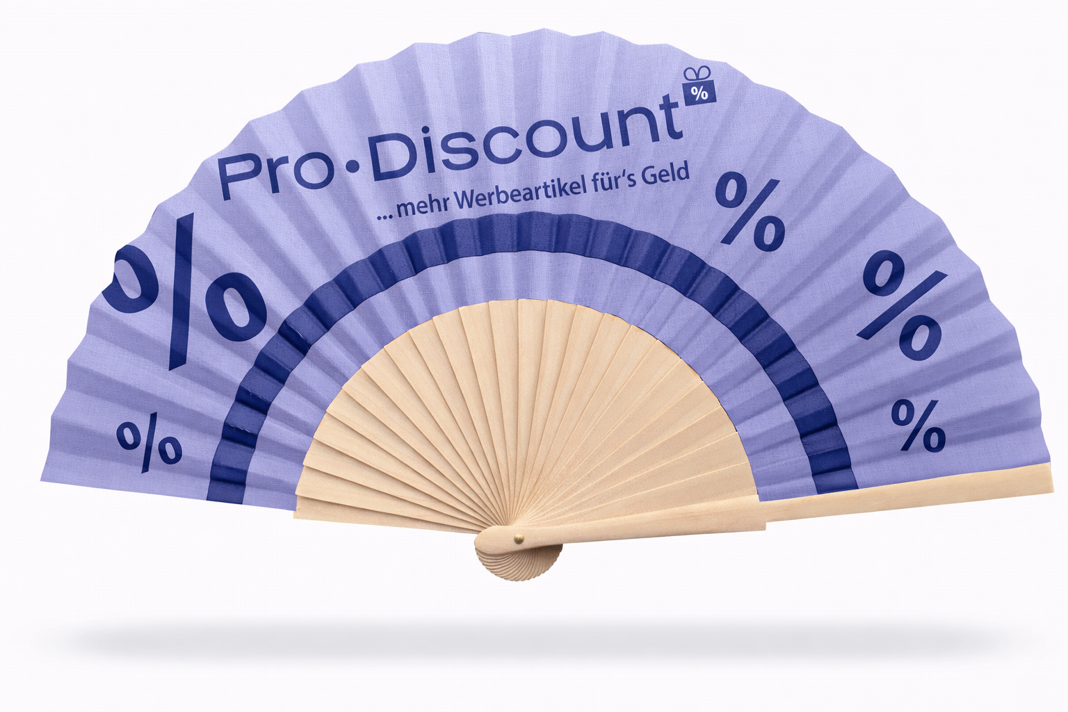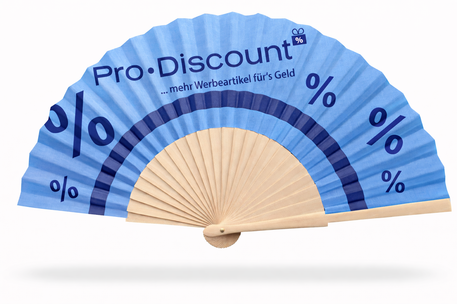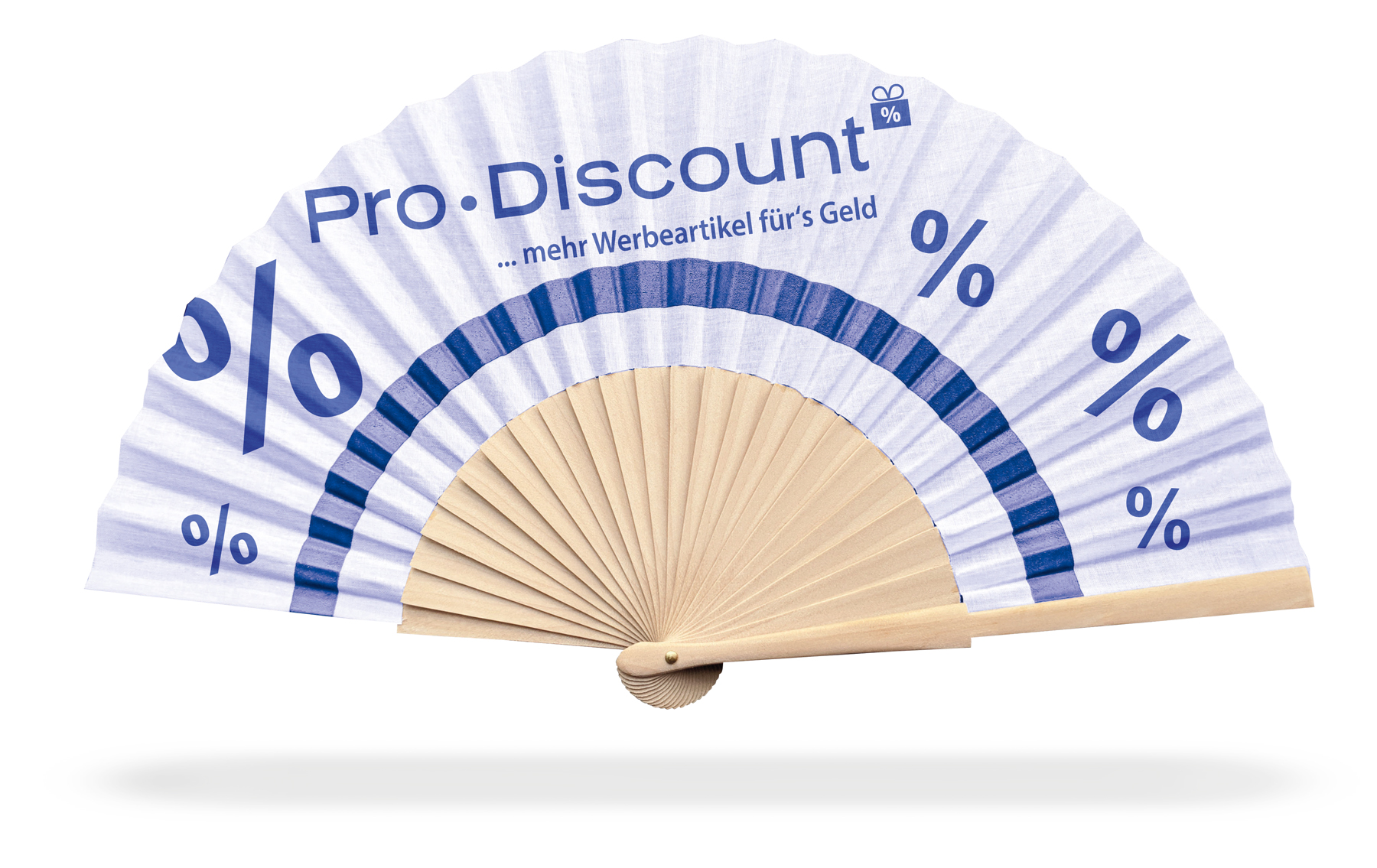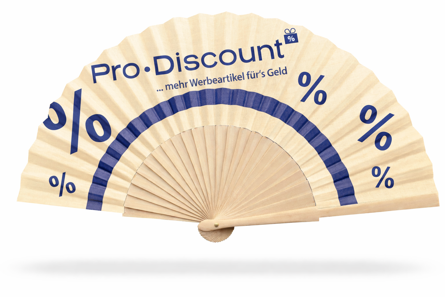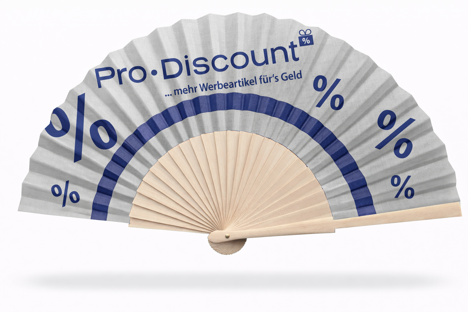 Logo-Handfächer aus Gewebe und Holzgestell.