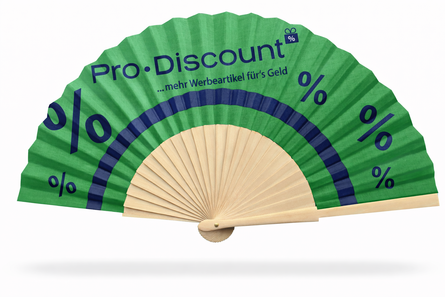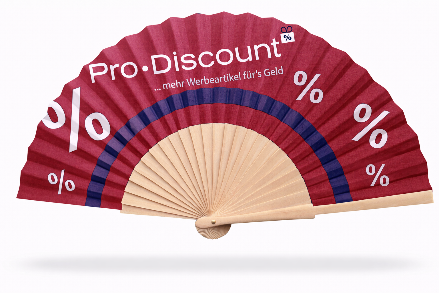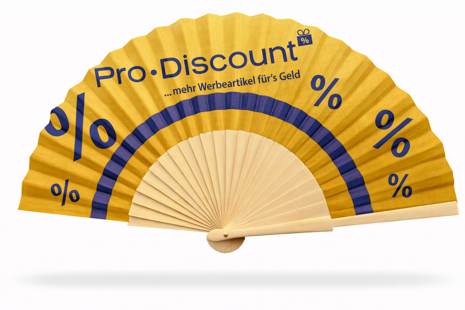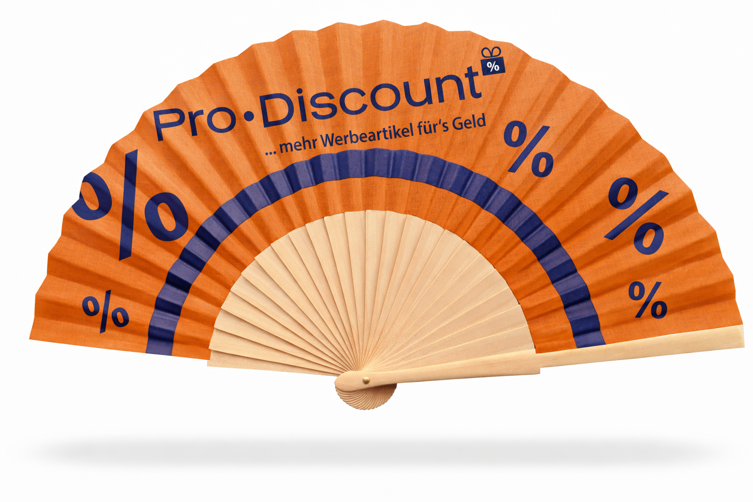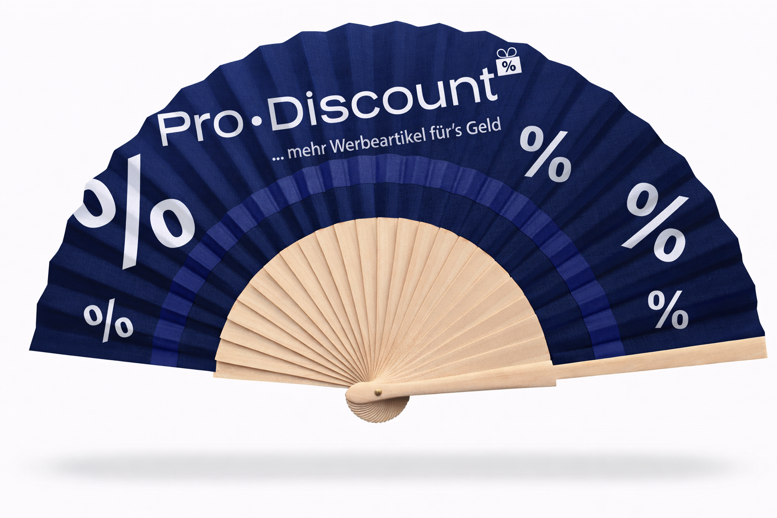 Logo-Handfächer aus Gewebe und Holzgestell.