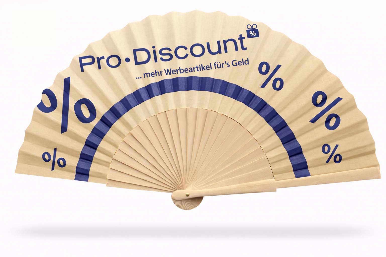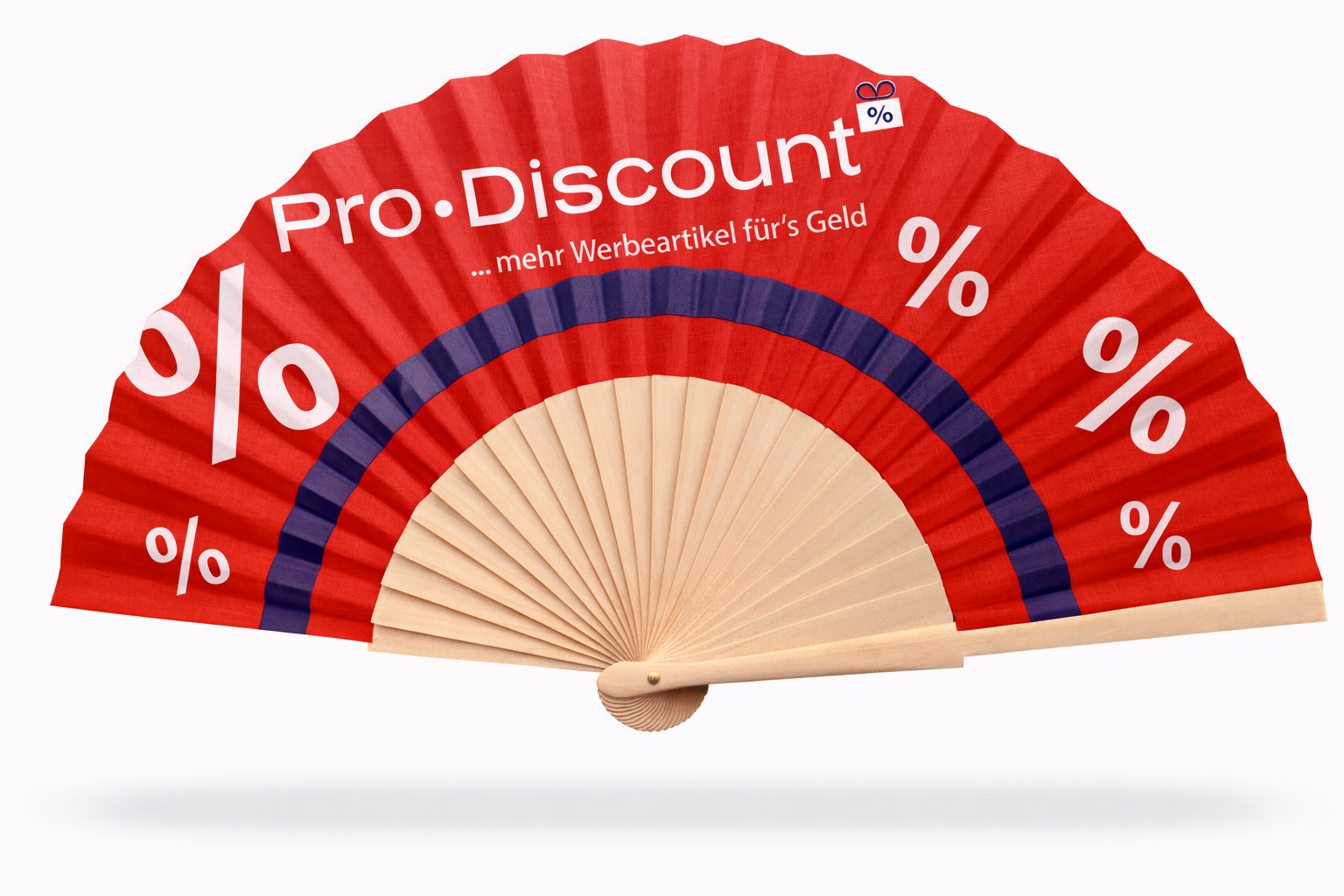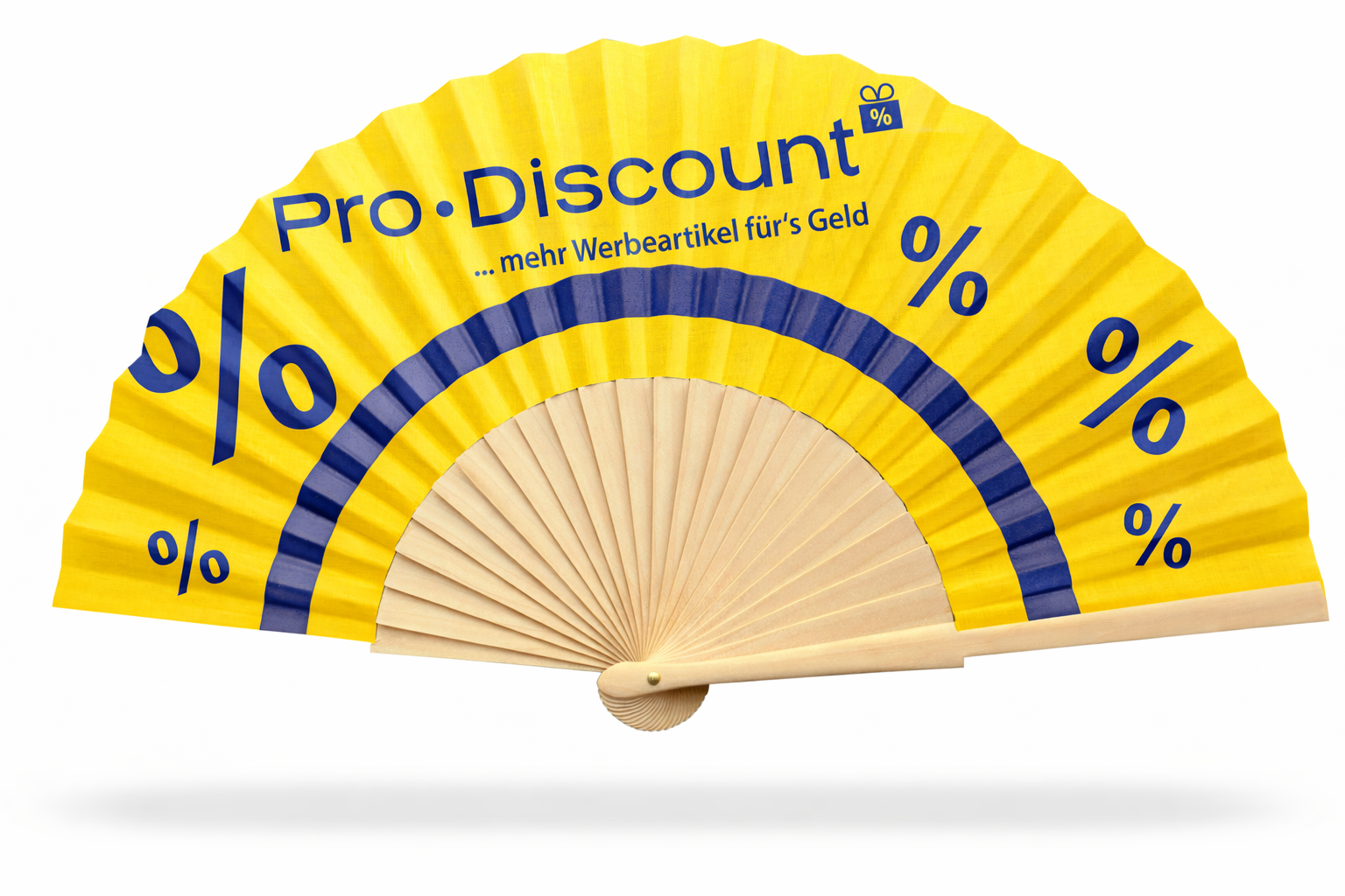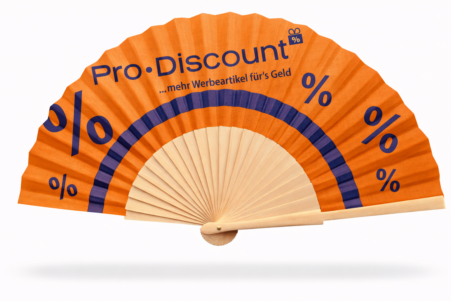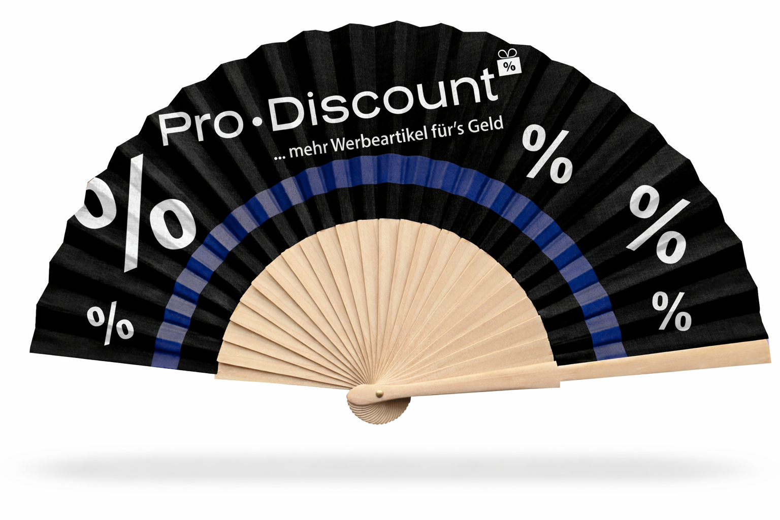 Logo-Handfächer aus Gewebe und Holzgestell.