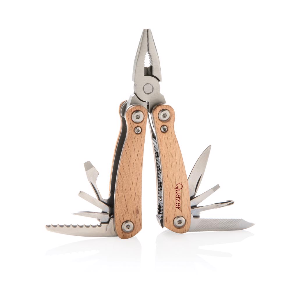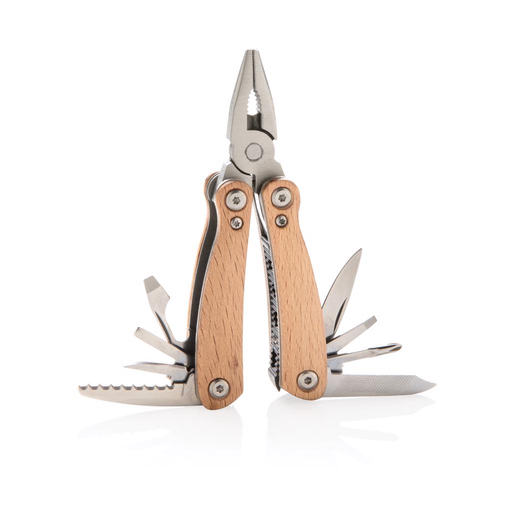 Multitool mit Buchengriff. 12 Funktionen aus Edelstahl wie eine Zange, Messer, Schraubendreher, Säge, Dosenöffner und vielem mehr. In Geschenkbox verpackt.