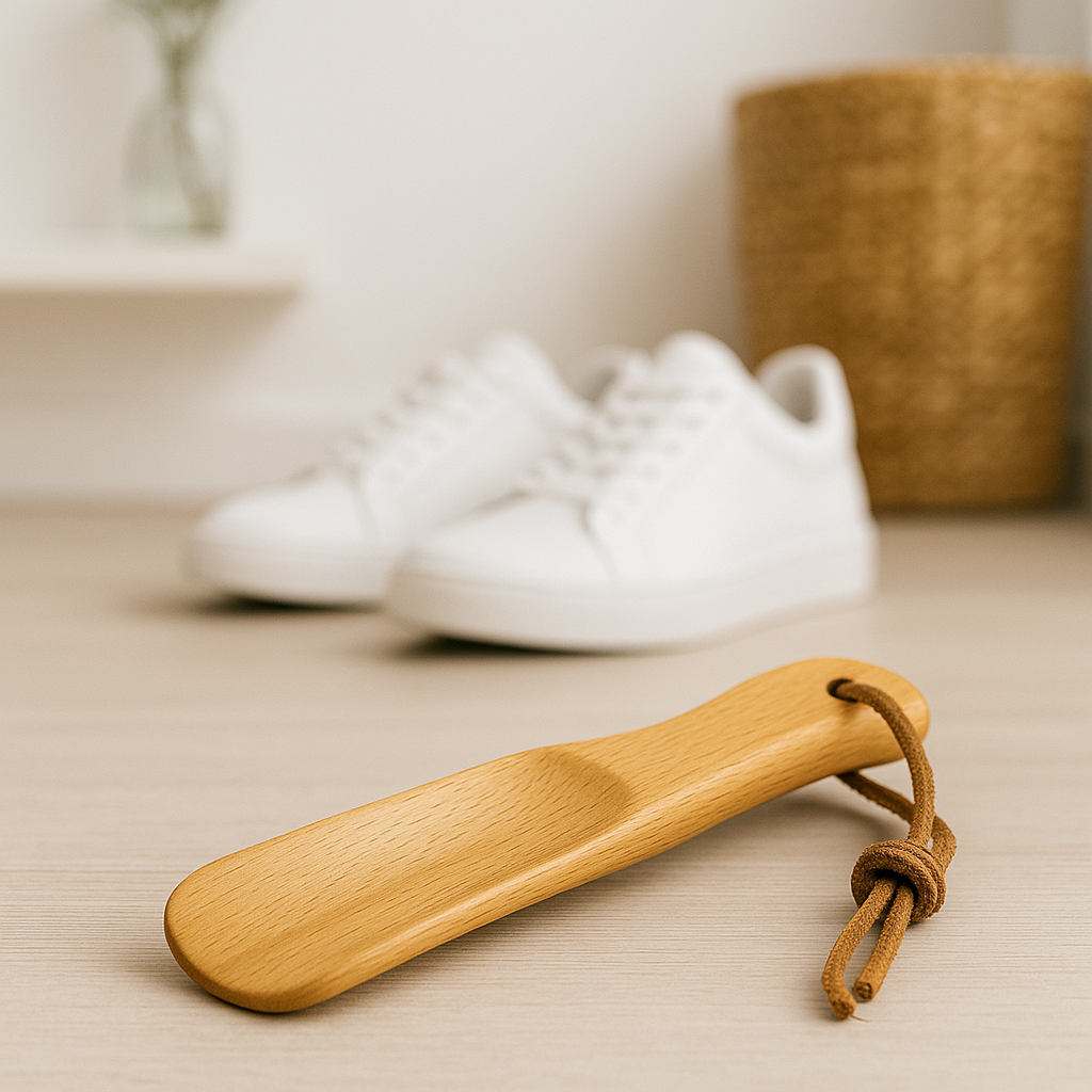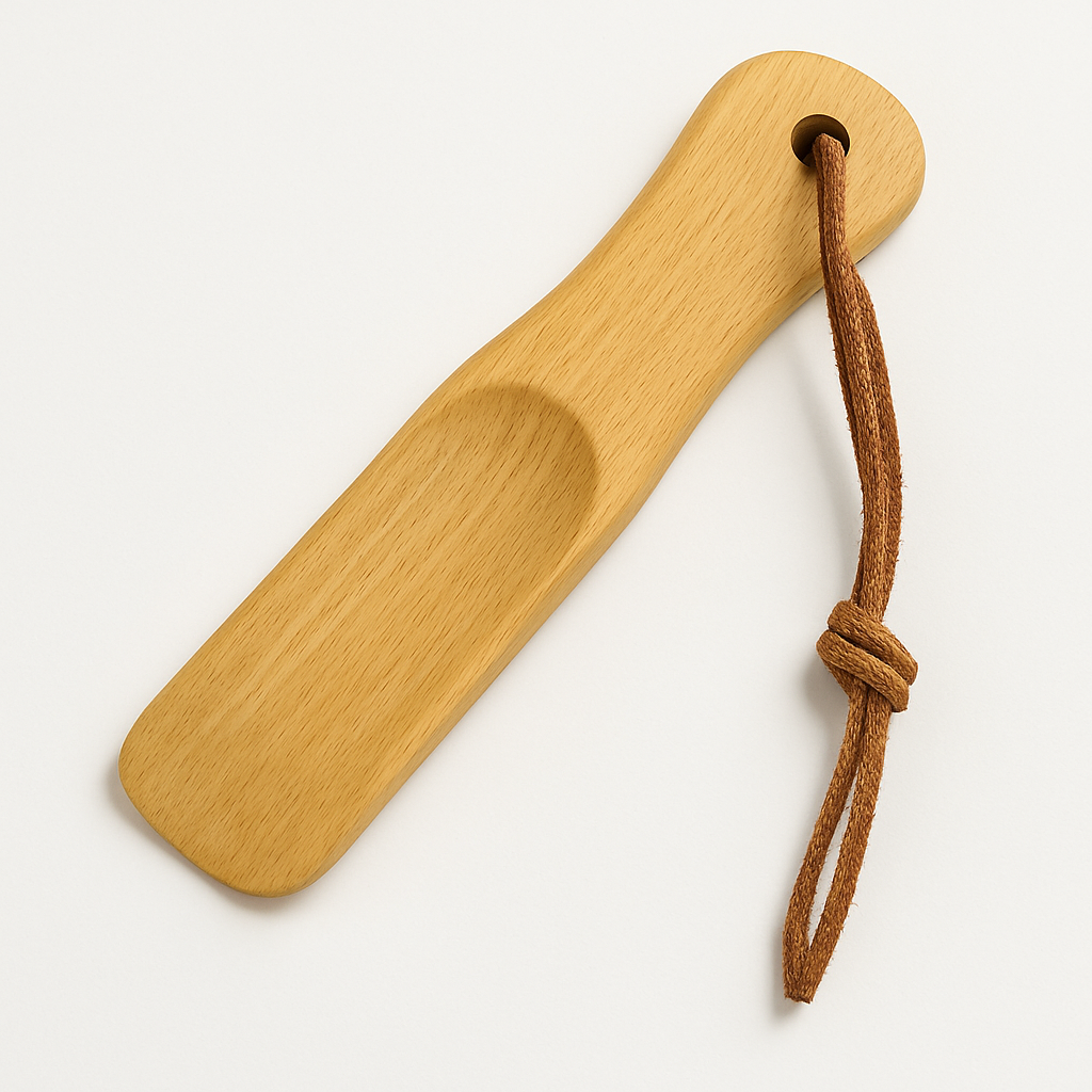 Holz-Schuhlöffel aus massiver Buche, geölt. Länge ca. 15,5 cm, Breite ca. 3,6 cm, Stärke ca. 1 cm. Mit Lederbandschlaufe.