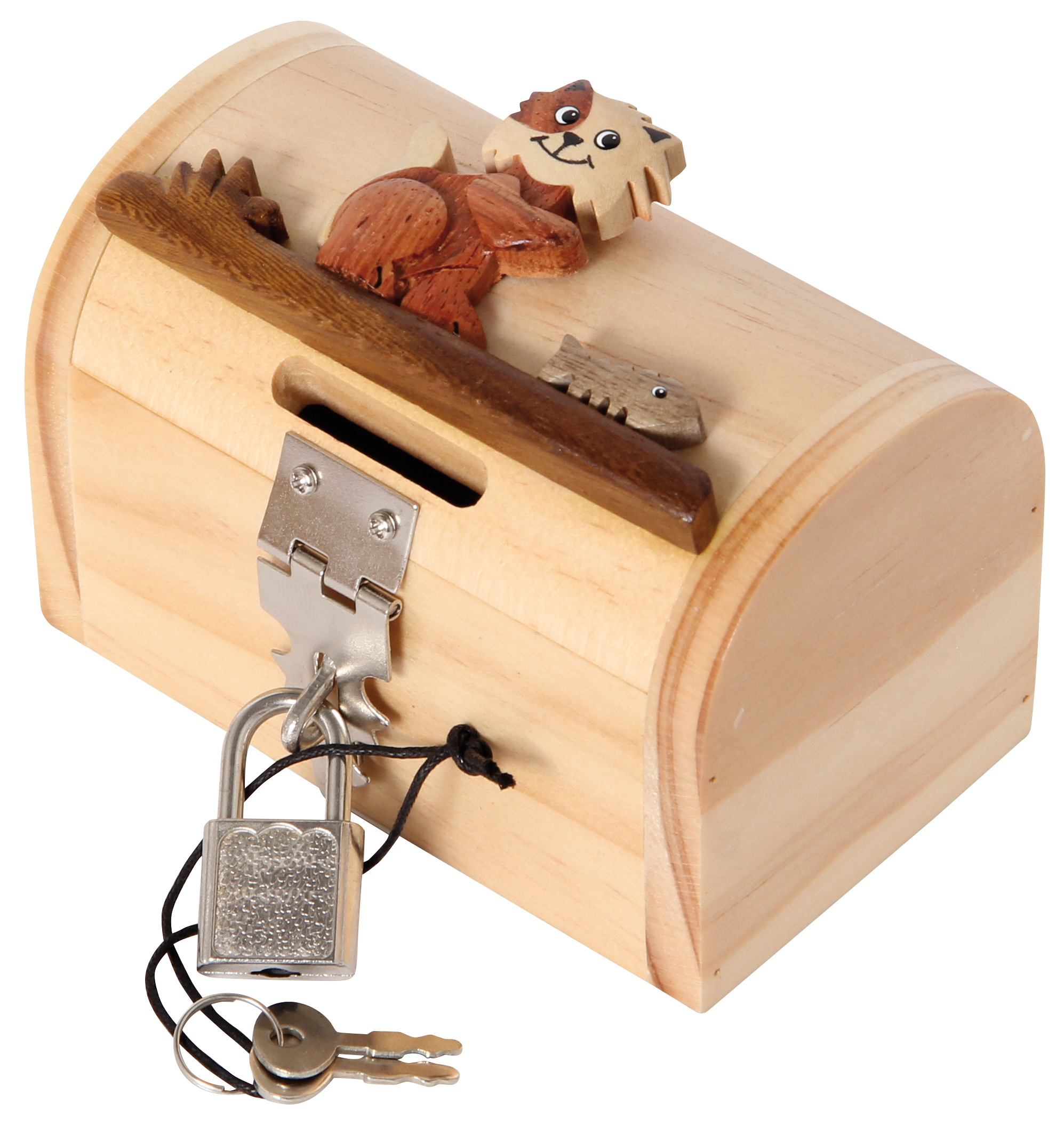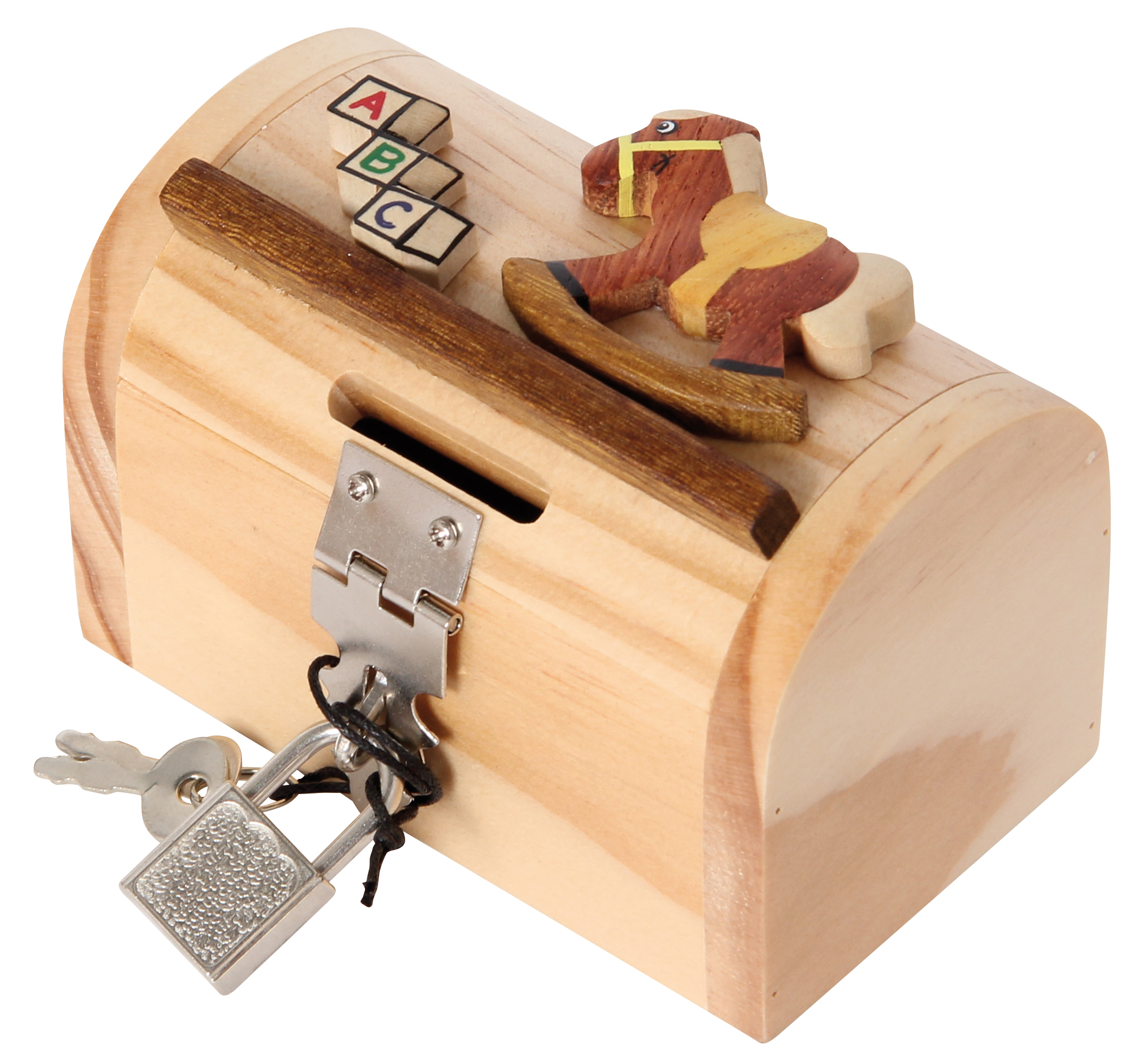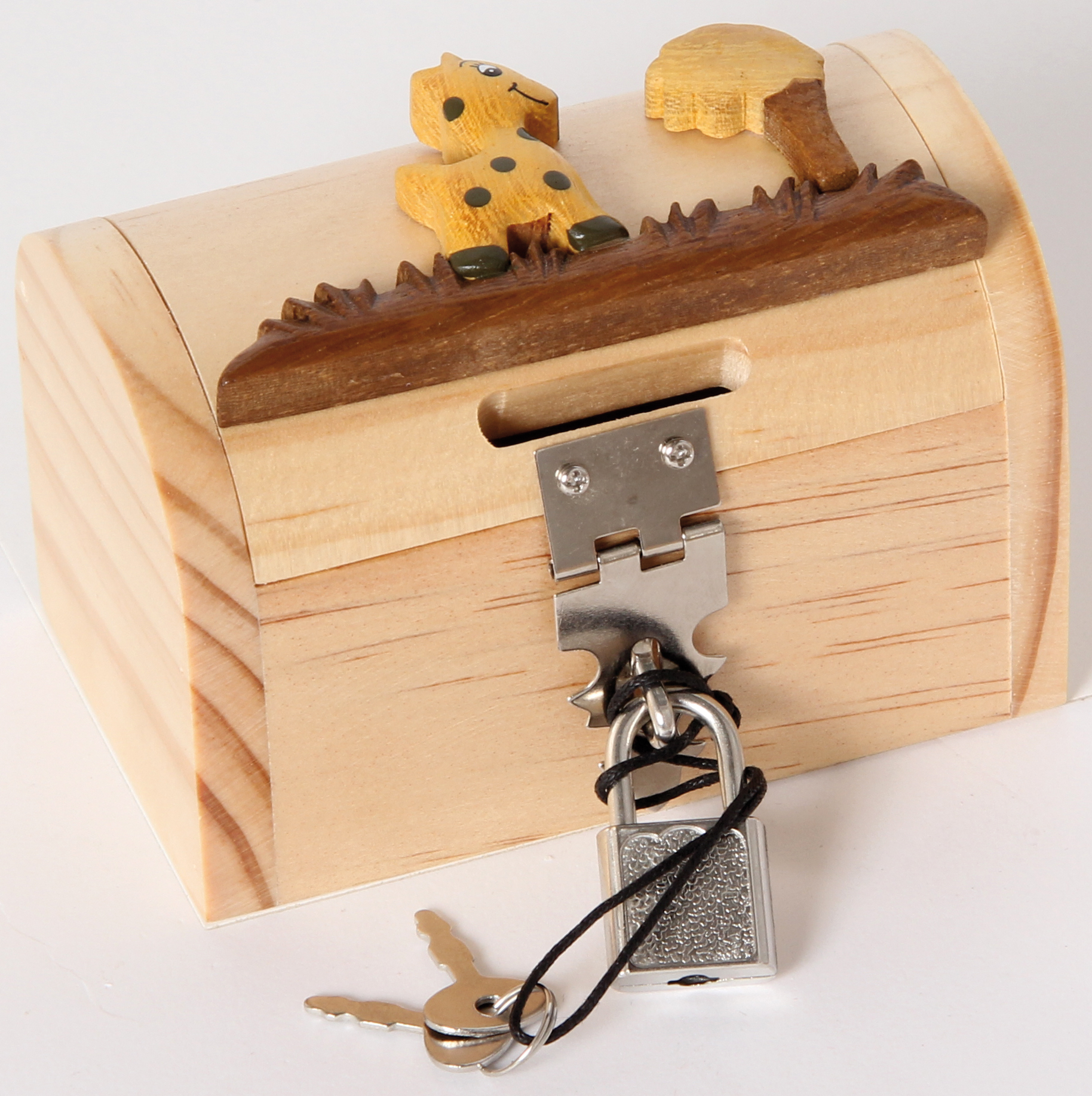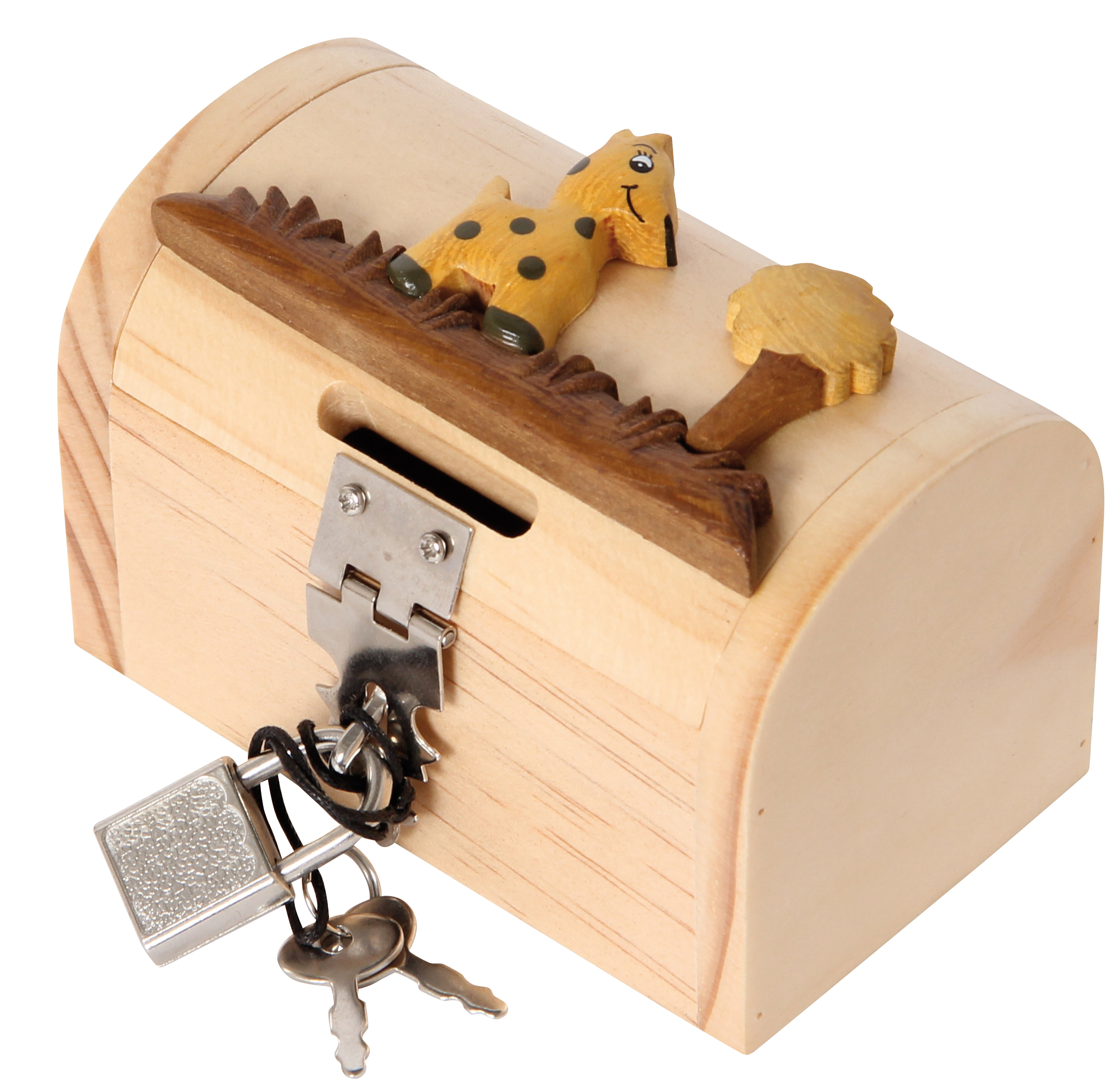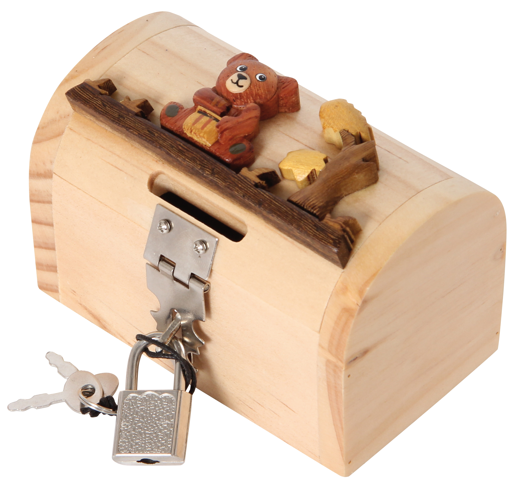 Hochwertige Holzsparkasse mit Schloss. Sechs Motive sortiert.