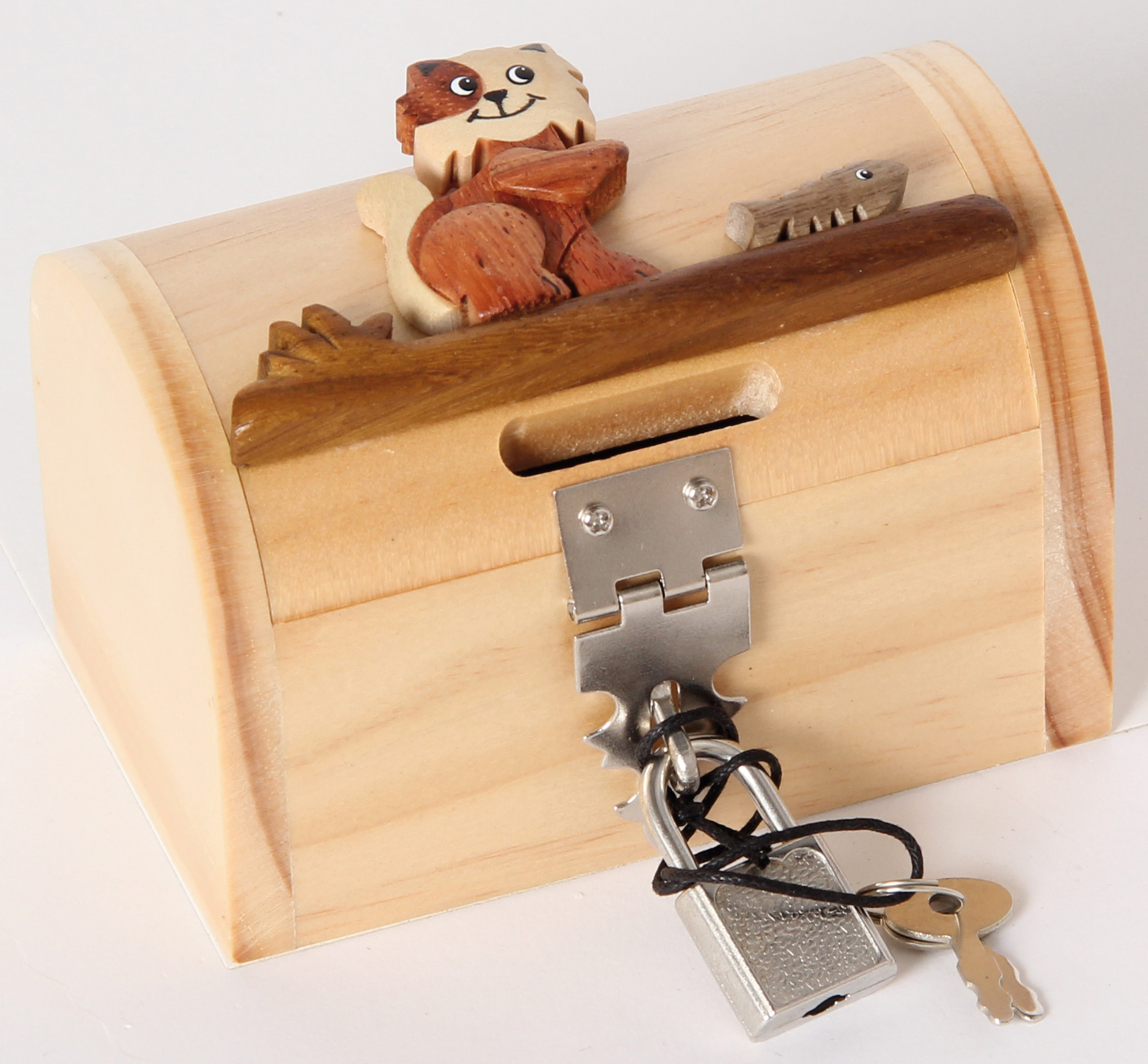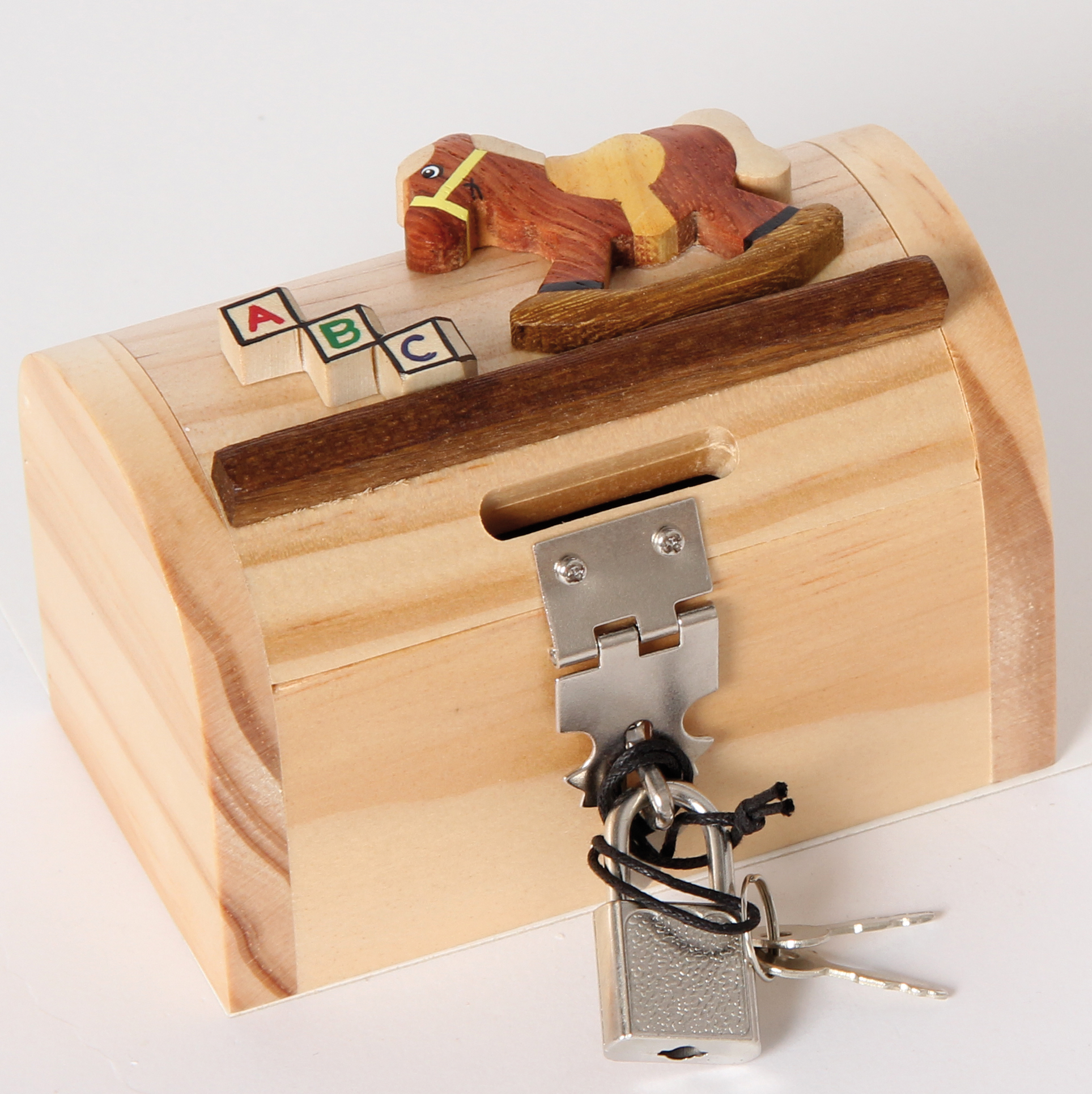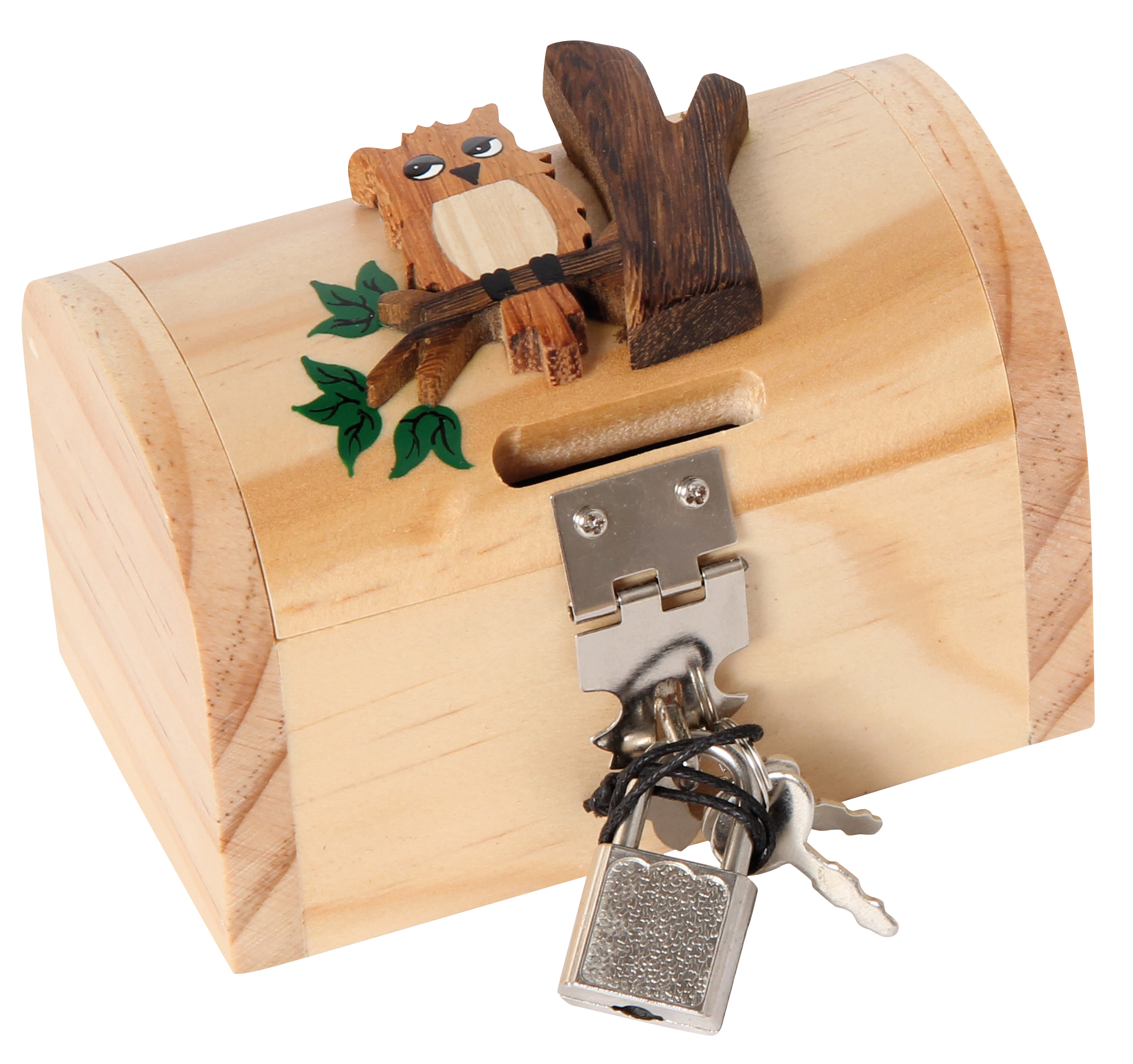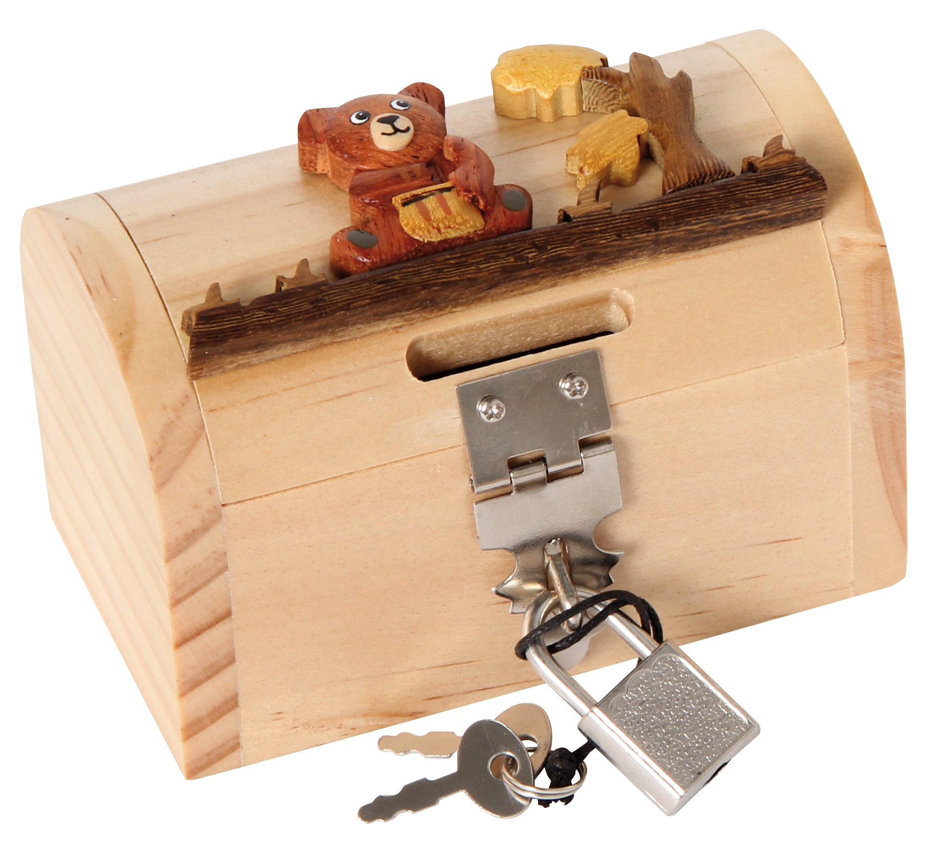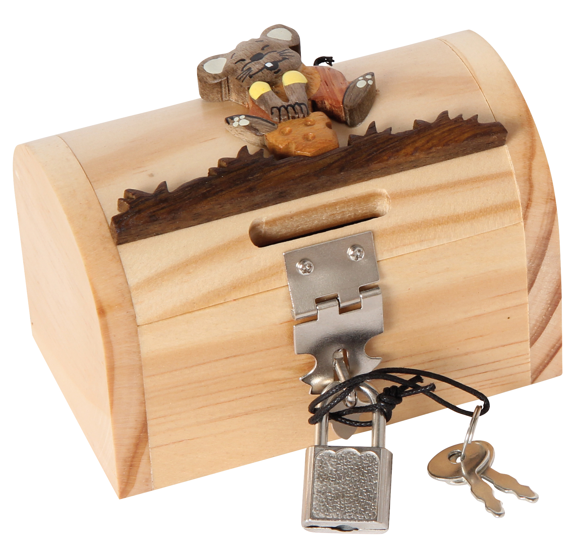 Hochwertige Holzsparkasse mit Schloss. Sechs Motive sortiert.