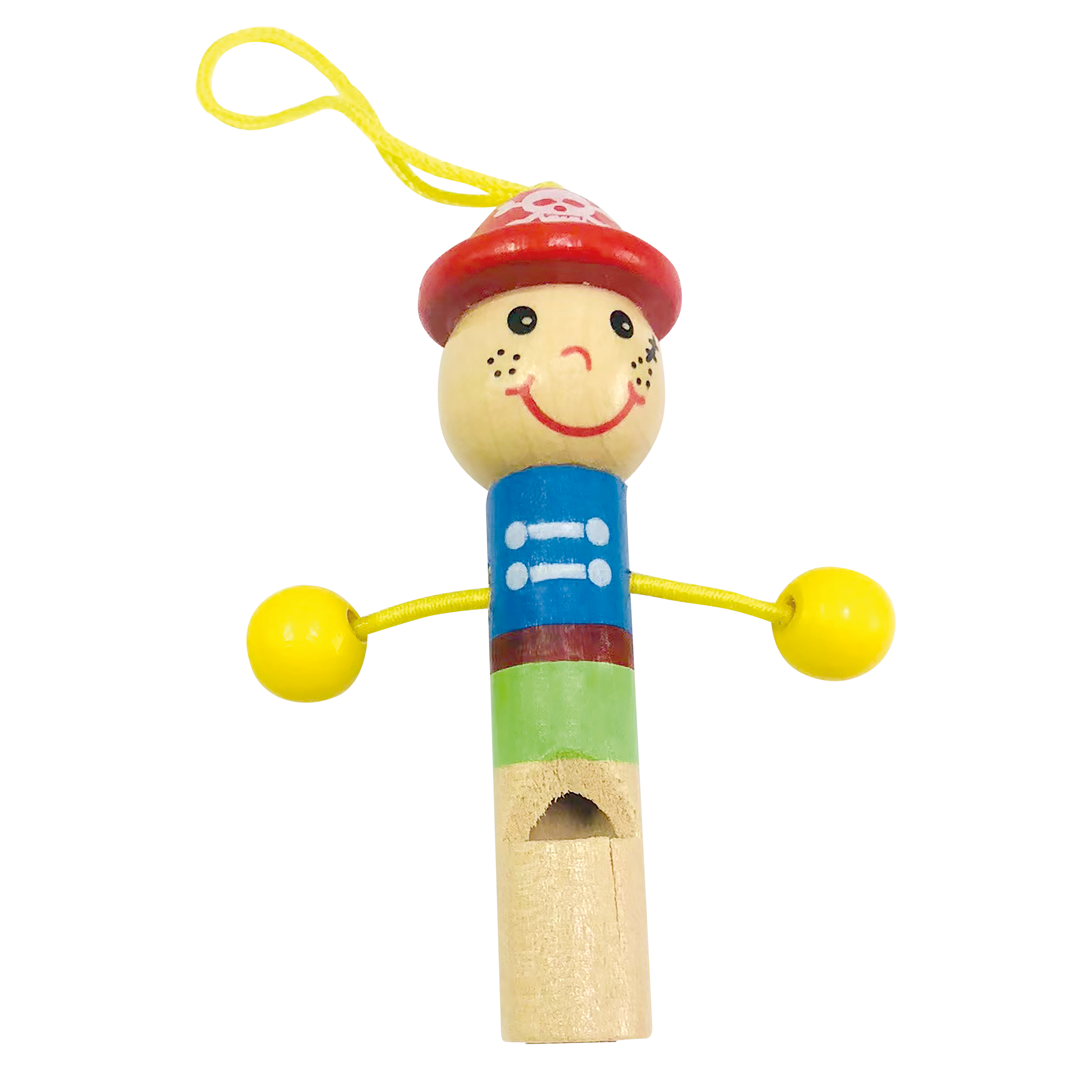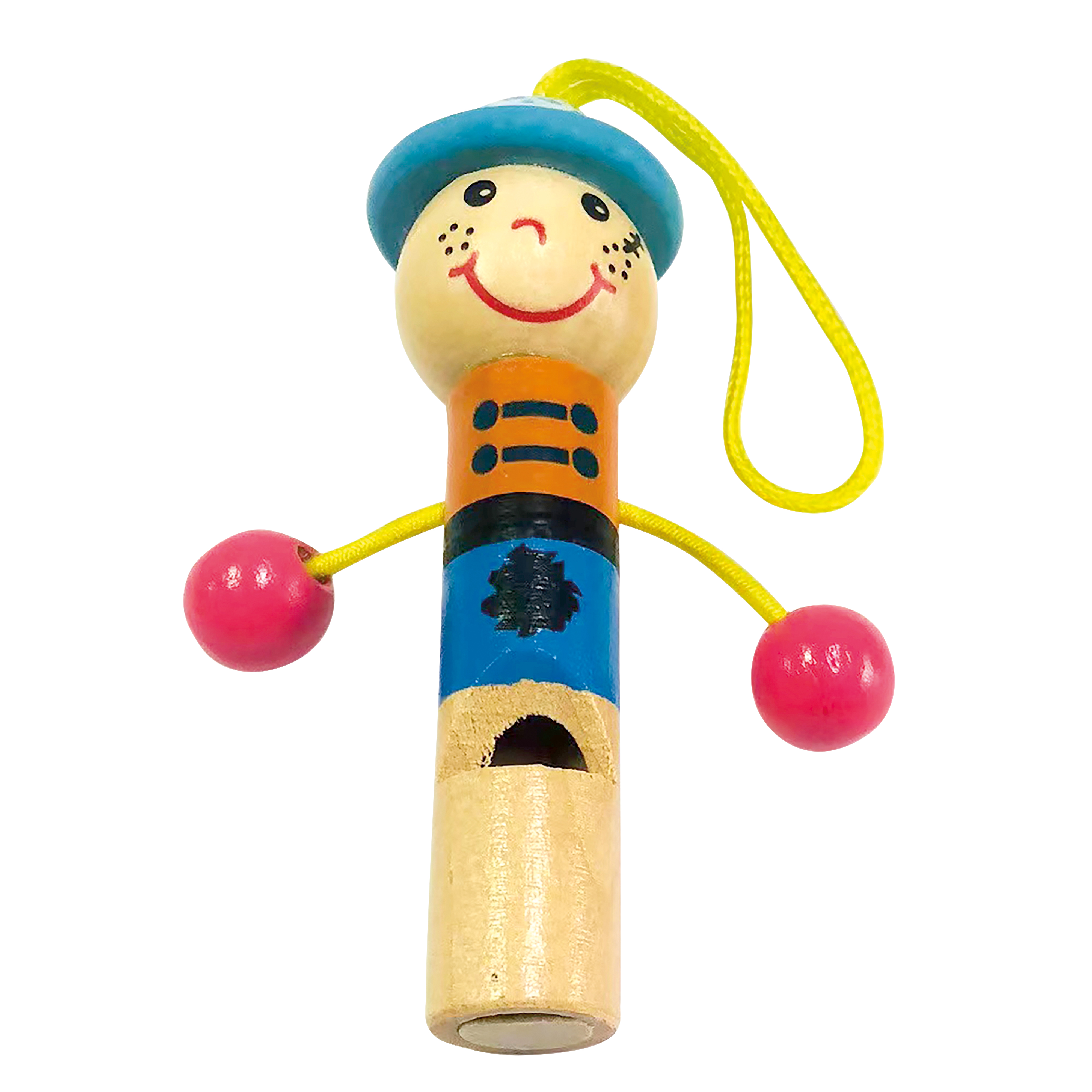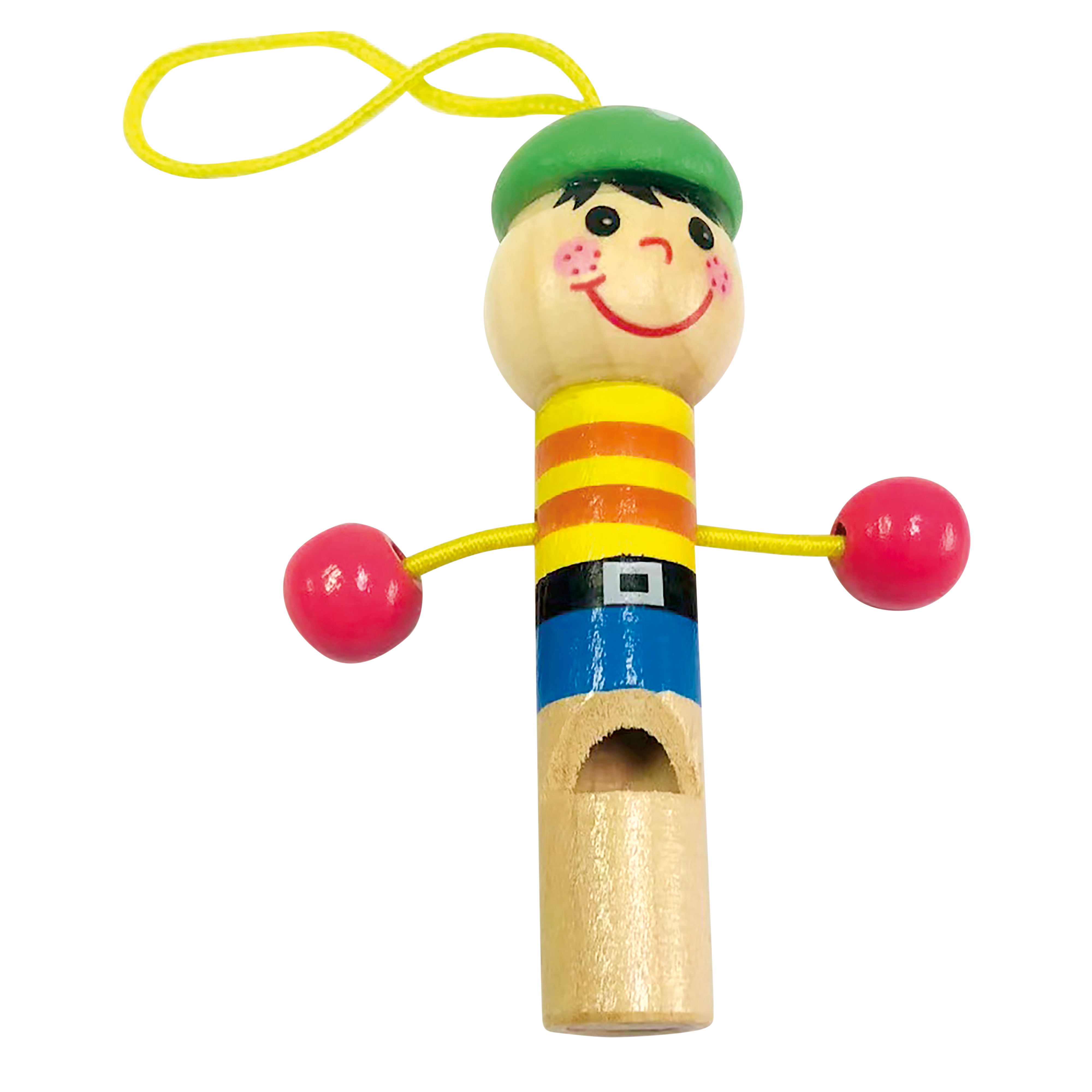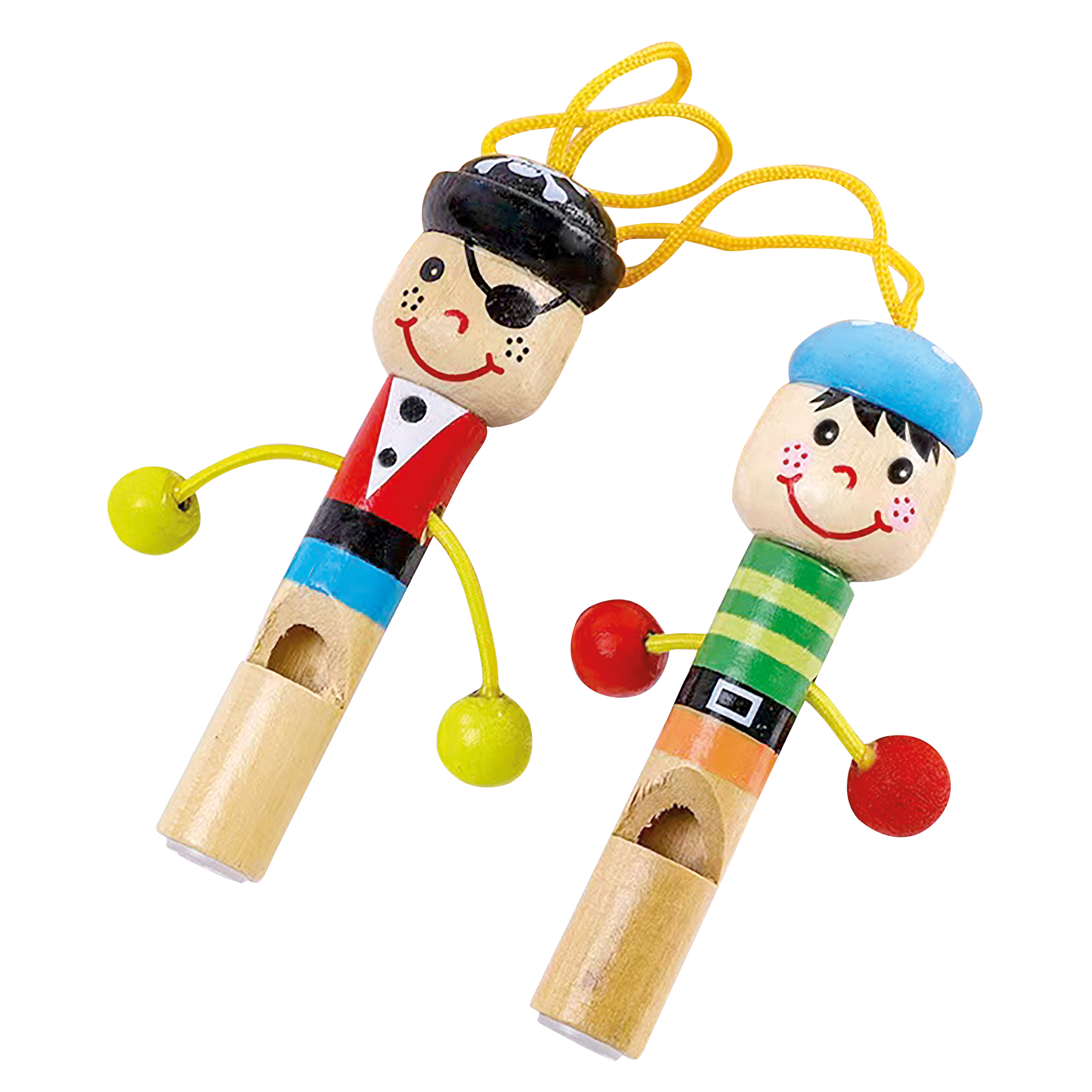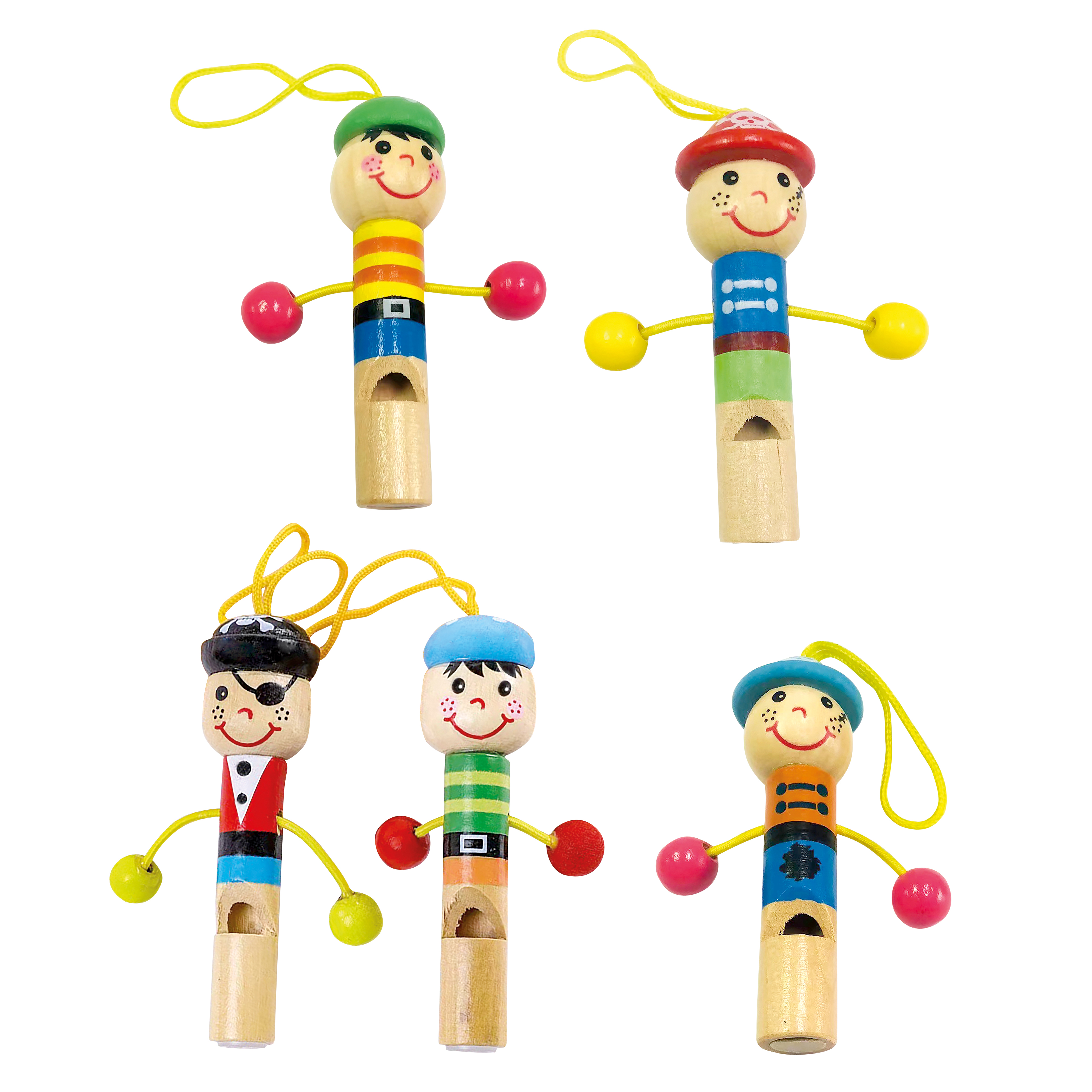 Die bunten Holzpfeifen aus Holz gibt es in fünf verschiedenen Motiven mit jeweils einem praktischen Band zum Aufhängen. Die Pfeifen entwickeln einen schönen lauten Klang, wenn man stark hineinbläst.