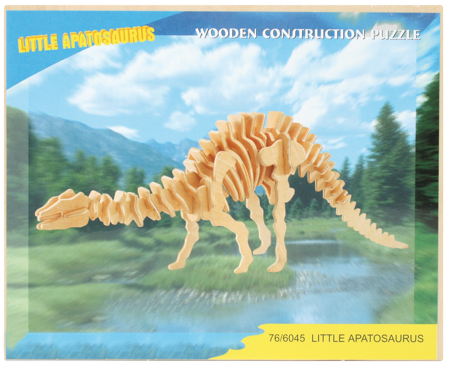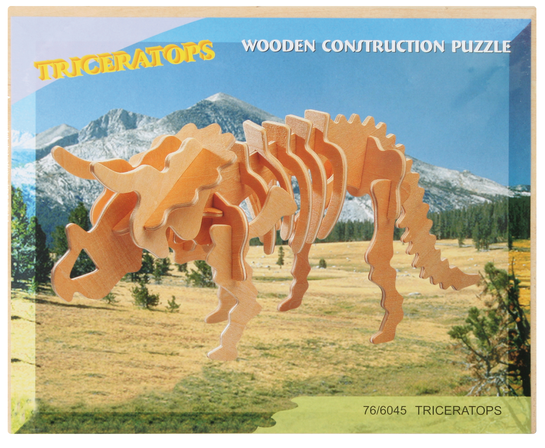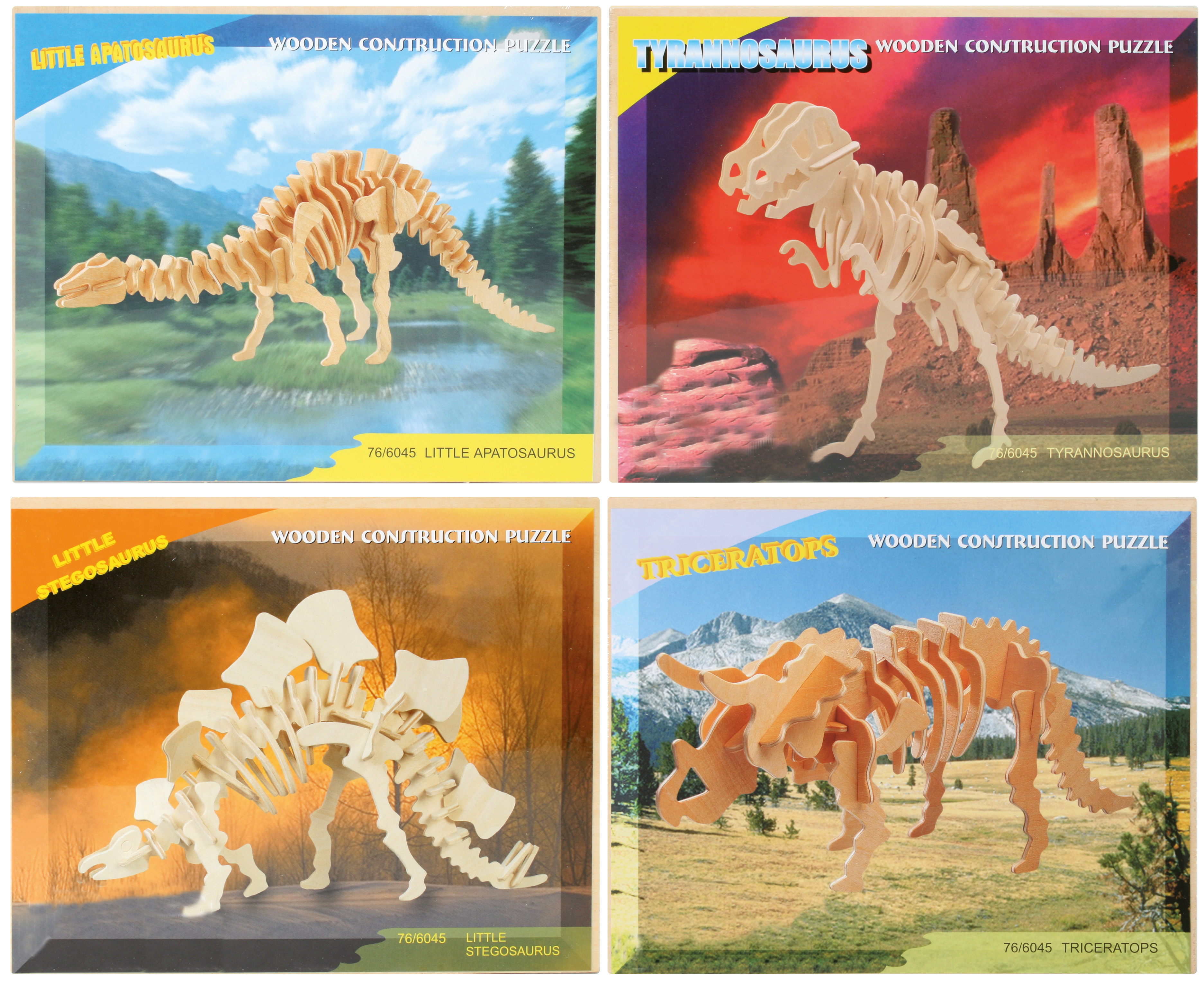 Vier Motive sortiert: kleiner Apatosaurus, Tyrannosaurus, Triceratops, kleiner Stegosaurus. Besonders kniffliges und dekoratives Konstruktions-Puzzle aus Holz für kleine und große Tüftler.
