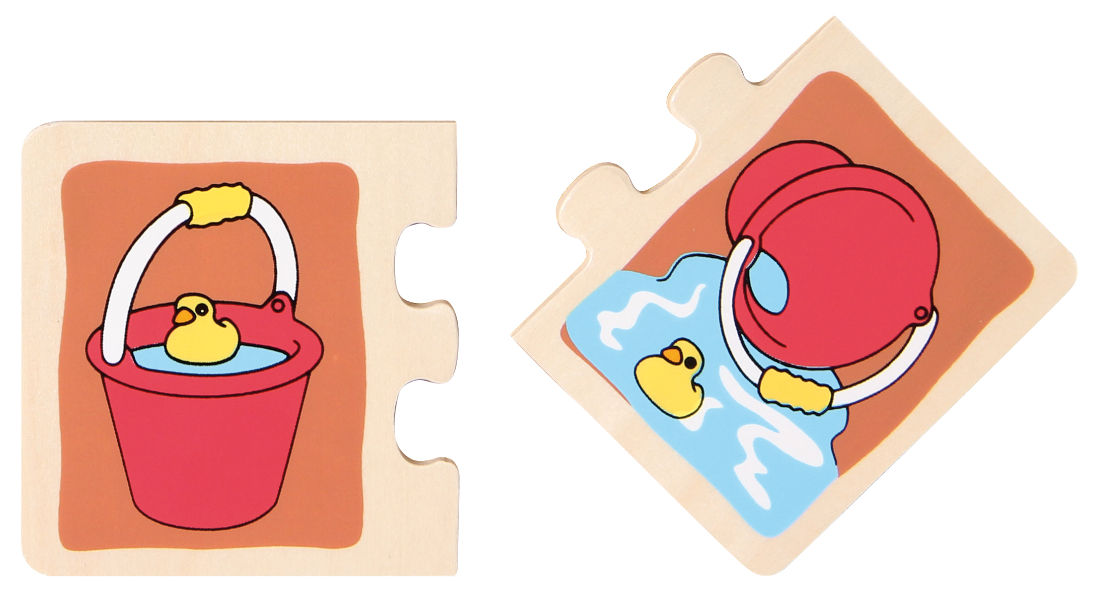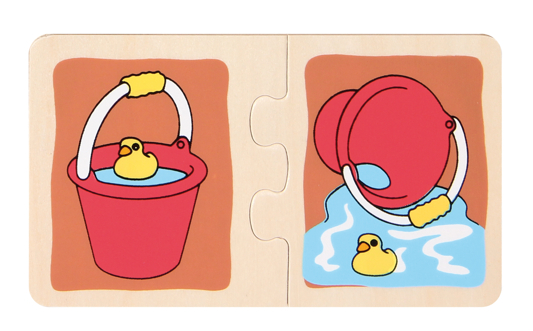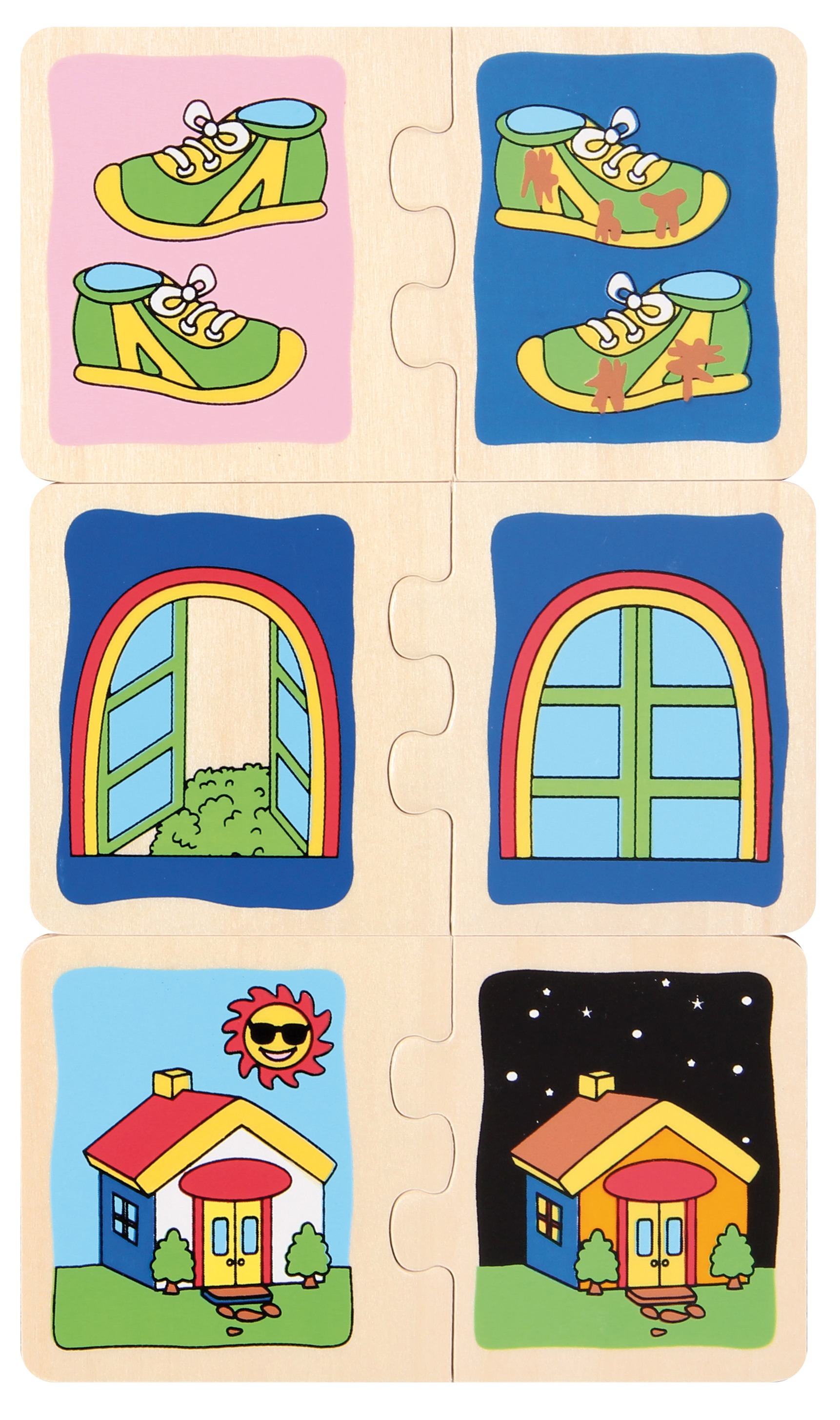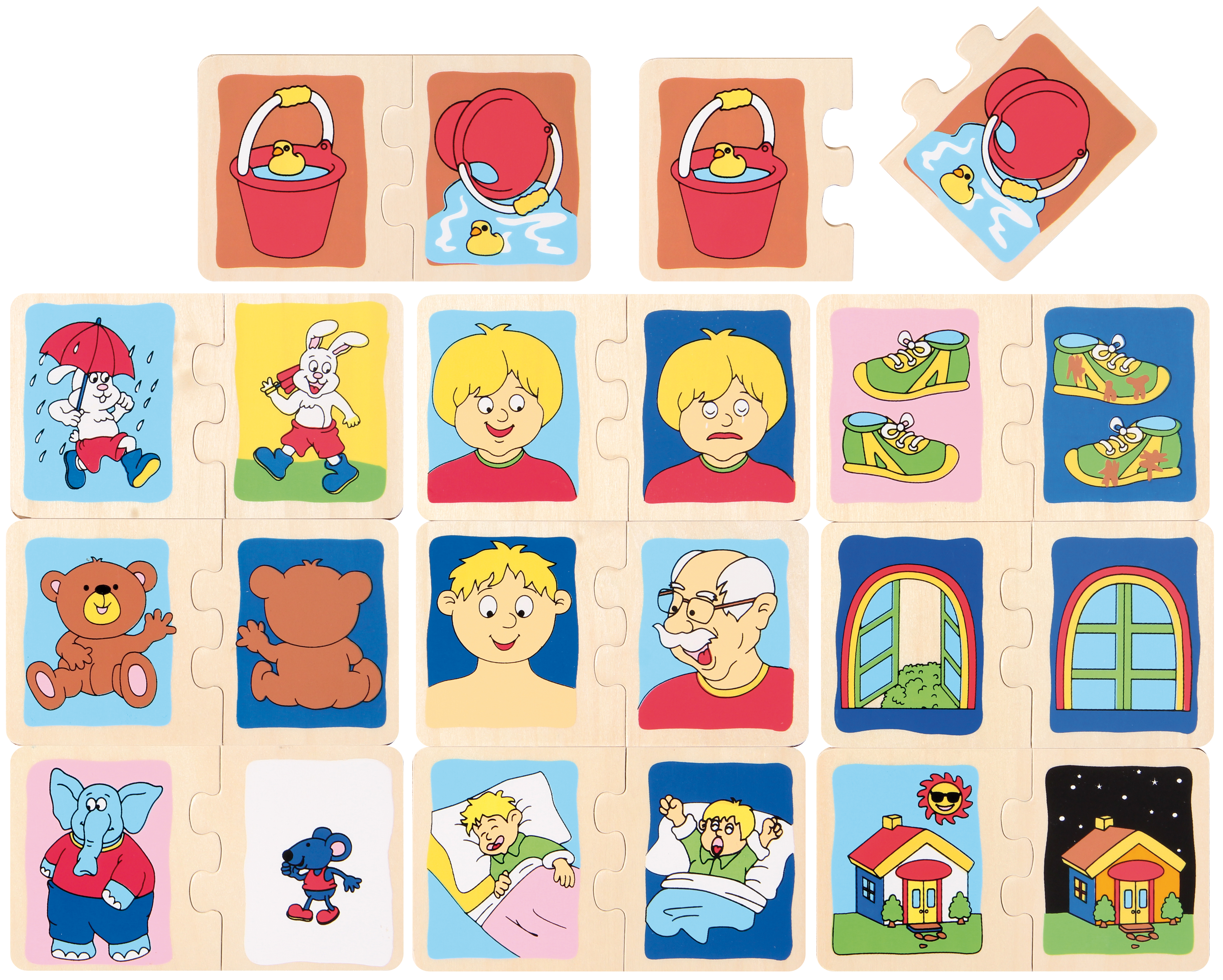 In der stabilen Holzbox befinden sich 20 ca 8 x 8 cm große Puzzleteile aus Holz, die mit kindgerechten Bildern aus dem Alltagsleben bedruckt sind. Die Aufgabe ist, jeweils ein Paar aus zwei gegensätzlichen Bildmotiven zu bilden, zum Beispiel: klein & groß, alt & jung, schmutzig & rein, usw. Macht Spaß und fördert Fantasie und Kombinationsvermögen.