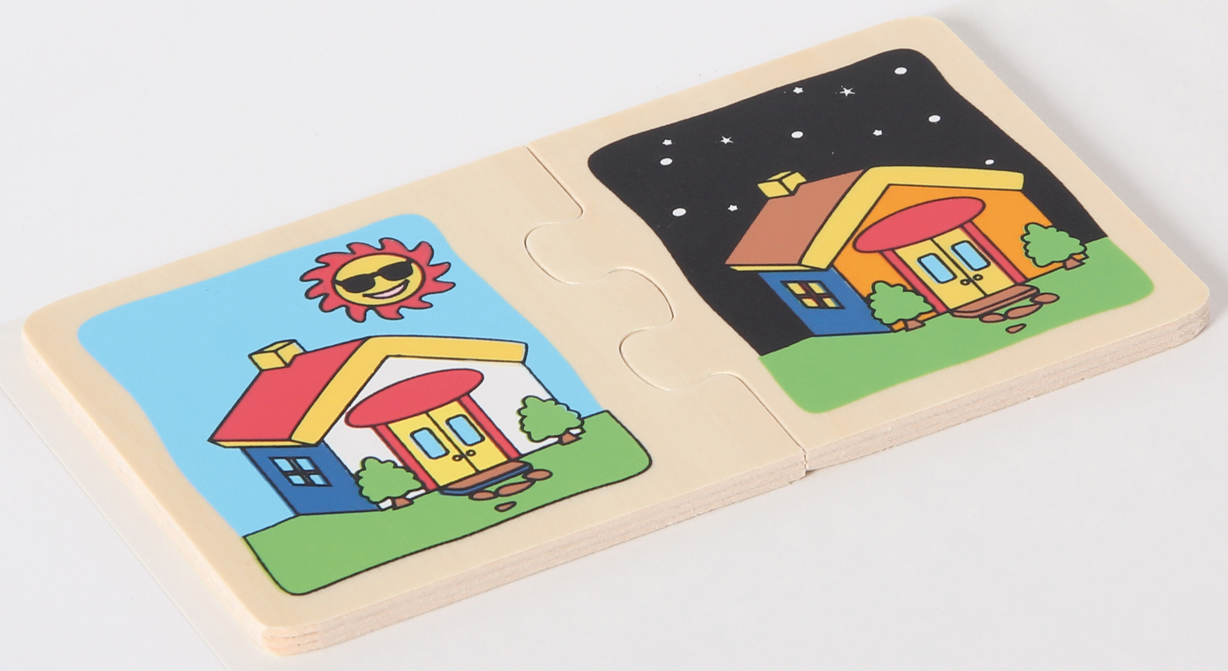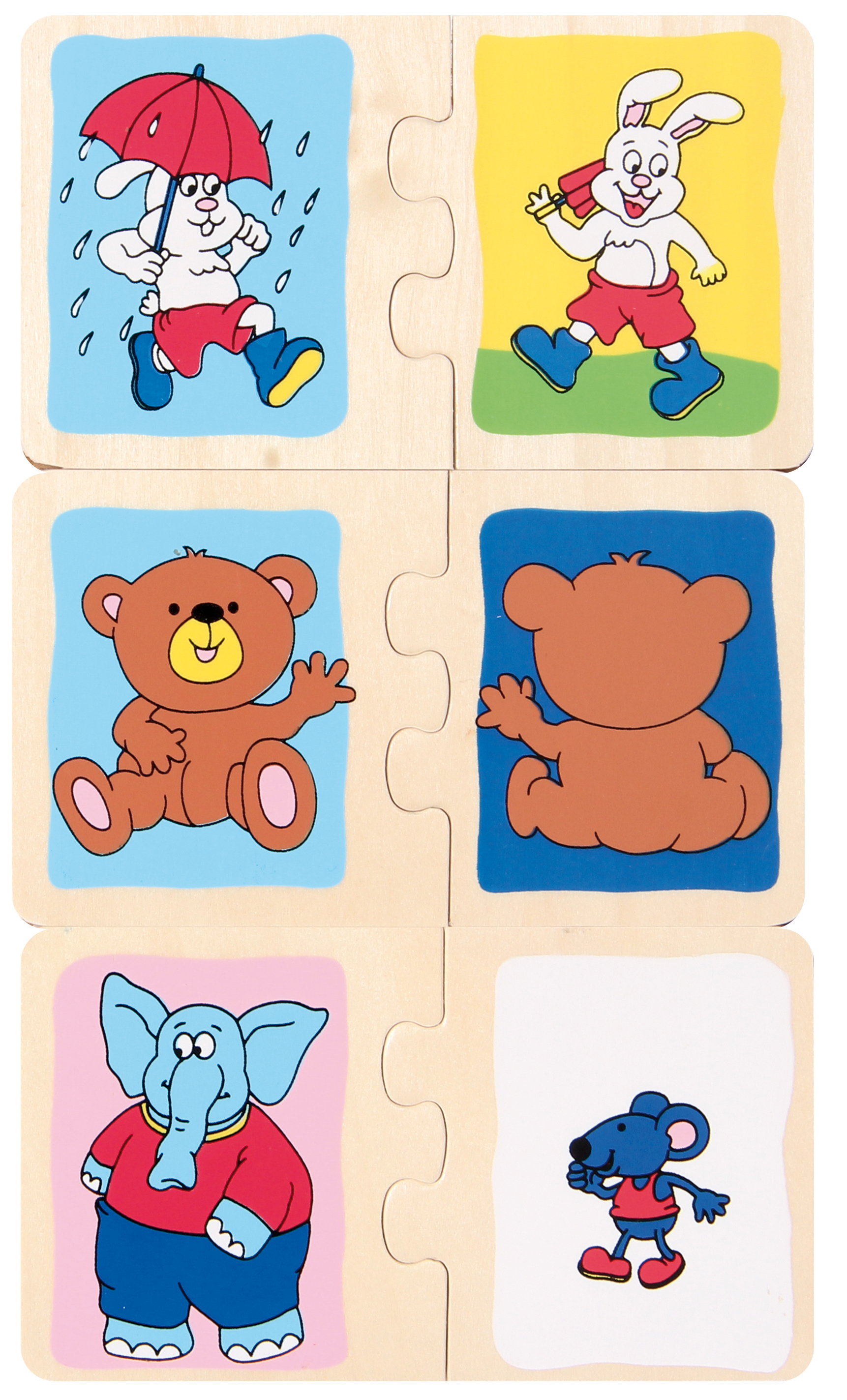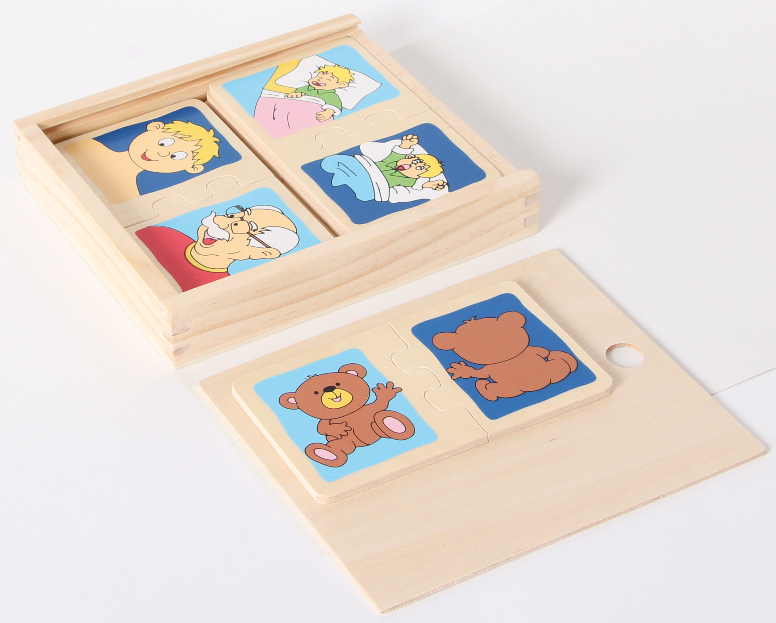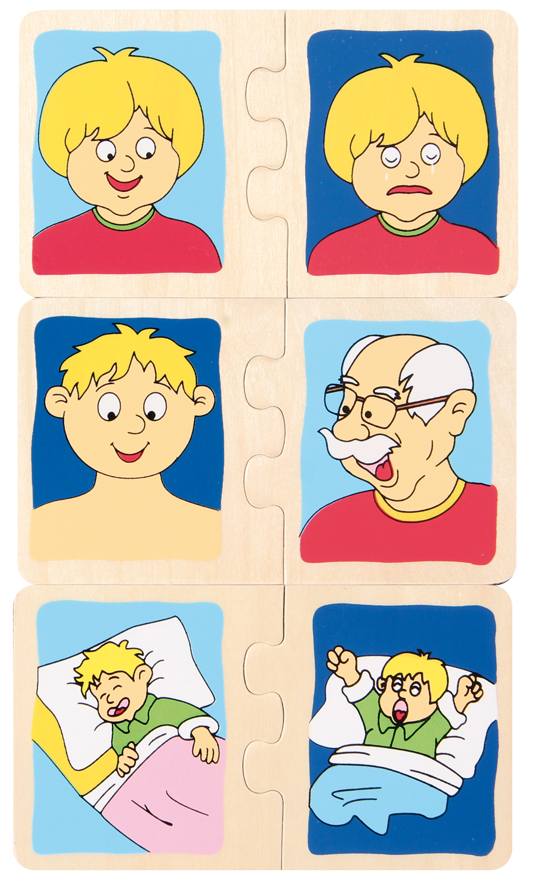 In der stabilen Holzbox befinden sich 20 ca 8 x 8 cm große Puzzleteile aus Holz, die mit kindgerechten Bildern aus dem Alltagsleben bedruckt sind. Die Aufgabe ist, jeweils ein Paar aus zwei gegensätzlichen Bildmotiven zu bilden, zum Beispiel: klein & groß, alt & jung, schmutzig & rein, usw. Macht Spaß und fördert Fantasie und Kombinationsvermögen.