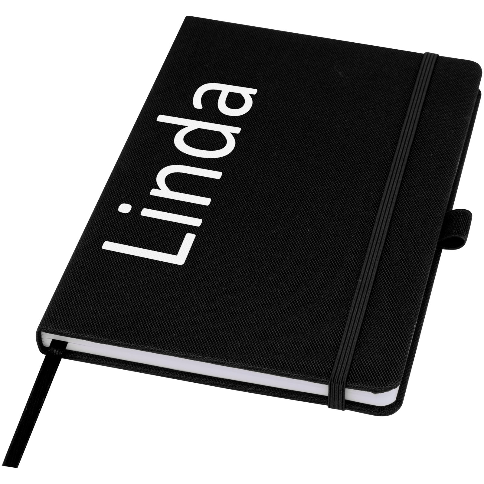 A5 Notizbuch mit einem Cover aus RPET. Mit 80 Blatt, 70 g / m² recyceltem Papier, liniert, und mit Stiftschlaufe und Leseband. Kombinierbar mit dem 107757 Honua RPET-Kugelschreiber.