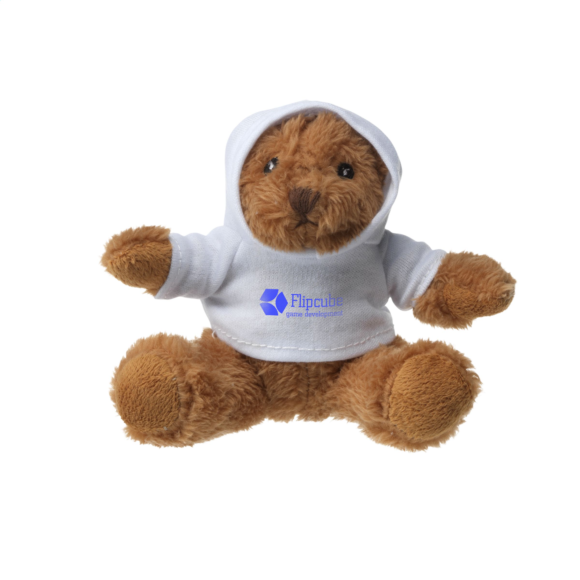 Kleiner Plüschbär mit Kapuzenhemd. Das blaue (30) und das rote (60) Shirt können nur mit Schwarz bedruckt werden. Ohne Druck werden Bären und Shirts lose geliefert.