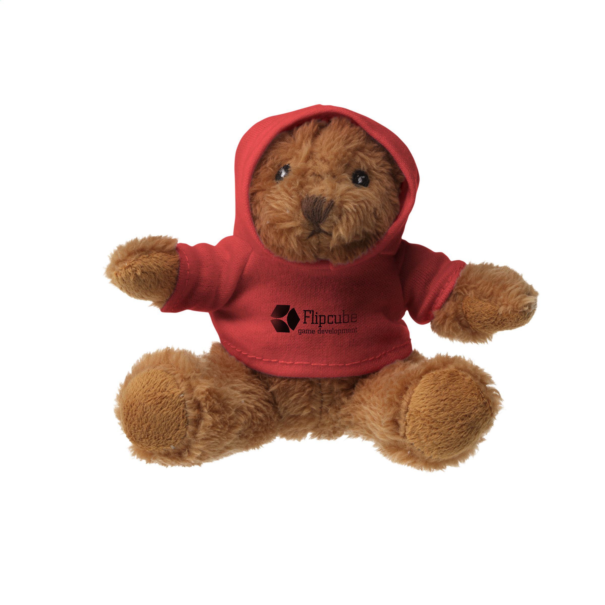 Kleiner Plüschbär mit Kapuzenhemd. Das blaue (30) und das rote (60) Shirt können nur mit Schwarz bedruckt werden. Ohne Druck werden Bären und Shirts lose geliefert.