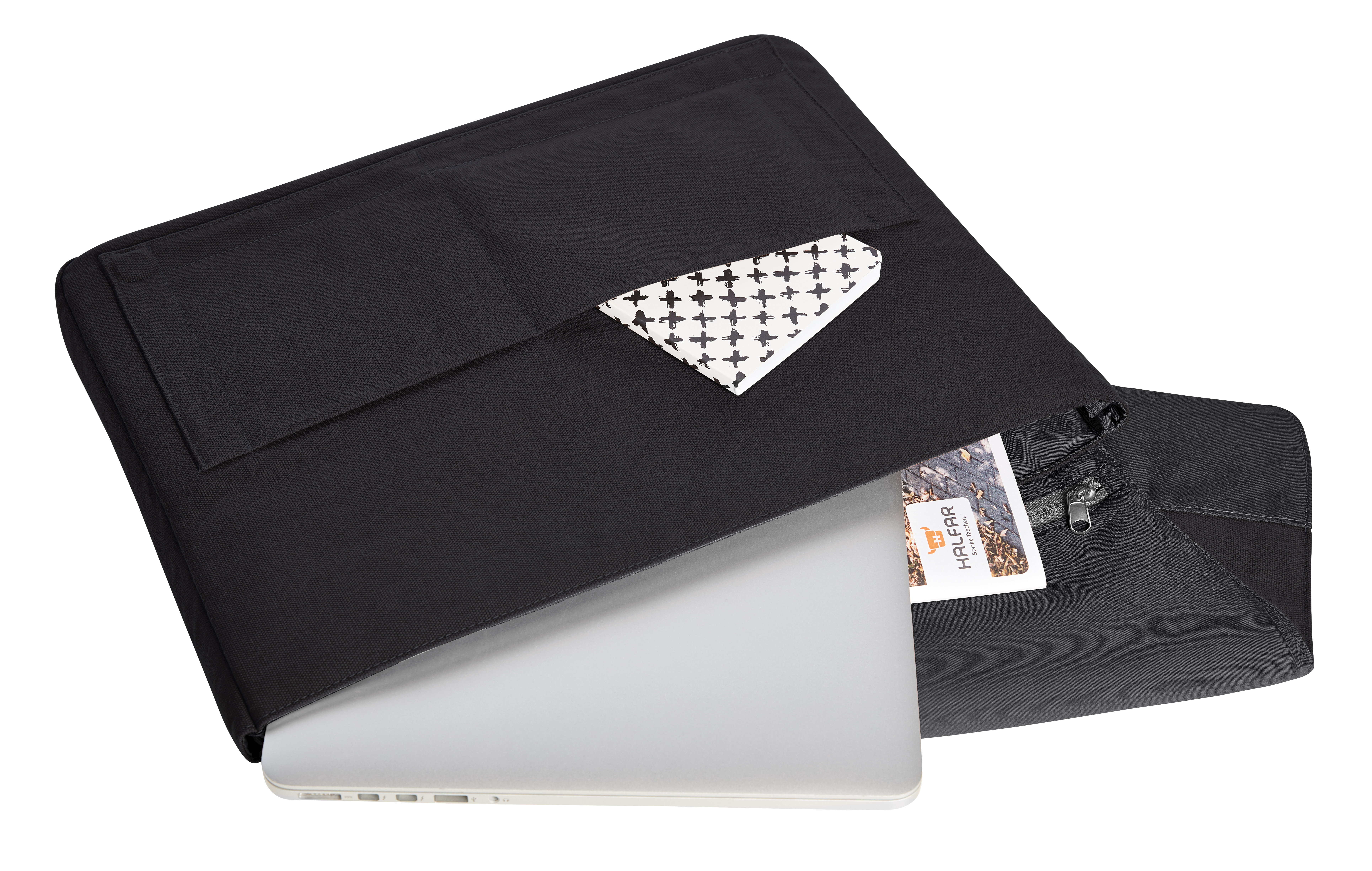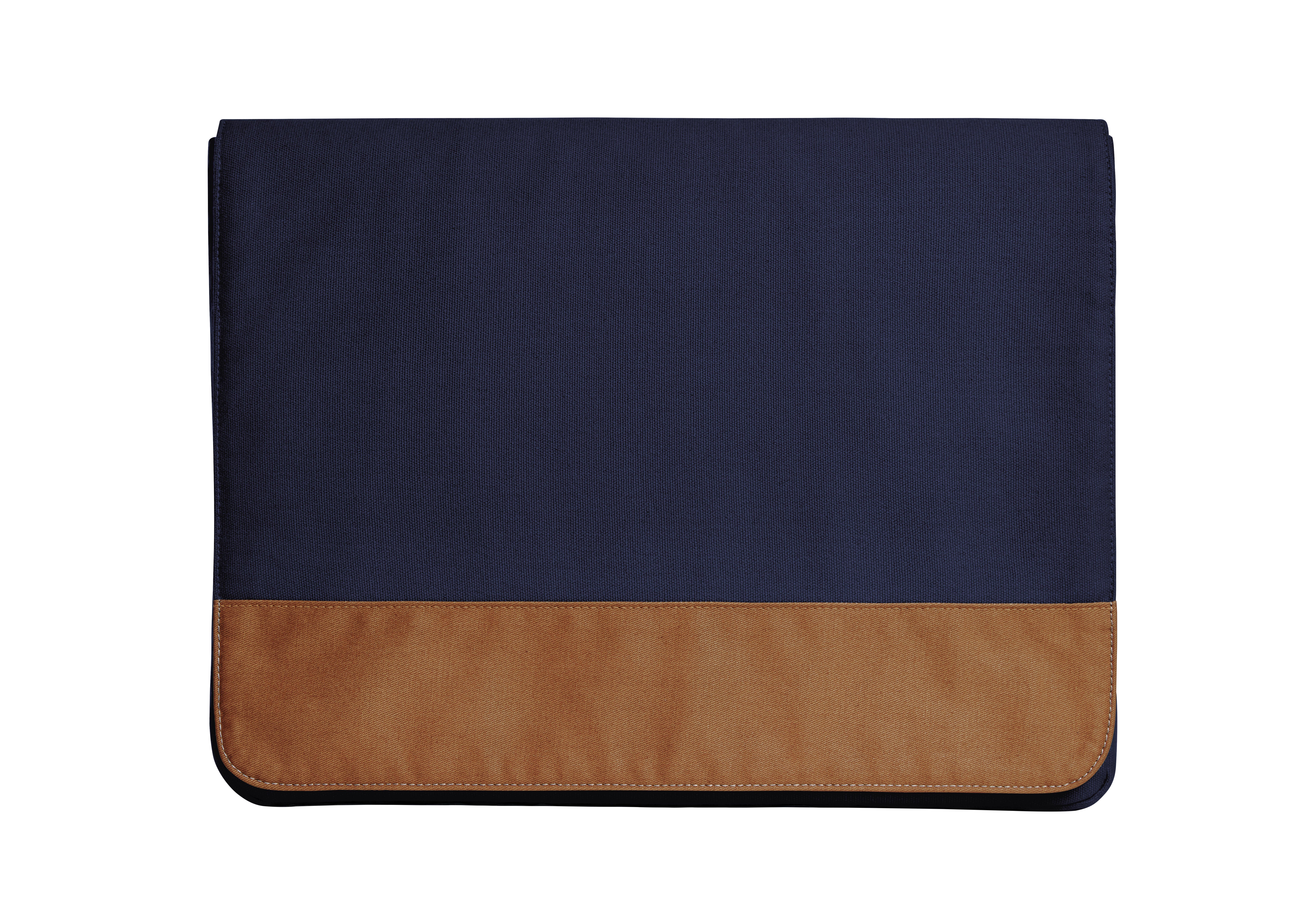Moderne, aufwändig verarbeitete Notebook-Hülle; liebevoll gestaltet mit beschichtetem Baumwoll-Besatz; geeignet für Notebook und DIN A4-Unterlagen; zwei flache Einsteckfächer auf der Front; Reißverschluss-Fach im Überschlag innen; großes Reißverschluss-Fach rückseitig; Magnet-Verschluss