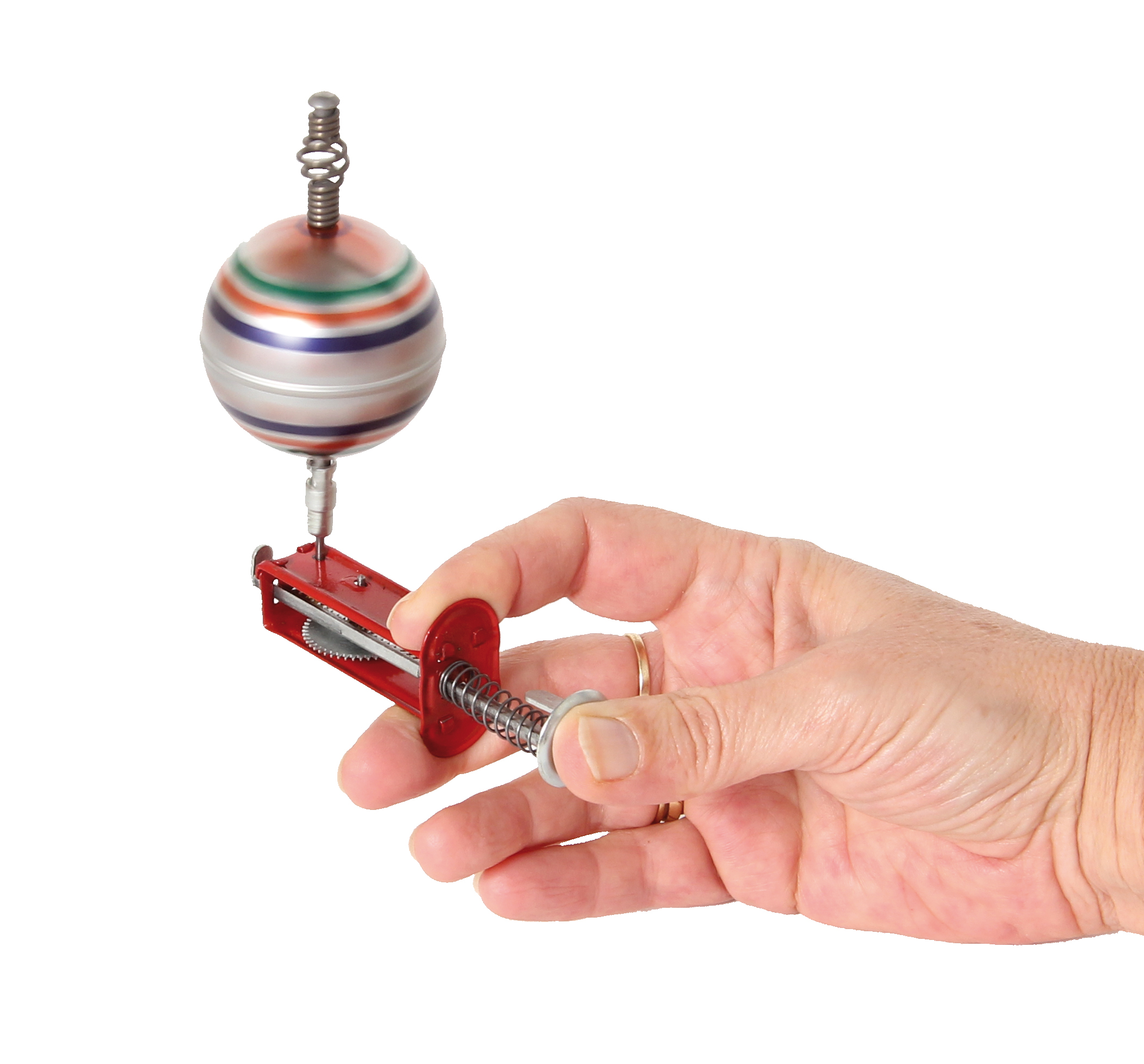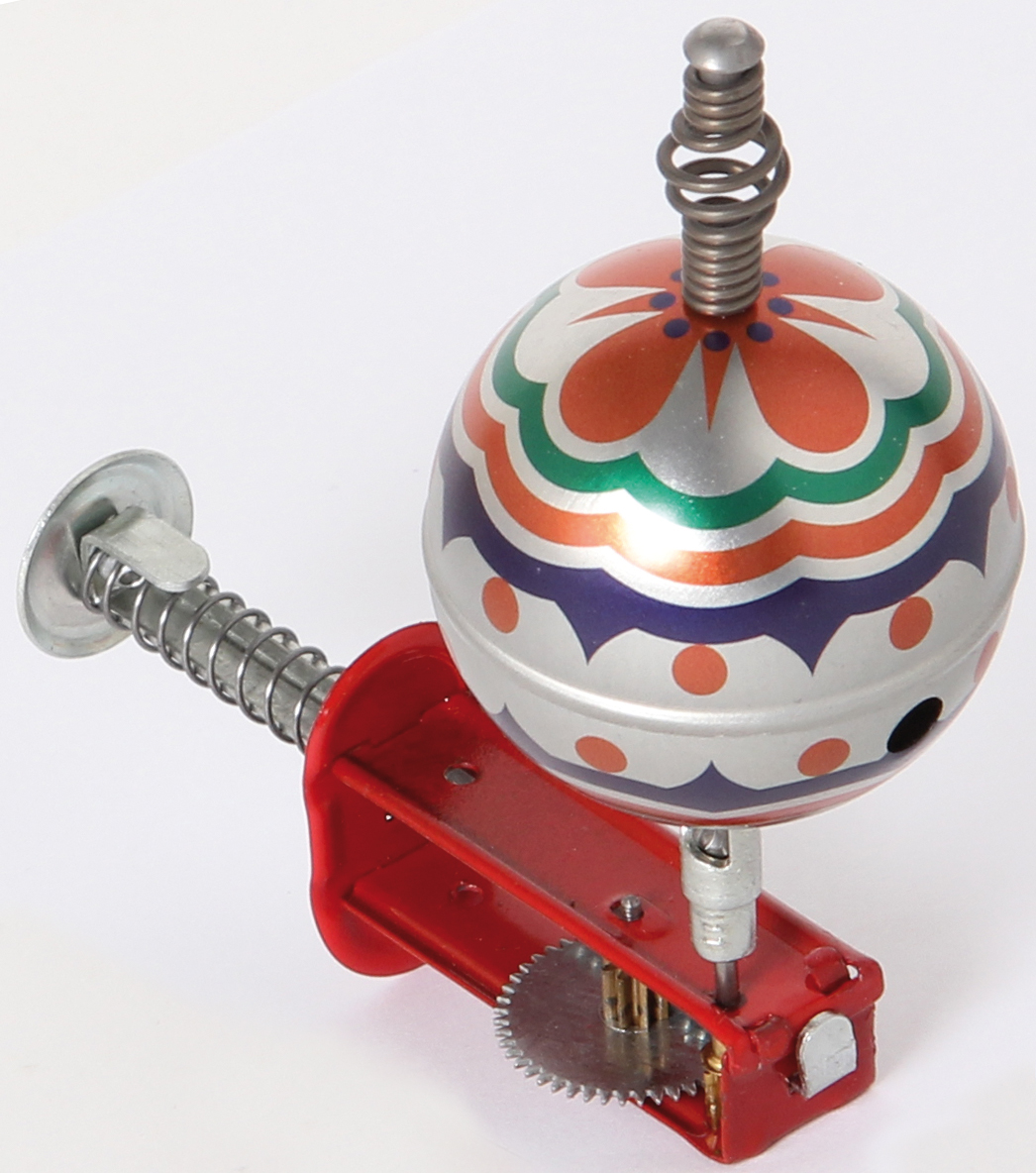 Mit dem beiliegenden Starter losgelassen, hüpft und singt der Blechkreisel munter vor sich her.