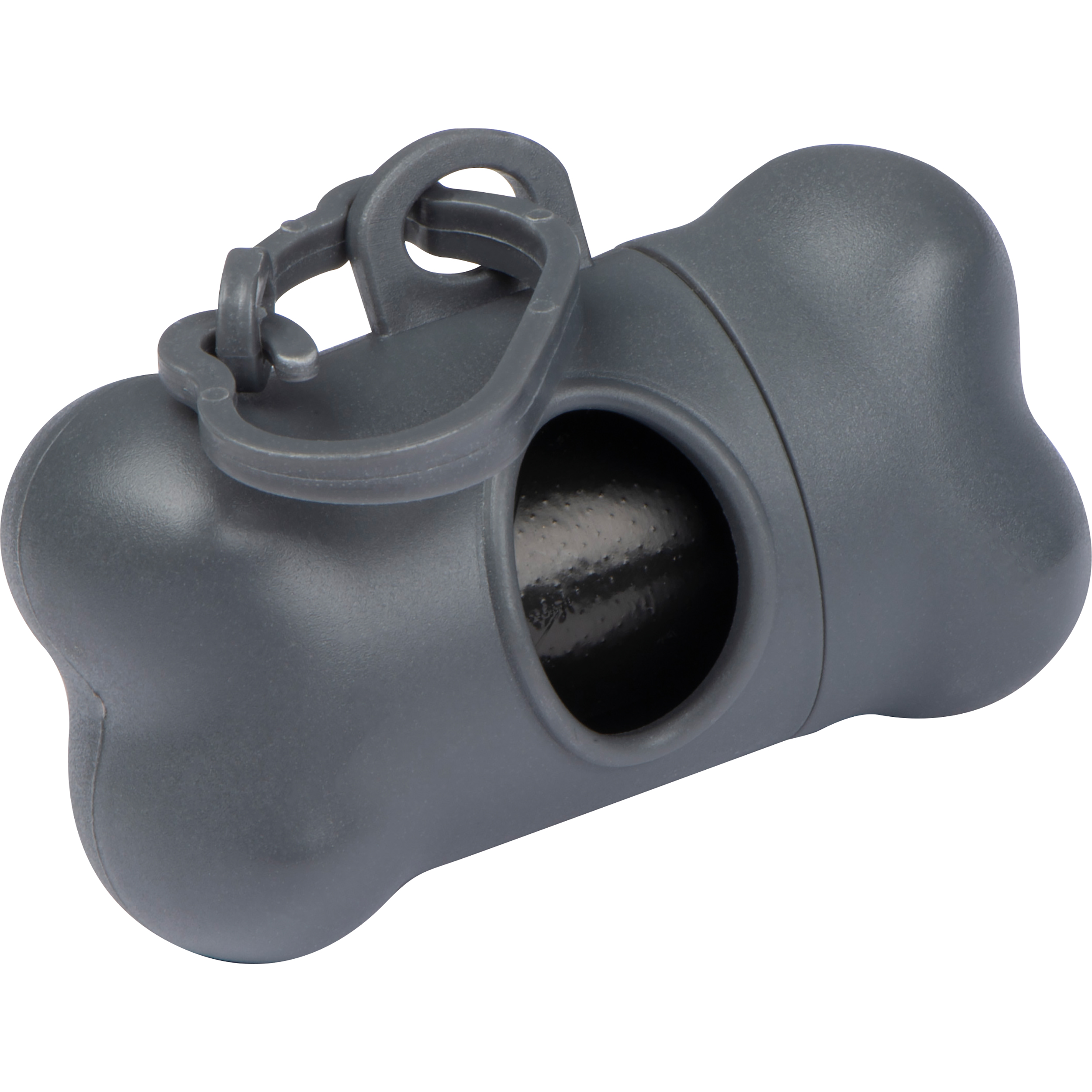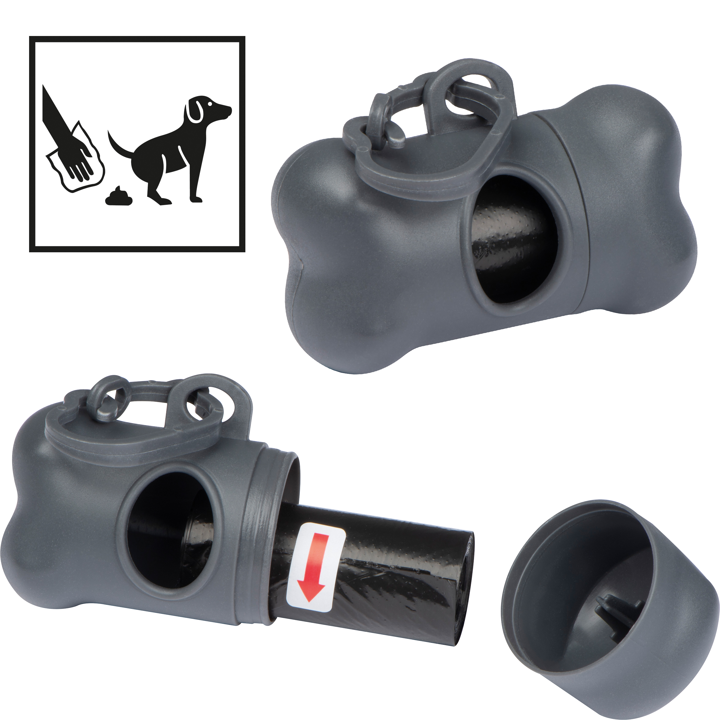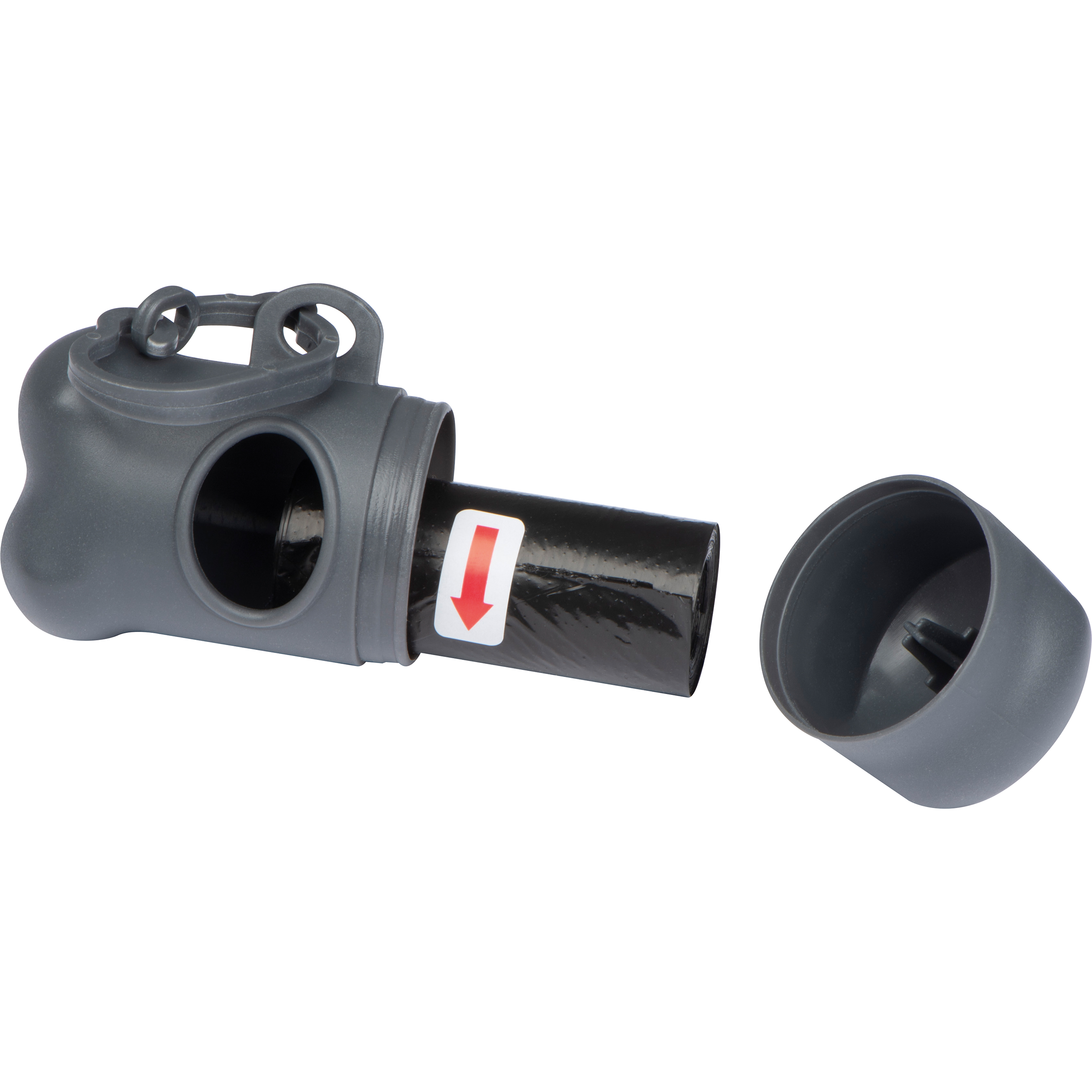 Aufschraubbarer Hundekotbeutelspender in der Form eines Knochens mit Karabinerhaken aus Kunststoff und 15 biologisch abbaubaren Beuteln. Ihre Werbung wird auf das Gehäuse gedruckt.