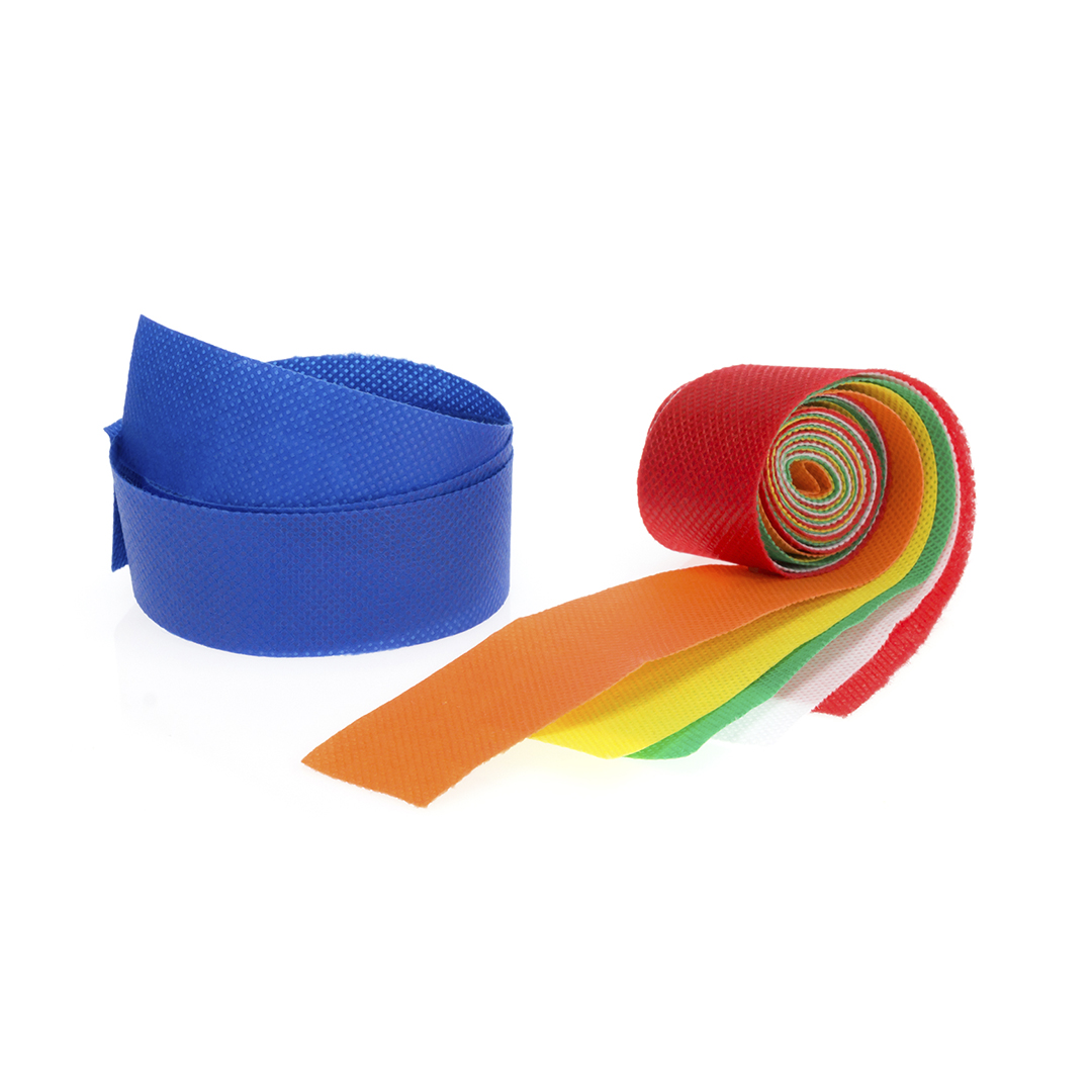 Hutband aus Vliesstoff in verschiedenen Farben. Geliefert in kompletten Rollen von 250 m Länge, mit ca. 350 Bändern von 67 x 3,2 cm.