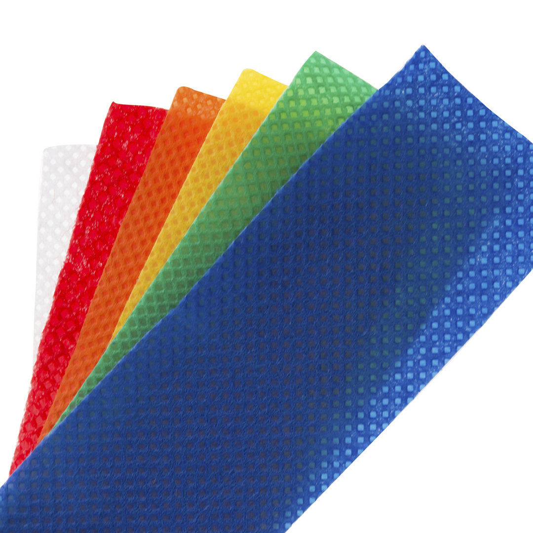 Hutband aus Vliesstoff in verschiedenen Farben. Geliefert in kompletten Rollen von 250 m Länge, mit ca. 350 Bändern von 67 x 3,2 cm.