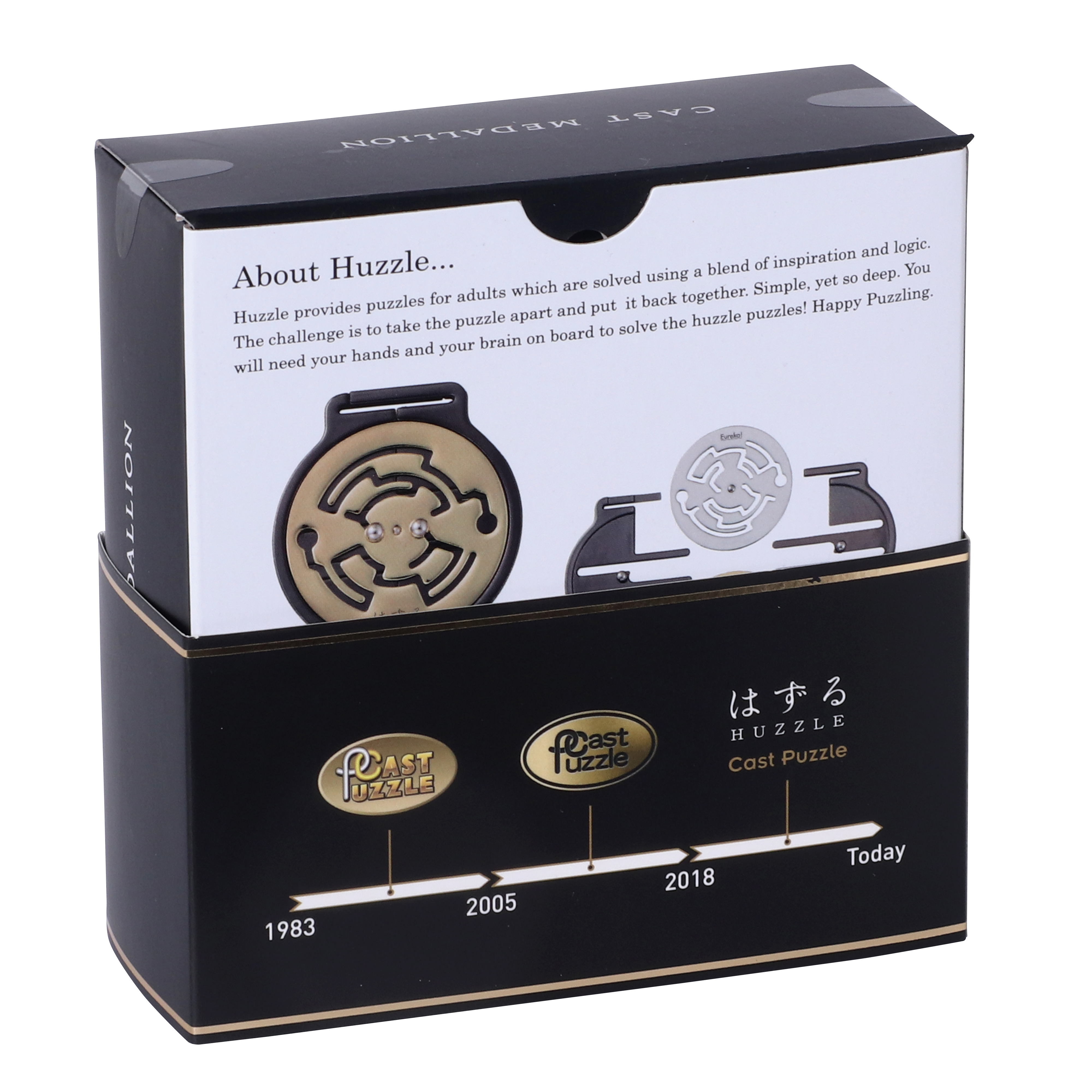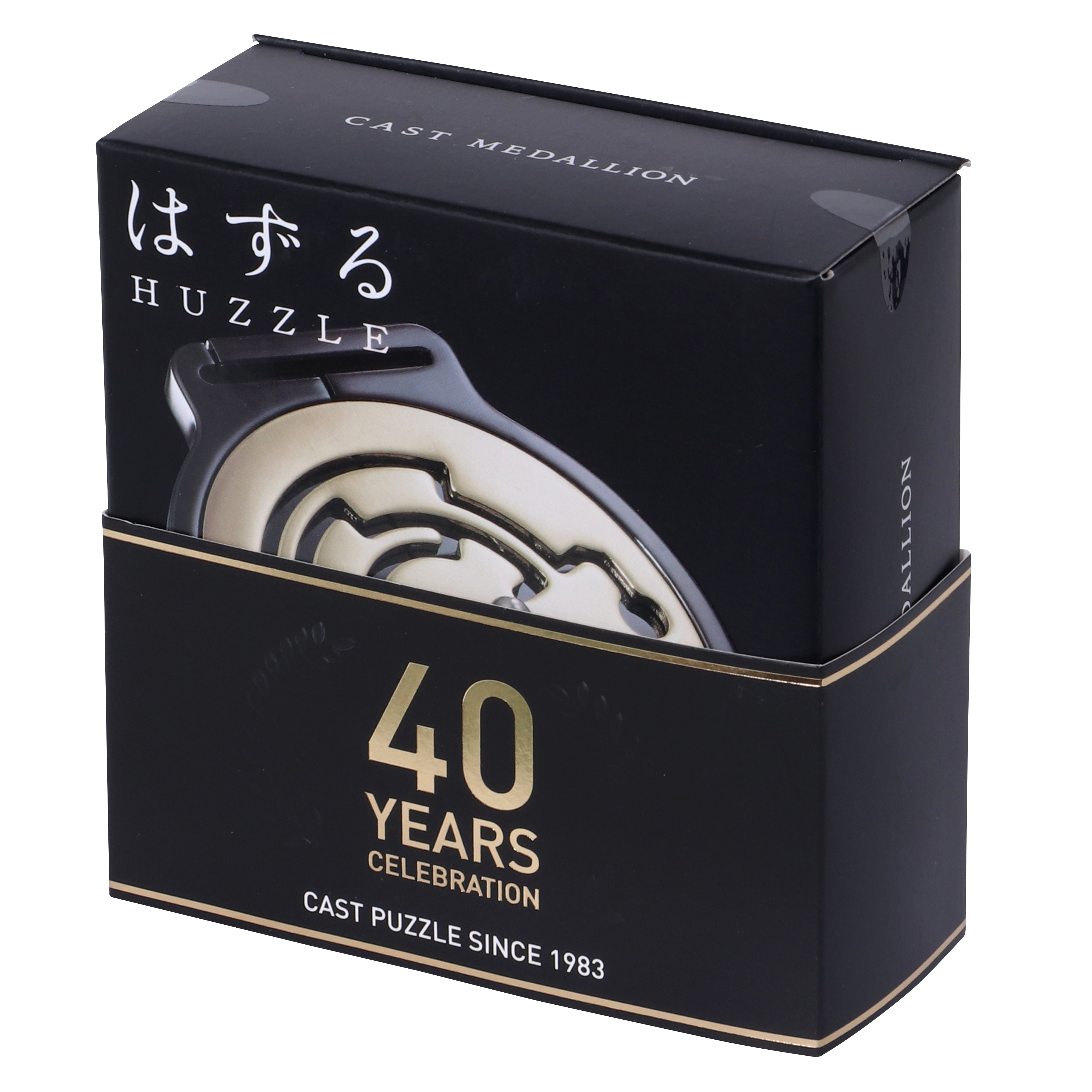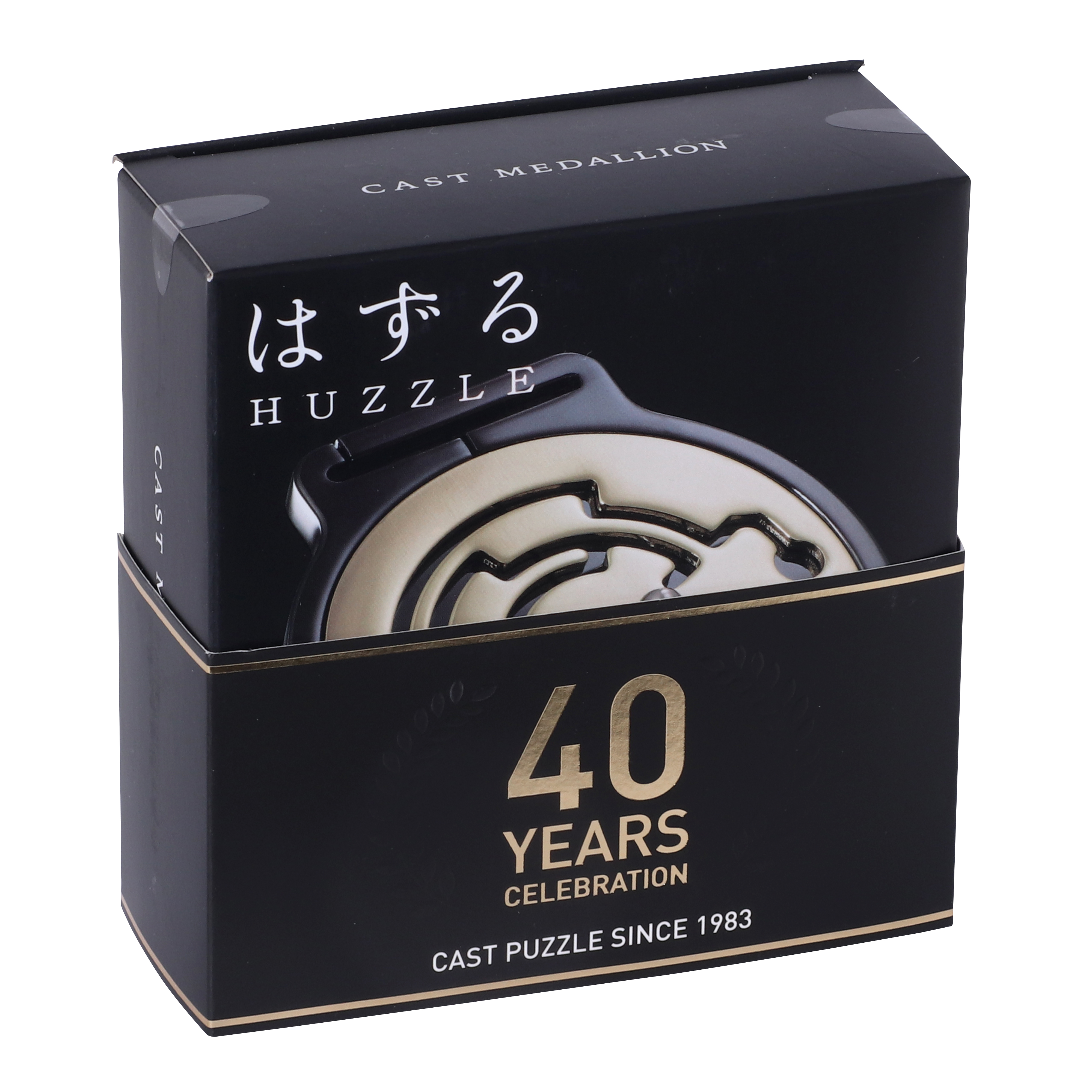 Aufgabe der verzwickten Metallpuzzles ist es, die Teile voneinander zu lösen und wieder zusammen zufügen. Der Name setzt sich zusammen aus 'HUZZLE' von 'to hug and nuzzle' (= umarmen und liebhaben) und 'to cast' (= Metall gießen). Die Puzzles werden aus Gießzink gegossen. Schwierigkeitsgrad 5 Sterne. Extra große Variante zum 40-jährigen Bestehen der Huzzle-Puzzles.