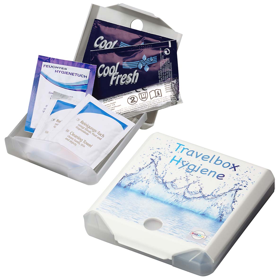 Quadratische, praktische Box aus Kunststoff mit Klickverschluss, der sich auch ganz leicht mit einer Hand öffnen lässt. Inhalt: 1 Hygienetuch, 1 Paar Einweghandschuhe, 2 Reinigungstücher und 2 Erfrischungstücher.