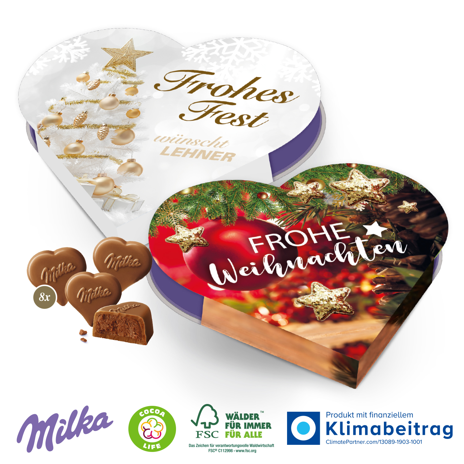 1 I LOVE MILKA-Herz (44 g) mit acht Milka Pralinés, gefüllt mit feiner Haselnusscrème.