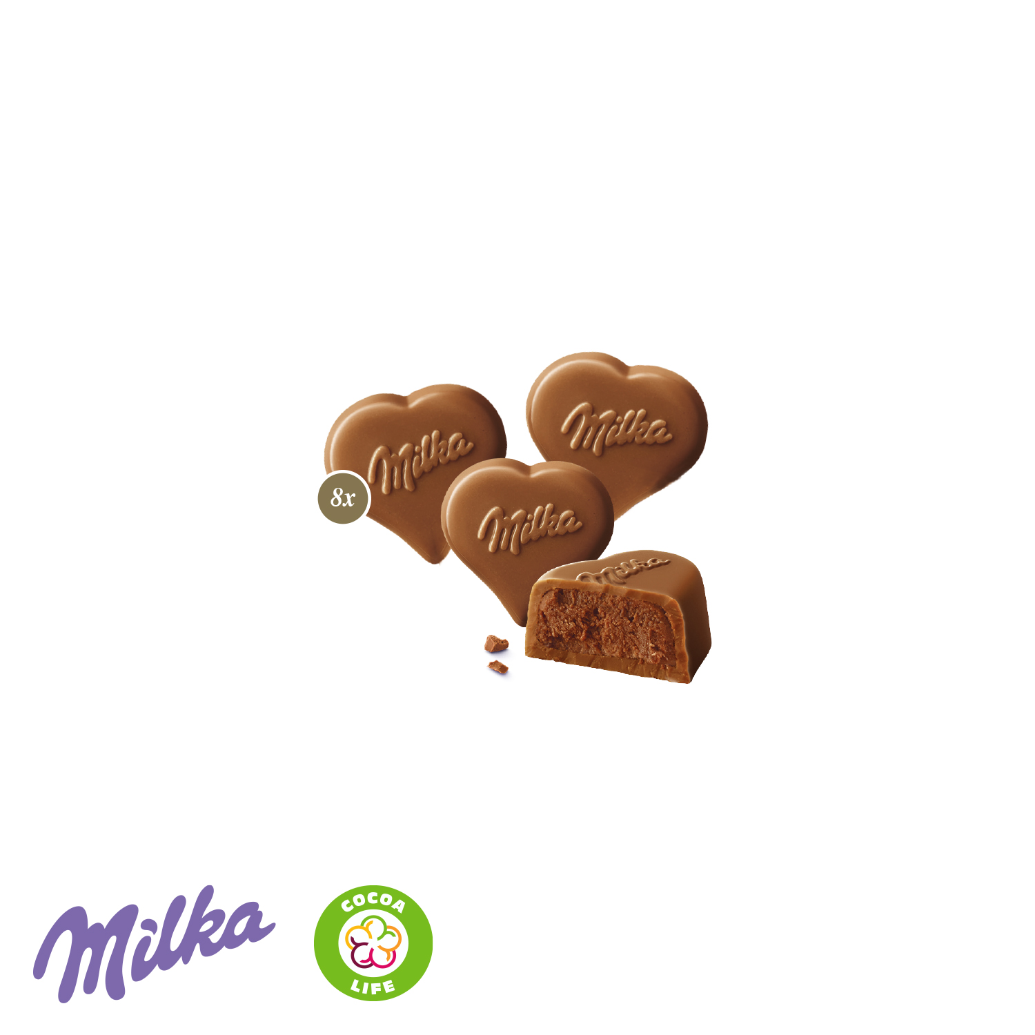 Für die kleine Geste zwischendurch! I LOVE MILKA-Herz mit acht herzförmigen Milka Pralinés, gefüllt mit feiner Haselnusscréme, umhüllt von zartschmelzender Milka Alpenmilchschokolade.