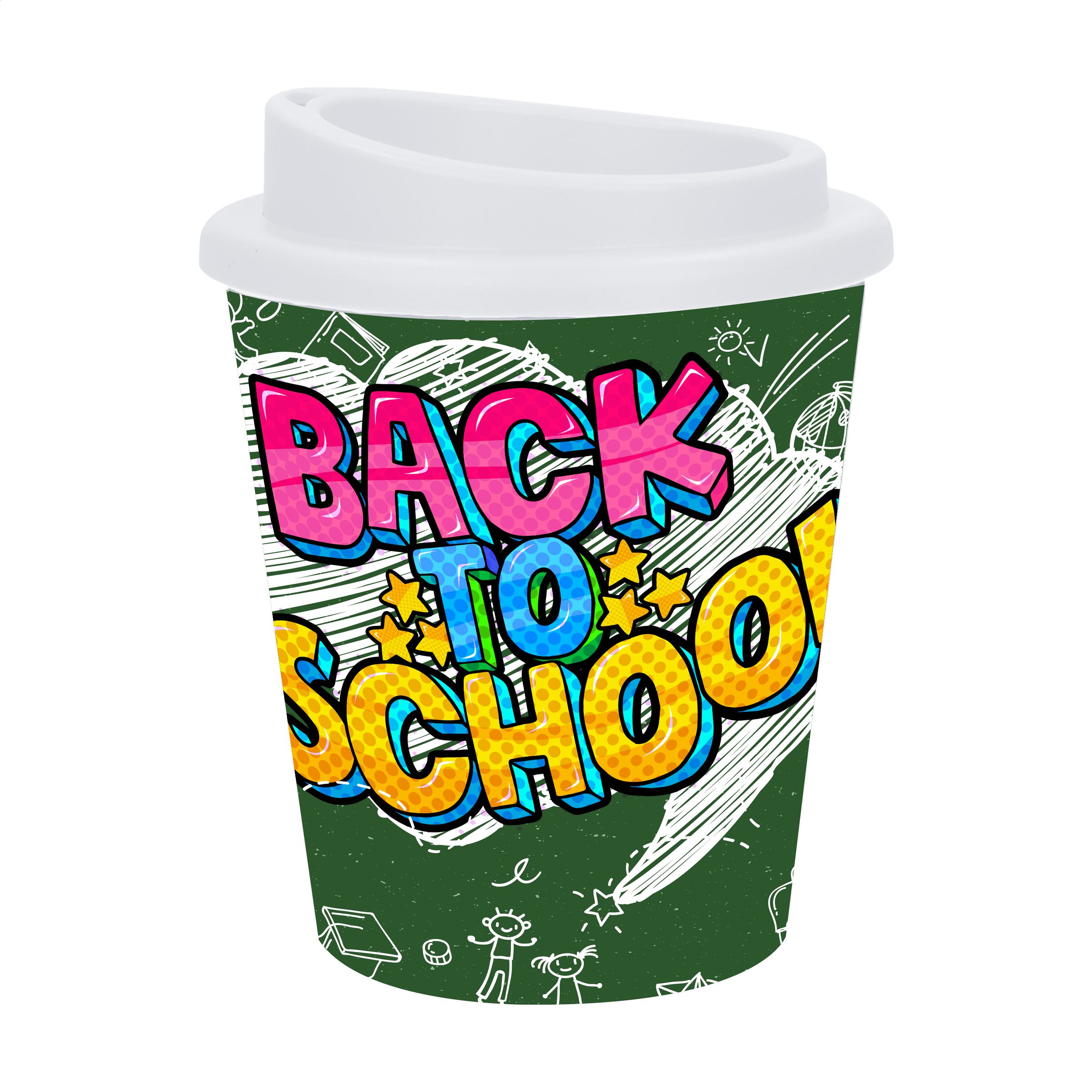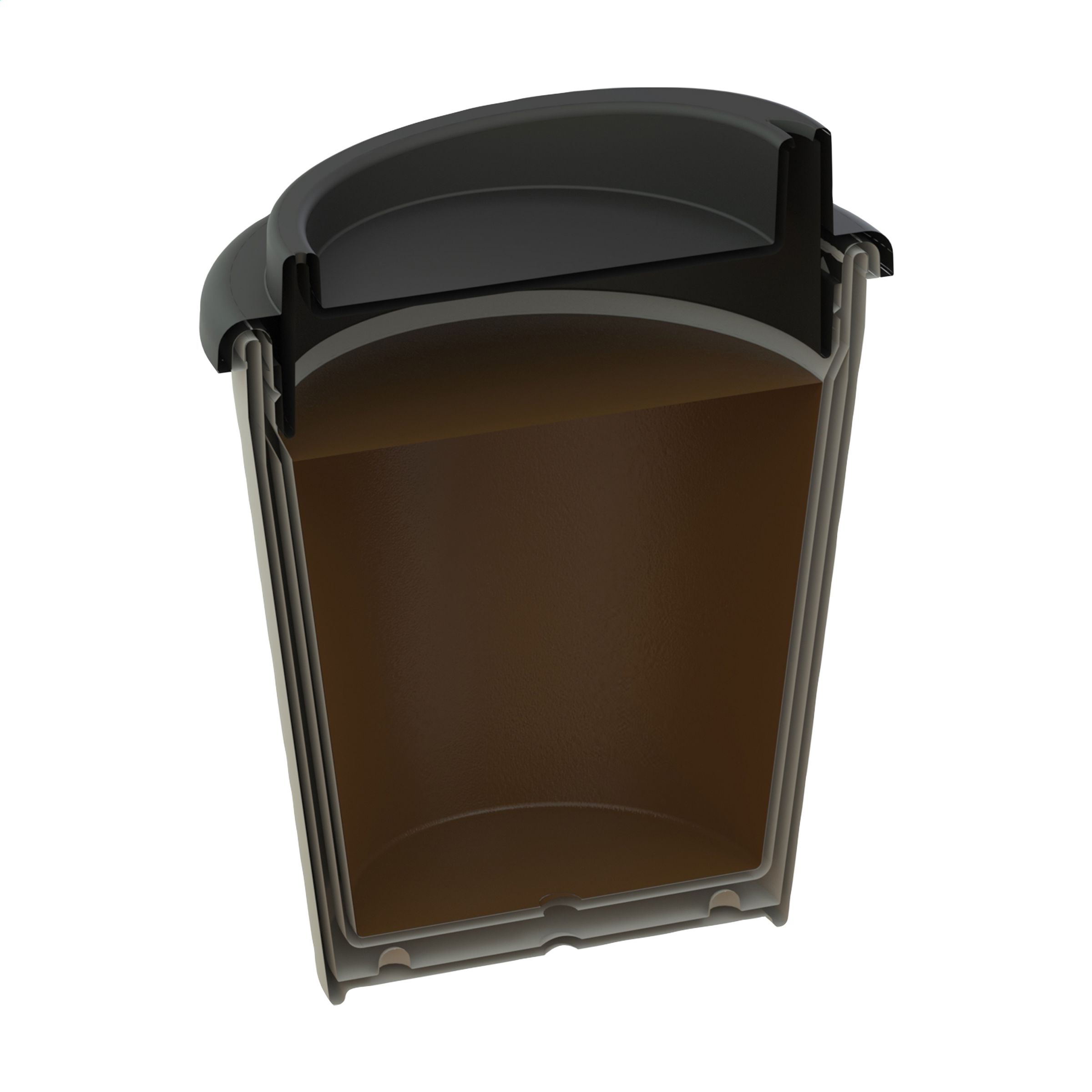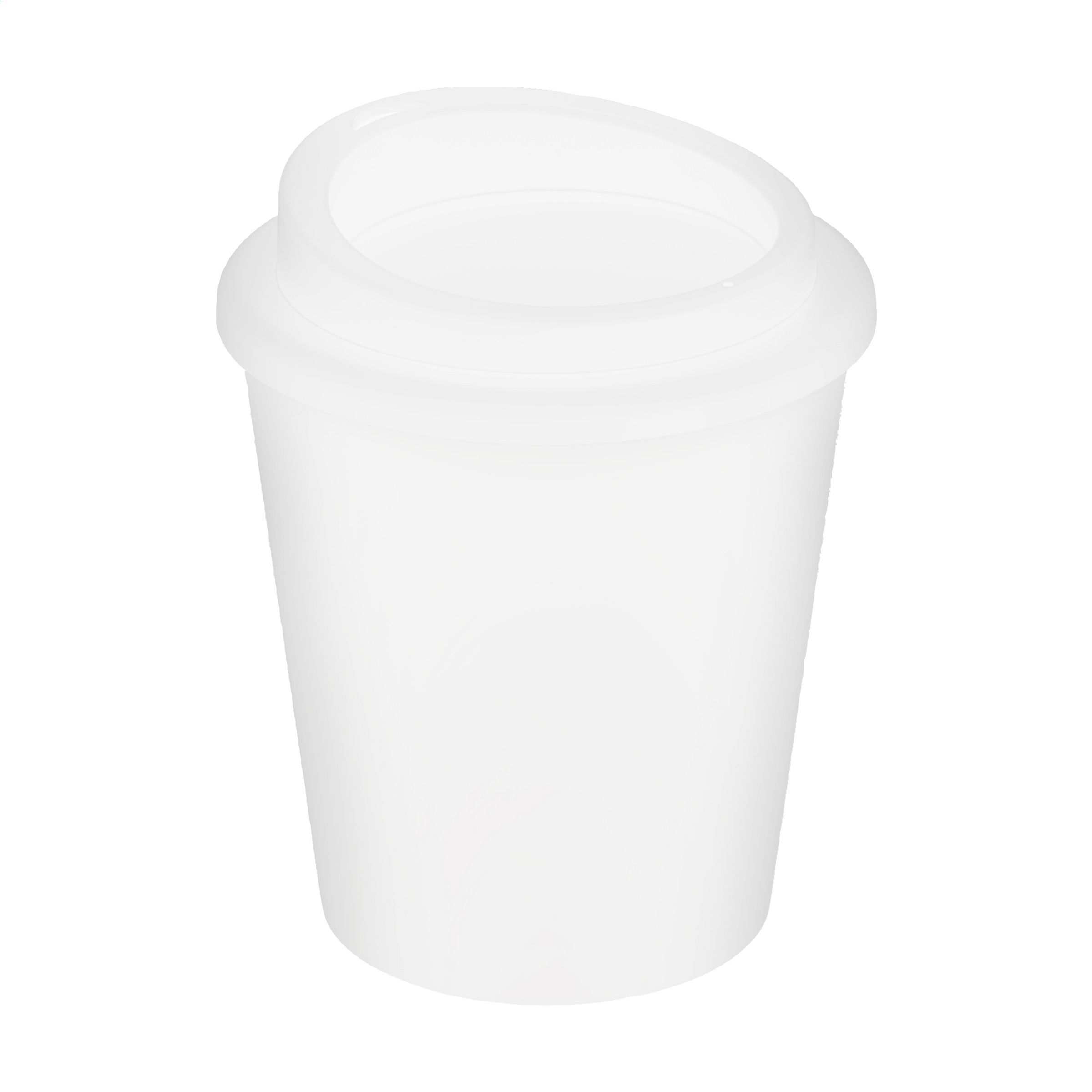 Doppelwandiger Coffee-To-Go-Becher aus Kunststoff. Praktisches Modell mit Schraubdeckel, ausgestattet mit Trinköffnung. Passt in den Standard-Trinkbehälter von Autos, was praktisch für unterwegs ist. Wiederverwendbar, geeignet für Levensmittel und spülmaschinengeeignet. Fassungsvermögen 250 ml. Hergestellt in Deutschland. Die Oberfläche eignet sich ideal für den iMould-Vierfarben-Aufdruck (wasser-, kratz-, farb- und UV-beständig) in jedem gewünschten Design. Mindestbestellmenge pro Farbe 500 Stück.