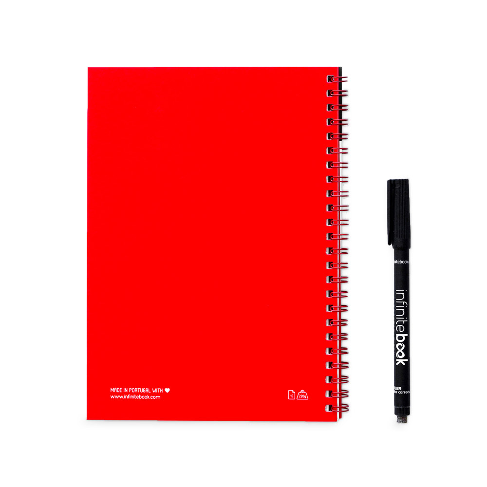 A5 Notizbuch - "Infinitebook" - mit flexiblem Einband und farblich passenden Ringen. Enthält 15 unlinierte Seiten im Whiteboard-Stil und einen schwarzen Marker. Dieser Notizblock ermöglicht einfaches Schreiben und Radieren und ist eine praktische Lösung, um den Papierverbrauch zu minimieren. Notizen können gescannt werden. Hergestellt in Europa. Wird in einem Umschlag aus Kraftpapier mit einem Aufkleber geliefert. 148 x 210 mm