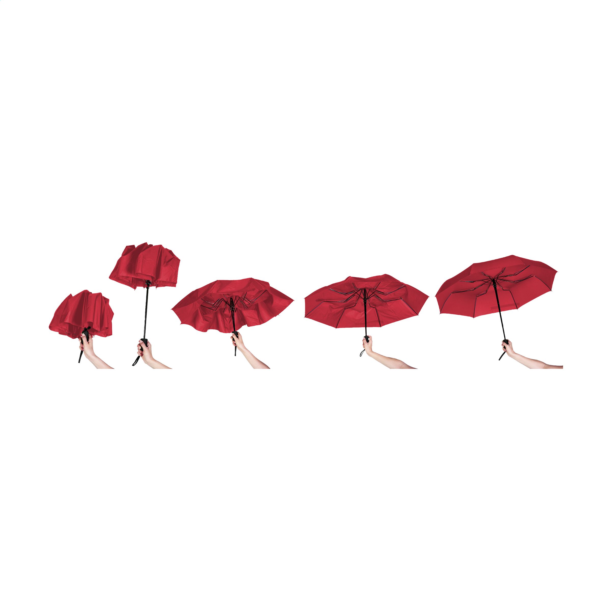Vollautomatisch zusammenklappbarer Regenschirm. Mit Schaft und Gestell aus Metall, Gummihandgriff und Klettbandverschluss. In Hülle.