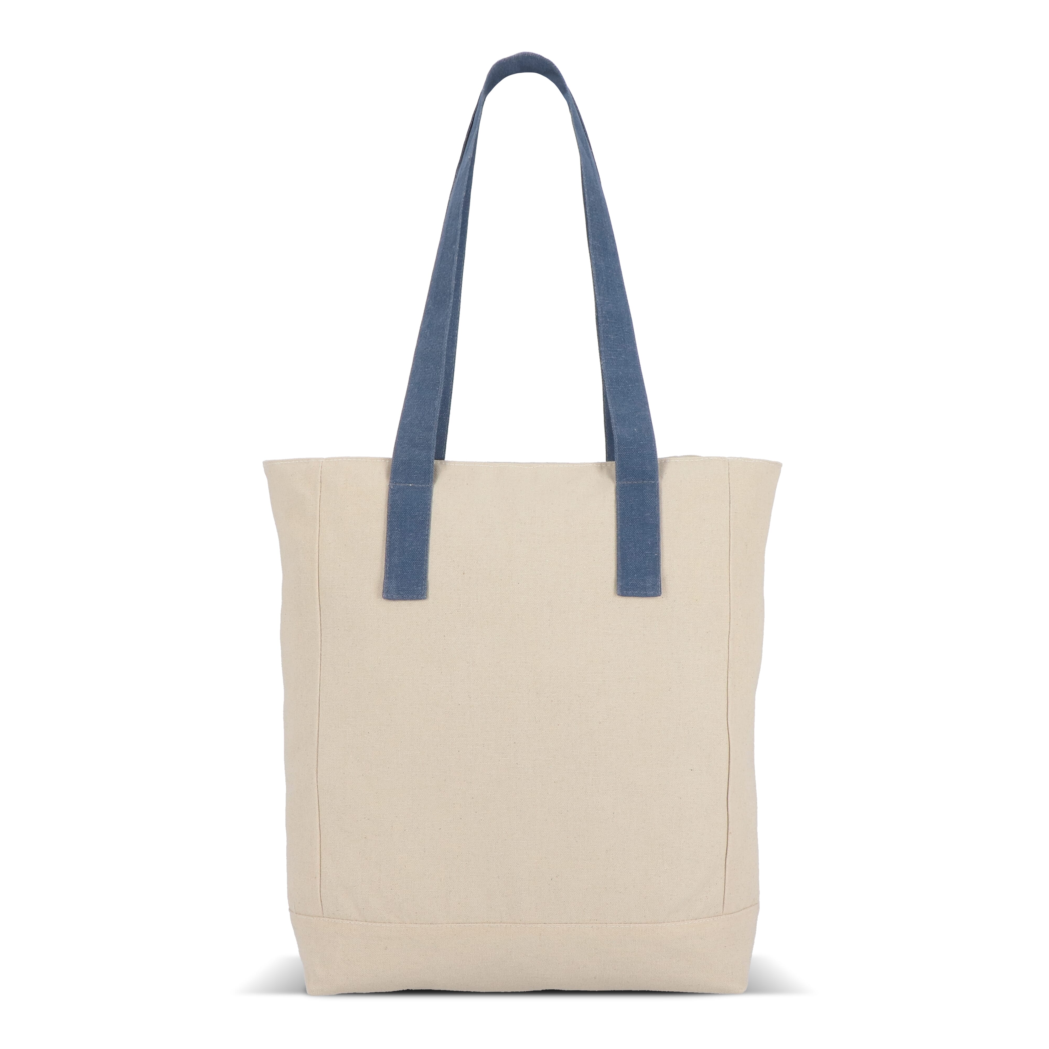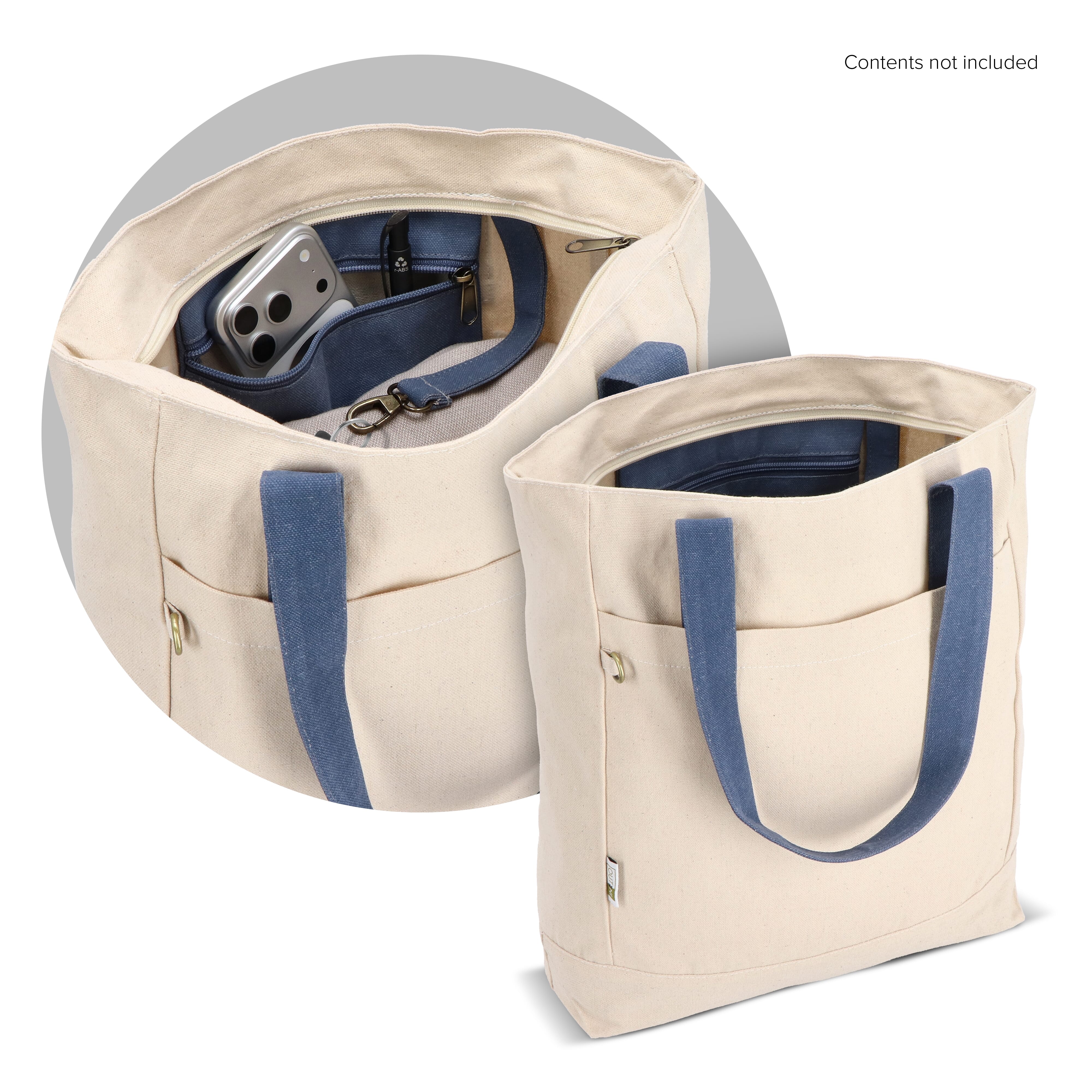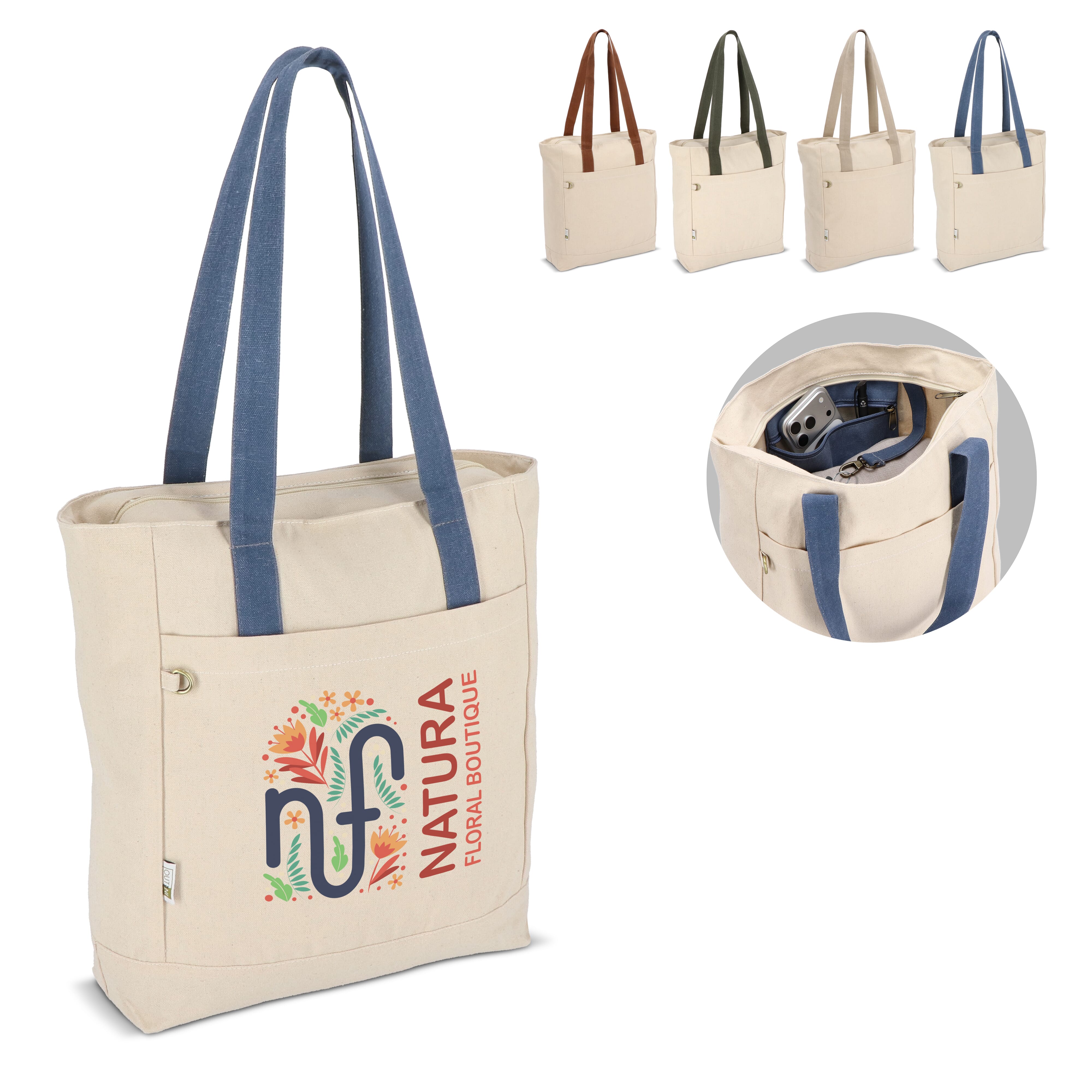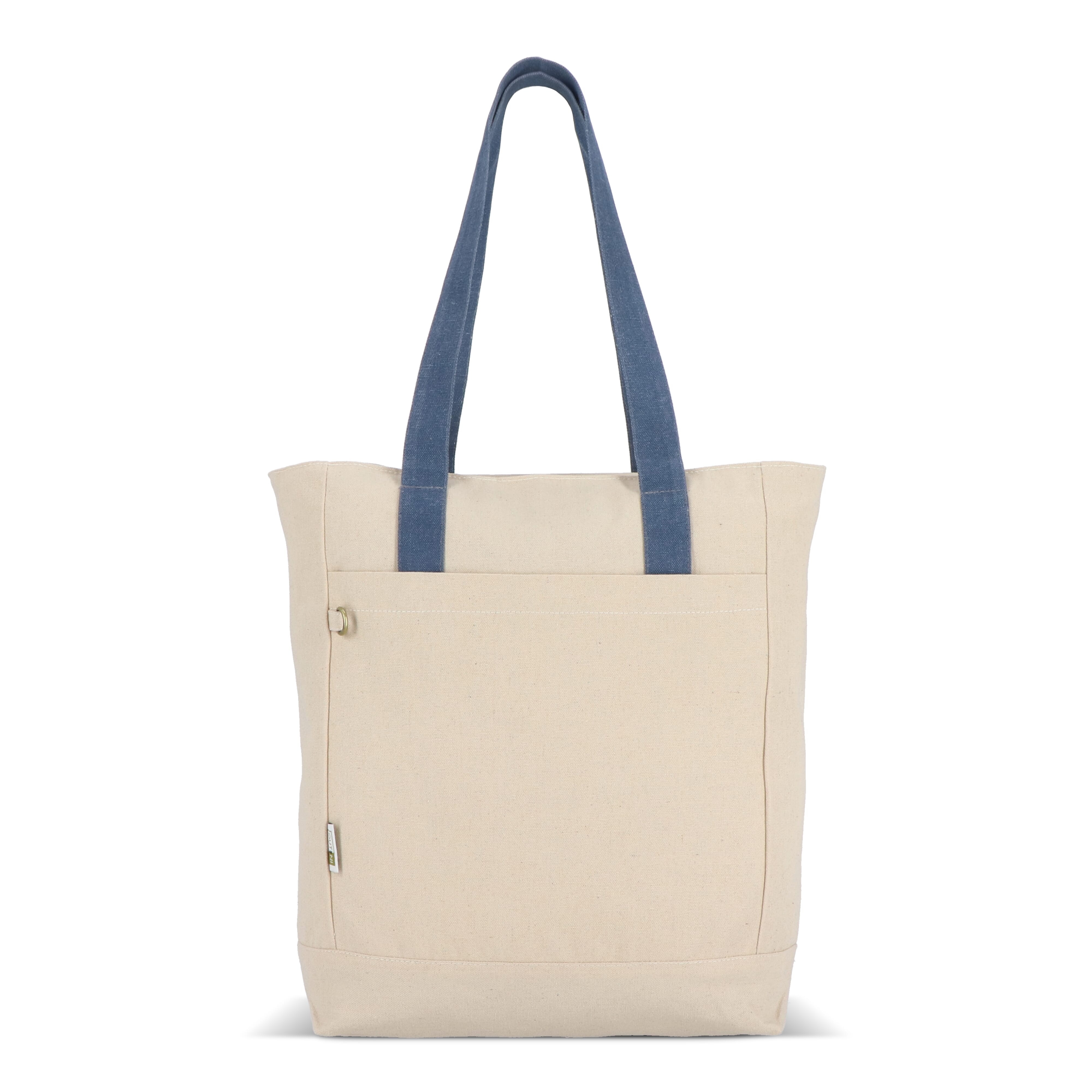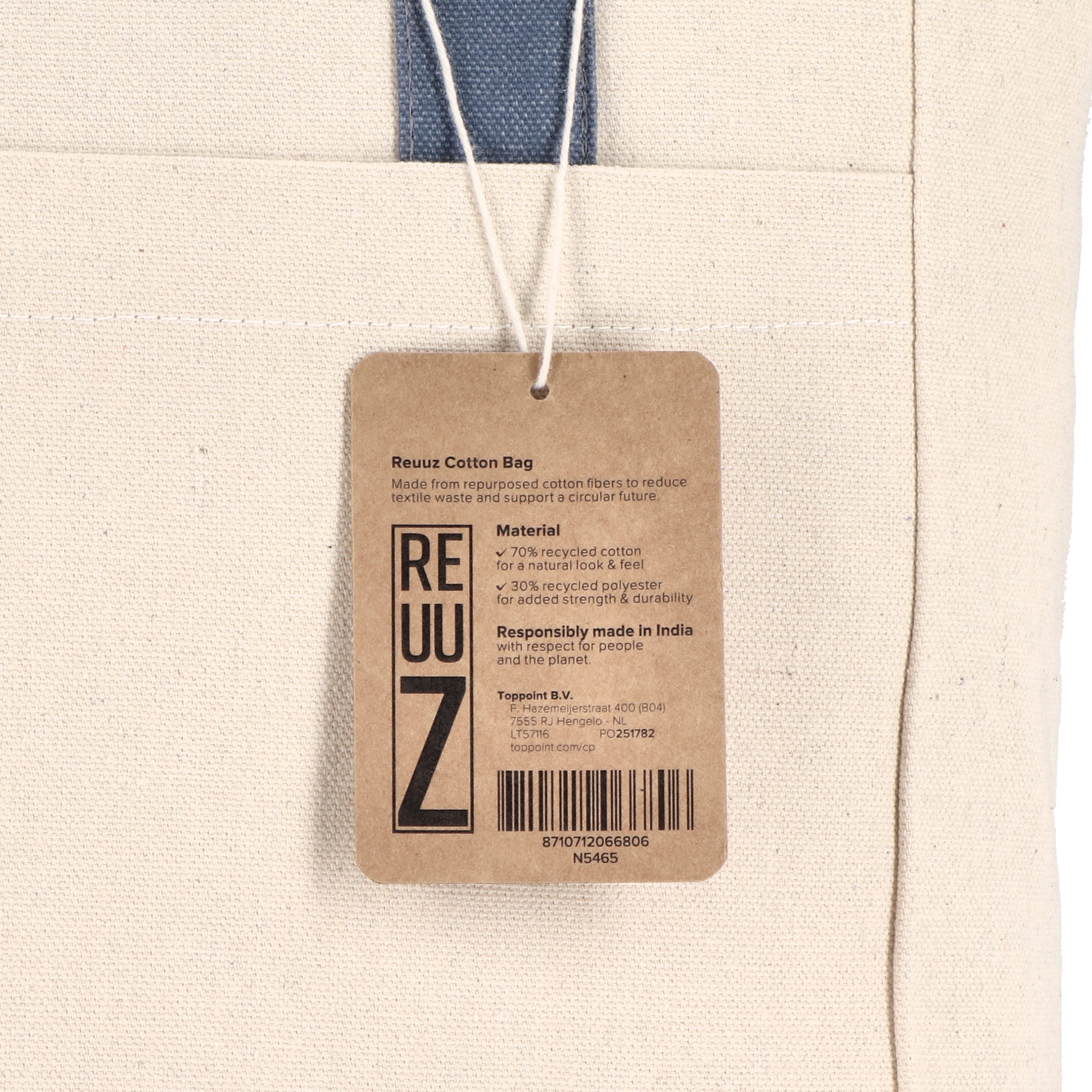 Robuste Canvas-Tasche Reuuz von InSideOut, hergestellt aus 70 % recycelter Baumwolle und Fasern sowie 30 % recyceltem Polyester. Mit bunten Griffen, Reißverschluss, geschlossenem Innenfach und Metallkarabiner für Schlüssel. Ökologisch und praktisch.