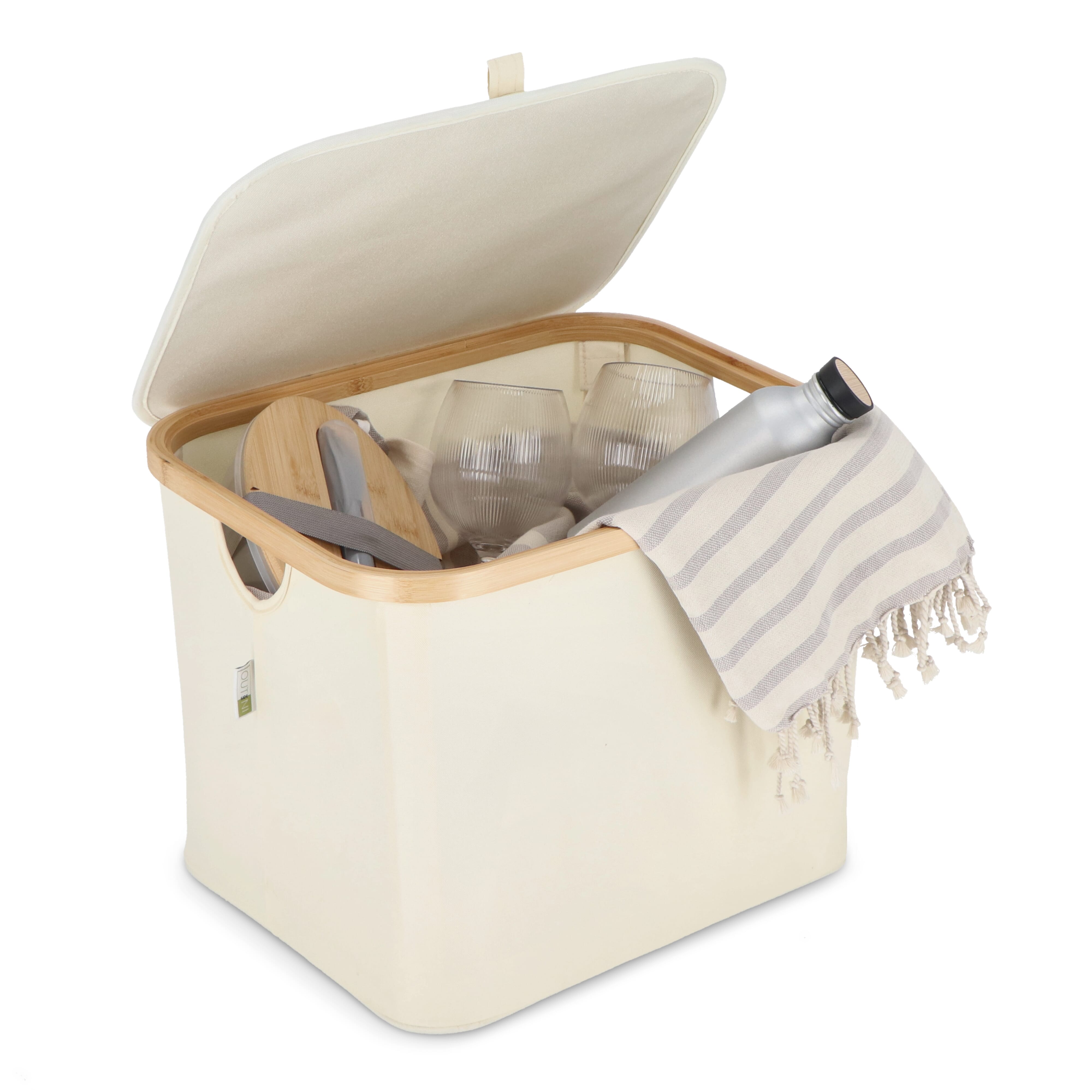 Dieser faltbare Korb Sogne von InSideOut ist eine stilvolle und nachhaltige Aufbewahrungslösung aus recycelten Materialien und Bambus. Das moderne Design passt perfekt in jedes Interieur und sorgt dafür, dass jeder Raum ordentlich und sauber bleibt. Der Korb hat einen Deckel und ist sowohl faltbar als auch stapelbar, was ihn funktional und platzsparend macht. Jede Ecke des Korbs ist mit textilummantelten Stützen verstärkt, die einfach unter dem Bambusrahmen mit Klettverschluss befestigt werden können. Dank dieses cleveren Systems kann der Korb schnell gefaltet und entfaltet werden, was ihn einfach zu lagern und ideal für den täglichen Gebrauch macht. Kurz gesagt, der faltbare Korb Sogne vereint Nachhaltigkeit, Stil und Praktikabilität in einem. Es gibt Platz für einen Druck auf dem Deckel, sodass Ihr Logo immer sichtbar ist.