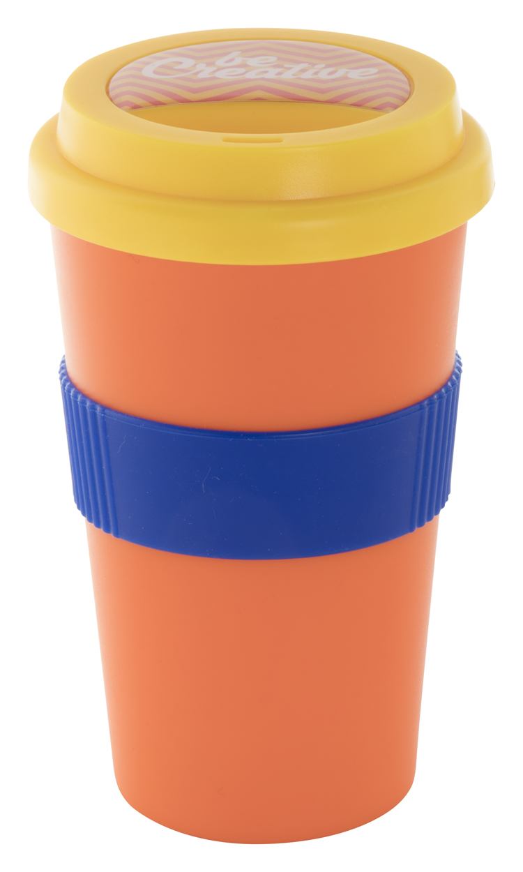 Beschreibung: Individualisierbarer, doppelwandiger Thermobecher aus Kunststoff mit Trinkdeckel und Silikongriff. Füllmenge: 400 ml. Mindestbestellmenge: 50 Stück.