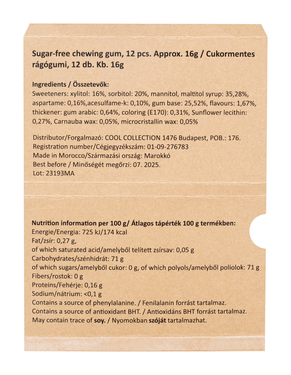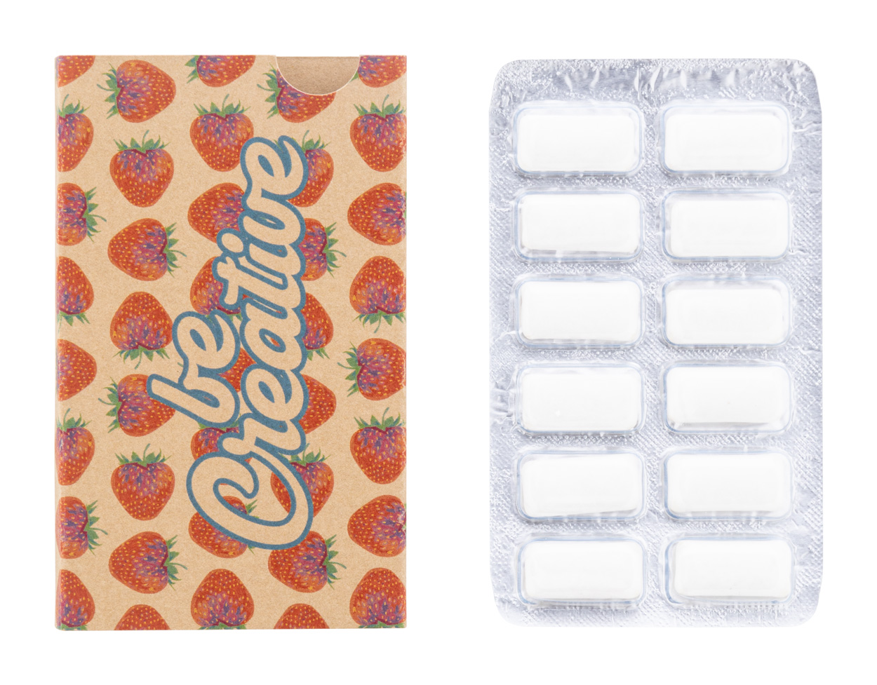 12 Stück zuckerfreier Kaugummi im Blister mit individuell gestalteter, vollfarbig bedruckter Kraftpapierhülle. MOQ: 100 Stück.