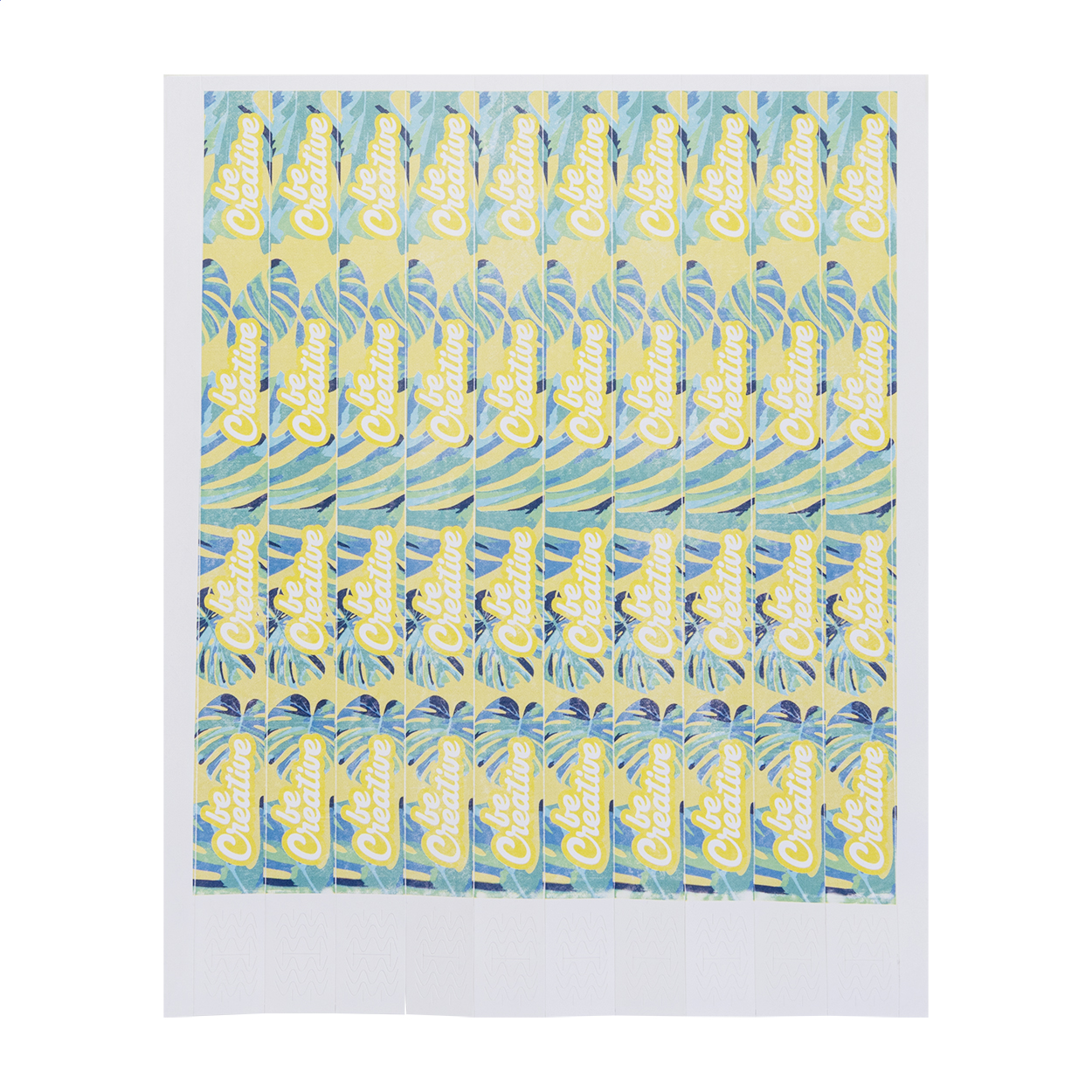 Ein Bogen mit 10 vollfarbig bedruckten, 19 mm breiten Tyvek-Armbändern mit Klebeverschluss und individueller Nummerierung. Der Preis ist inkl. Digitaldruck auf der Vorderseite. Mindestmenge: 50 Bögen (500 Armbänder).