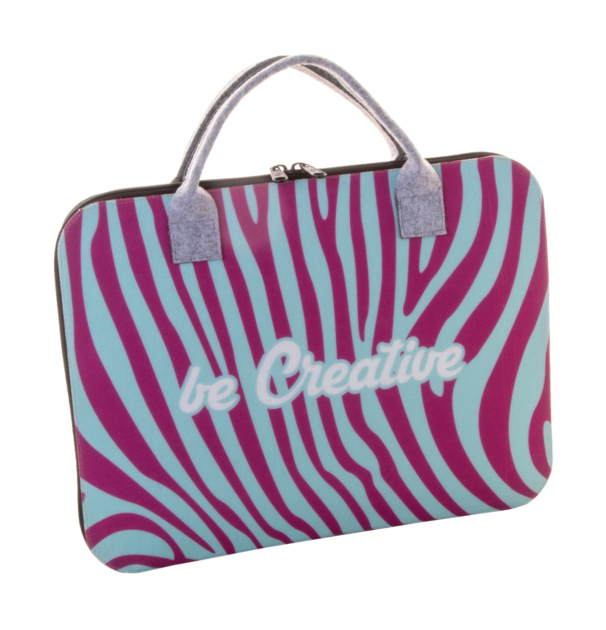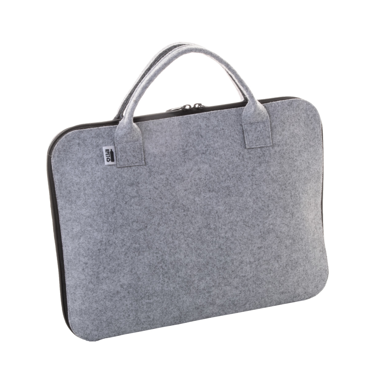 Individuelle Dokumententasche aus RPET Filz mit vollfarbig bedruckter Vorderseite, Reißverschlusshauptfach und RPET-Label. Der Preis ist inklusive dem Sublimationsdruck. Mindestmenge: 25 Stk.