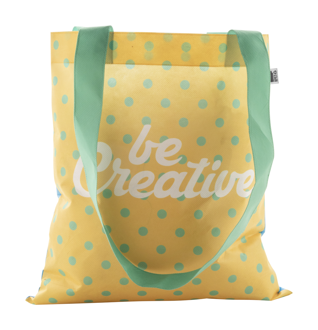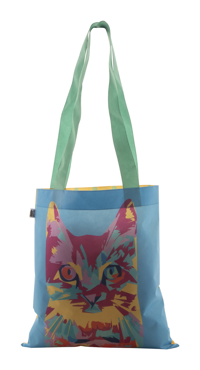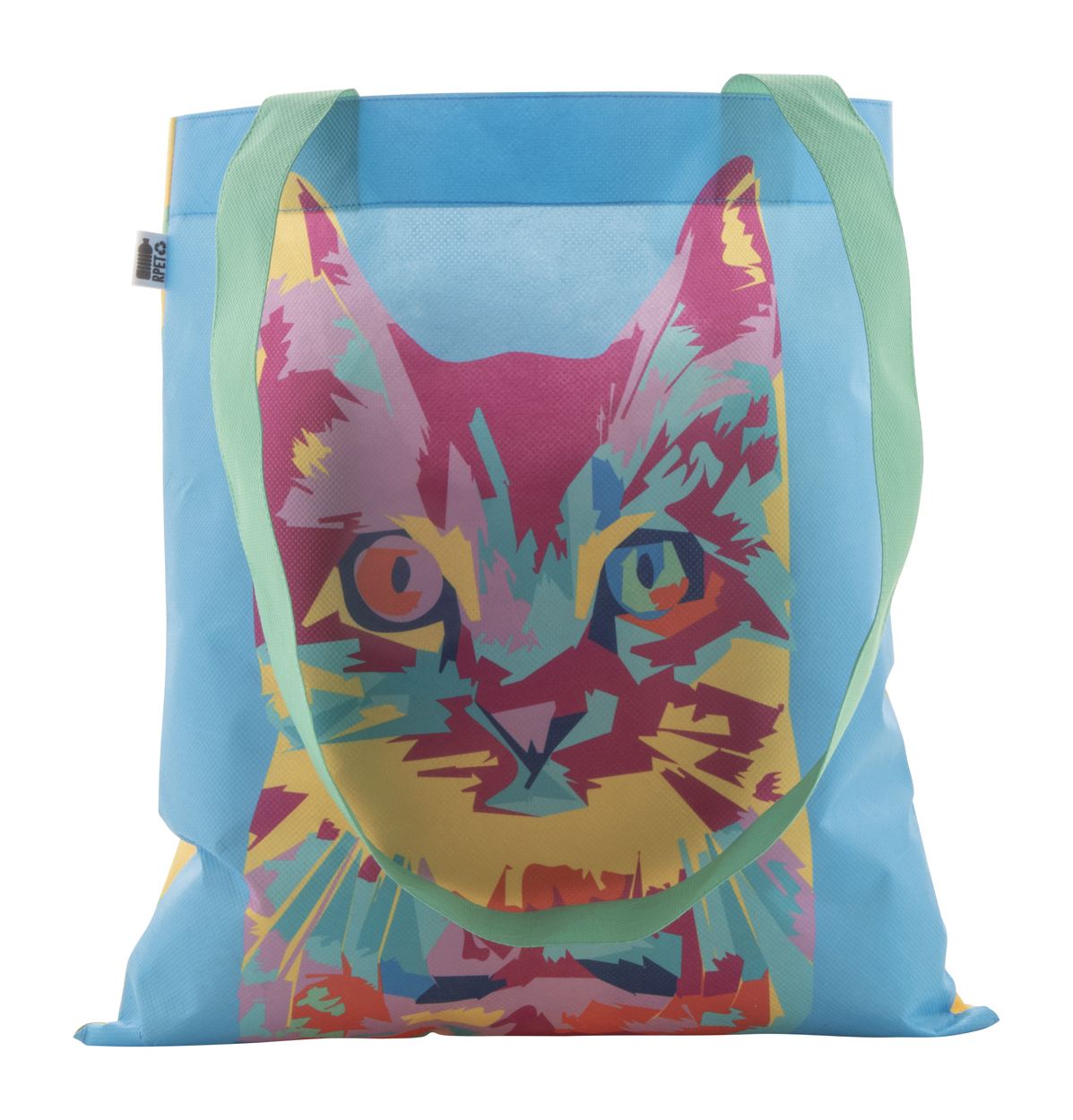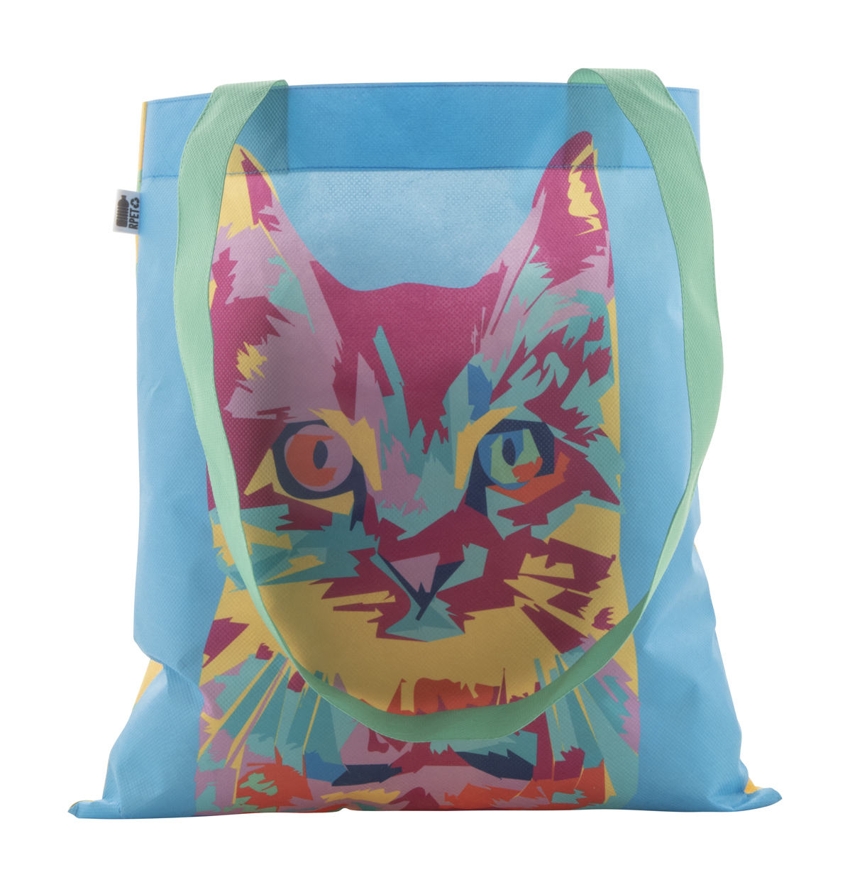 Individuelle Einkaufstasche aus RPET Non-Woven (80g / m²) mit langen Henkeln. Der Preis ist inkl. All-Over-Sublimationsdruck. Mindestmenge: 25 Stk. Mit RPET-Label.