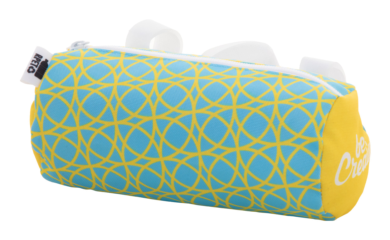Individuelle Fahrradlenkertasche aus 600D RPET-Polyester mit Reißverschluss und einstellbaren Klettverschlussriemen. Der Preis ist inkl. vollflächigem Sublimationdruck. Mit RPET-Label. Mindestmenge: 25 Stk.