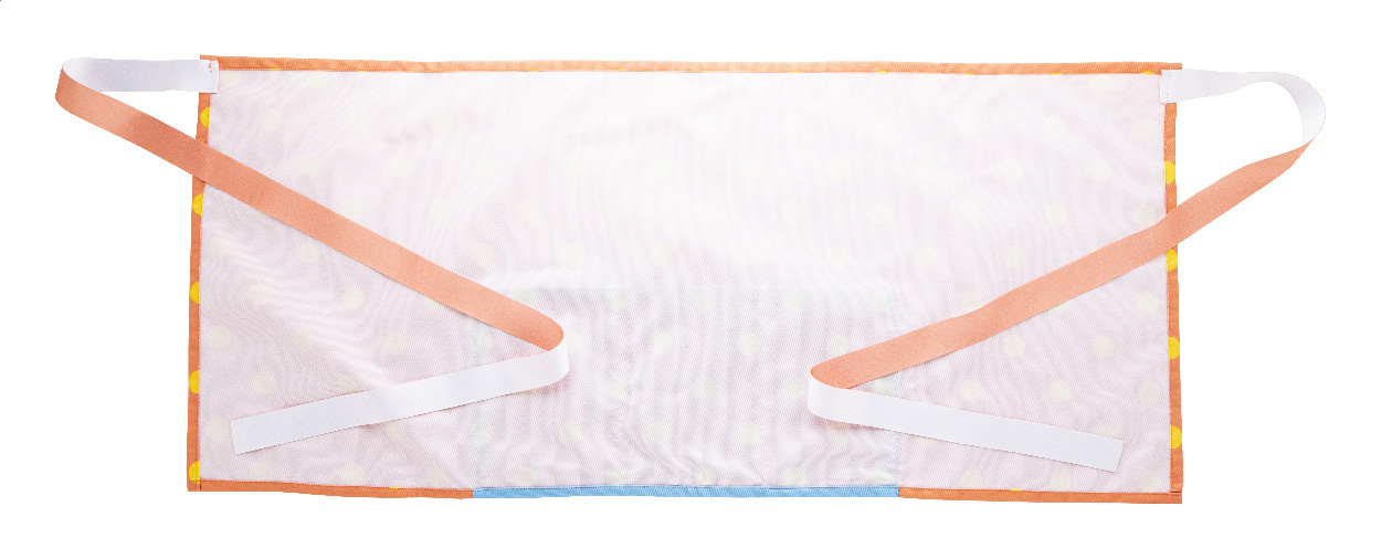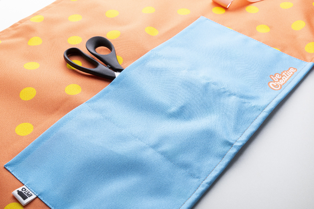 Individuelle Bistro-Schürze aus 600D RPET-Polyester mit dreifacher Fronttasche und vollflächigem Sublimationsdruck. Mindestmenge: 25 Stk. Mit RPET-Label.