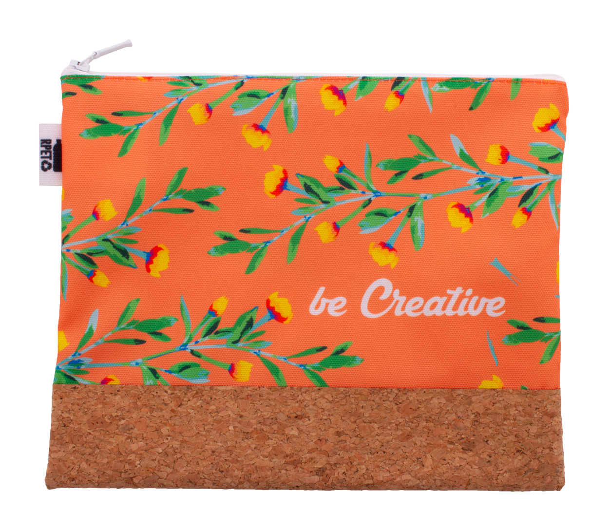 Individuelle Reißverschluss-Kosmetiktasche aus 600D RPET Polyester und natürlichem Kork mit vollflächigem Sublimationsdruck. Mindstmenge: 50 Stk.