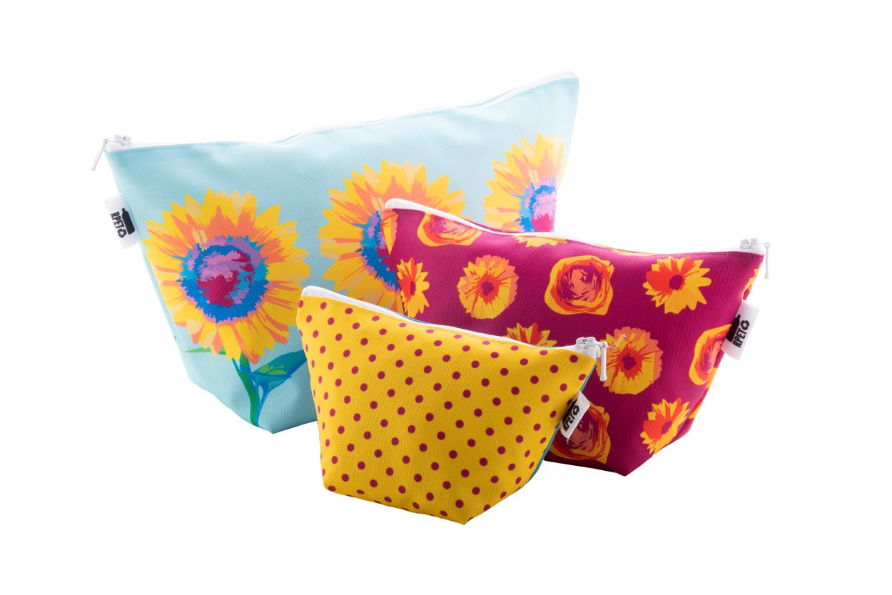 Individuelle Reißverschluss-Kosmetiktasche aus 600D RPET Polyester mit vollflächigem Sublimationsdruck und RPET-Label. Mindestmenge: 50 Stk.