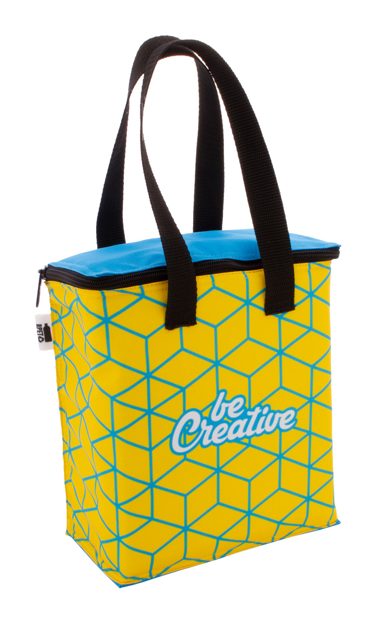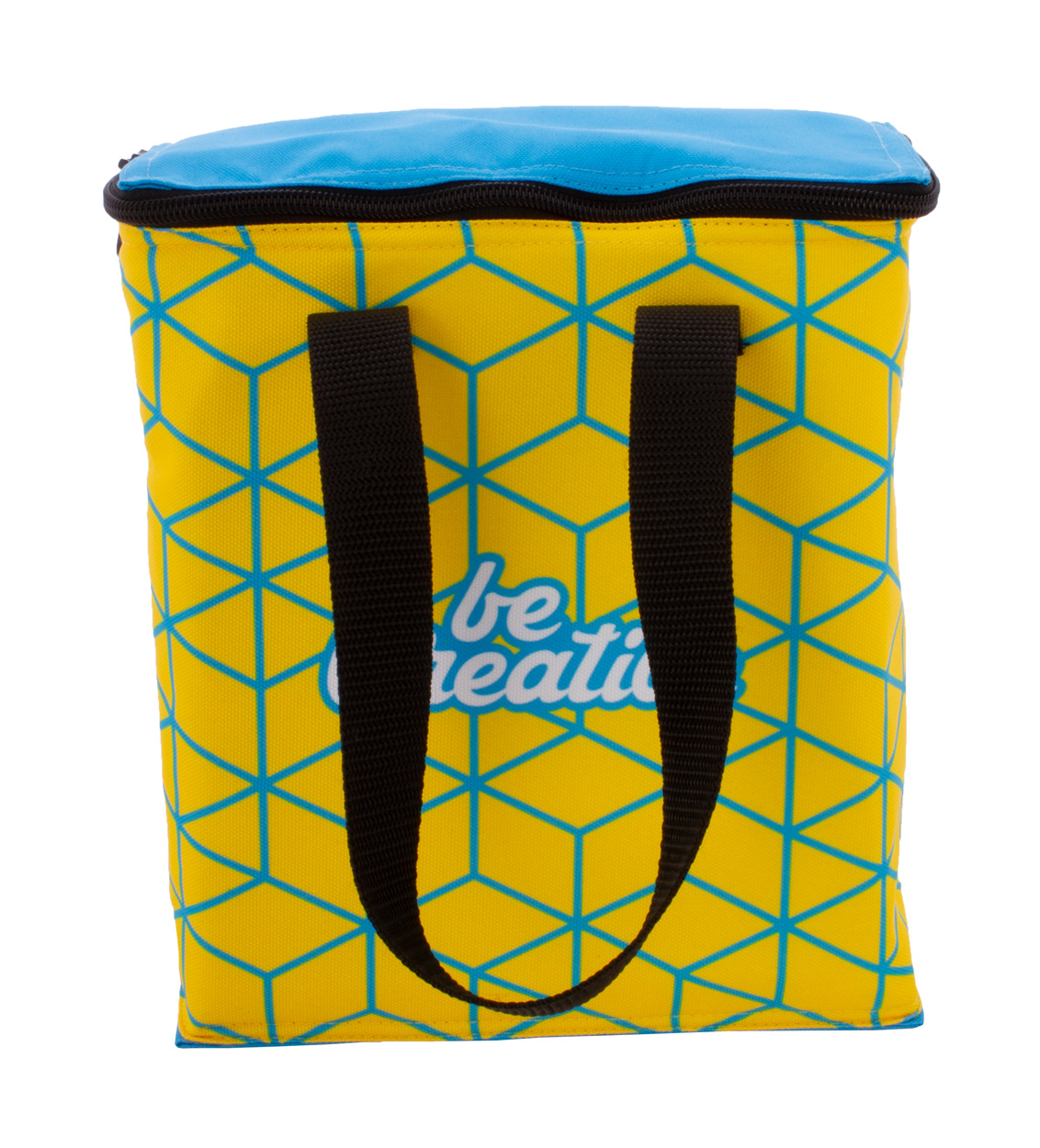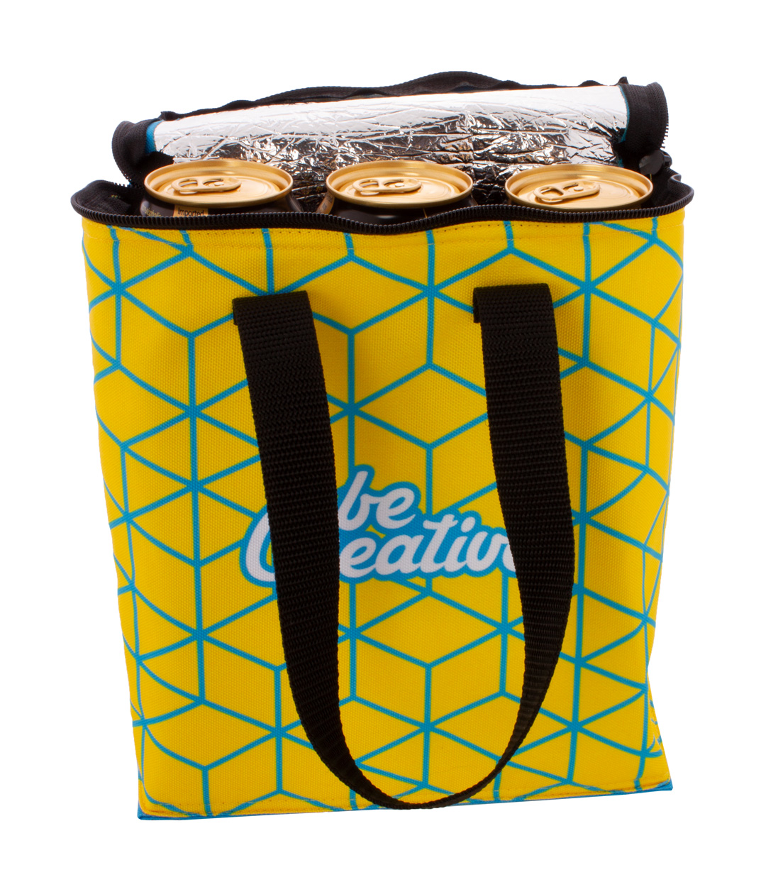 Individuelle Kühltasche mit Reißverschluss ud Aluminiumpolsterung für 6 Stück 0,33 l Dosen. Material: 600D RPET Polyester, mit RPET-Label. Der Preis ist inkl. Sublimationsdruck. Mindestmenge: 25 Stk.