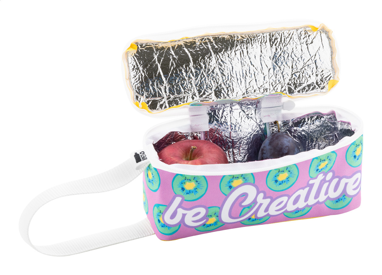 Individuelle Mini-Lunchbag mit Reißverschluss aus 600D RPET-Polyester mit Reisverschluss und Aluminiumpolsterung. Ideal zum Verpacken von Snacks oder einem Sandwich. Mit vollflächigem Sublimationsdruck. Mit RPET-Label. DerPreis ist inkl. vollflächigem Sublimationsdruck. Mindestmenge: 25 Stk.