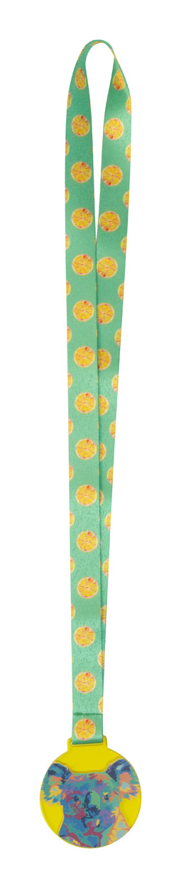 Individuelle Metallie aus Acryl mit Lanyard aus RPET. Der Preis ist inkl. Sublimationsdruck auf dem Lanyard sowie UV LED Druck auf der Medallie. Mindestmenge: 100 Stk.