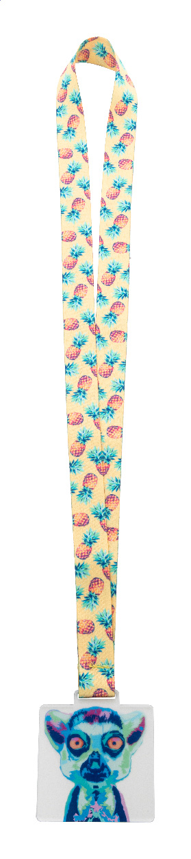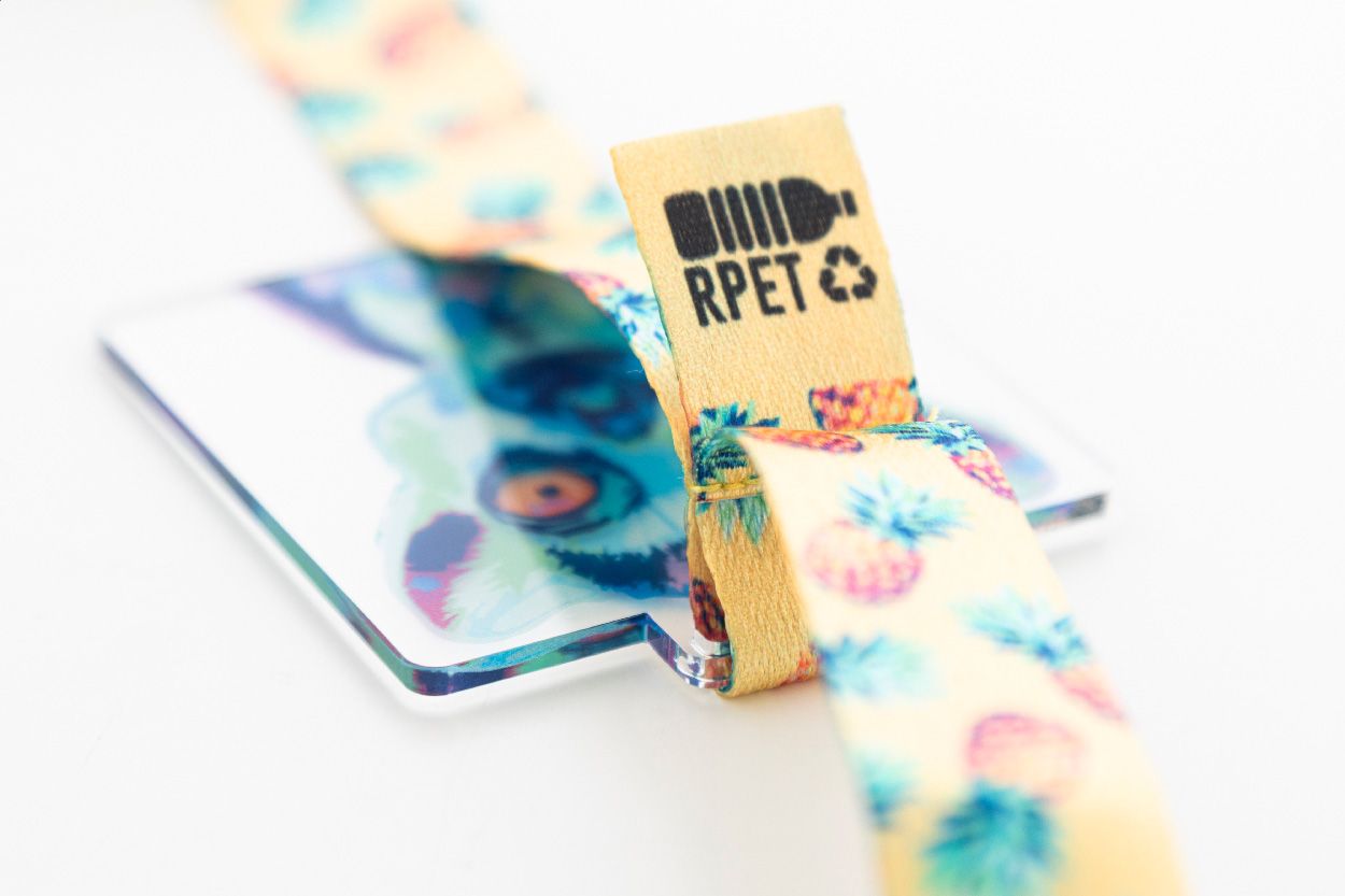 Individuelle, quadratische Medaille aus Acryl mit vollflächiger Bedruckung auf der Medallie sowie Sublimationsdruck auf dem RPET-Lanyard. Der Preis ist inklusive Sublations- und UV LED-Druck. Mindestmenge: 100 Stk.