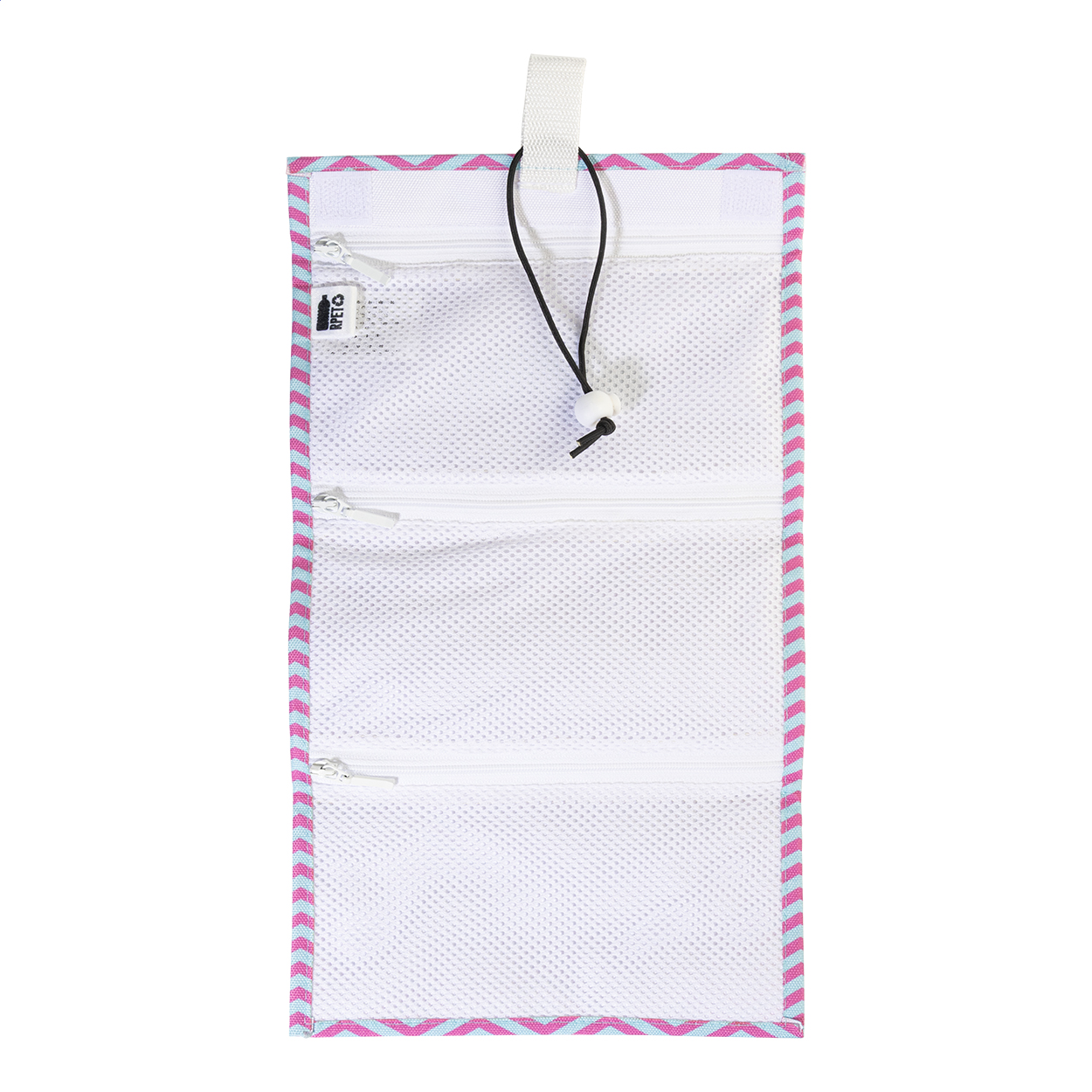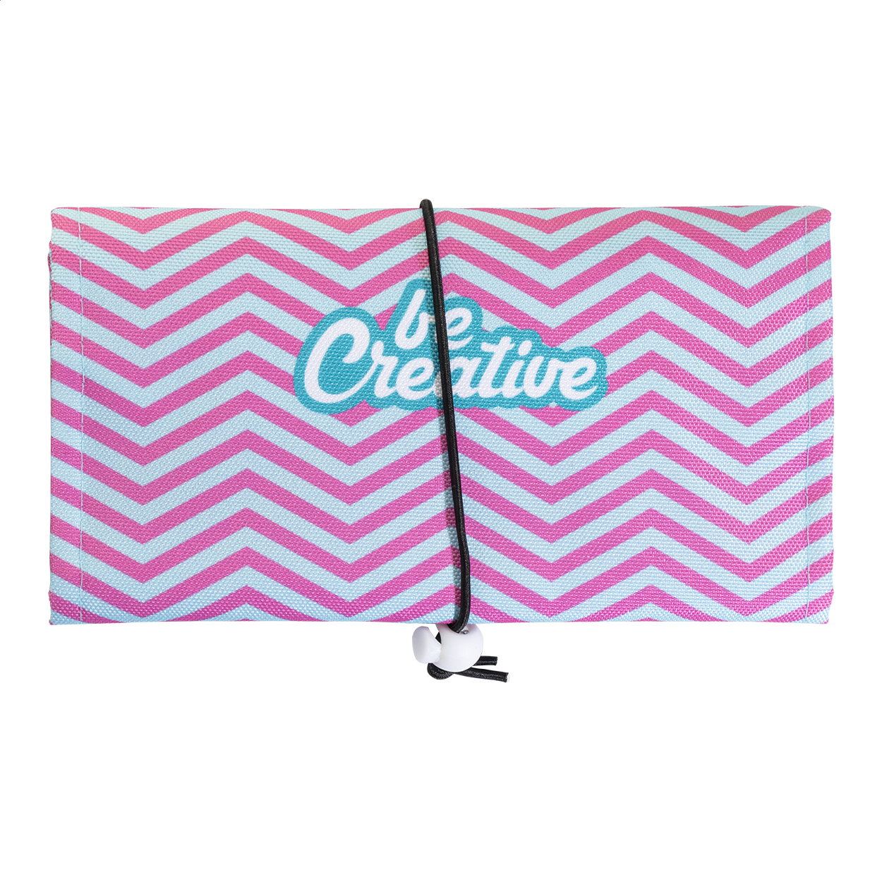 Individuelle Kabelorganizer-Tasche aus RPET-Polyester mit 3 Reißverschlussnetzfächern und elastischem Verschlussband. Der Preis ist inkl. vollflächigem Sublimationsdruck. Material: 600D RPET-Polyester. Mit Label RPET. Mindestmenge: 25 Stk.
