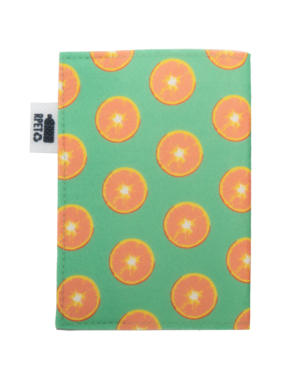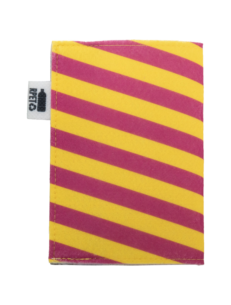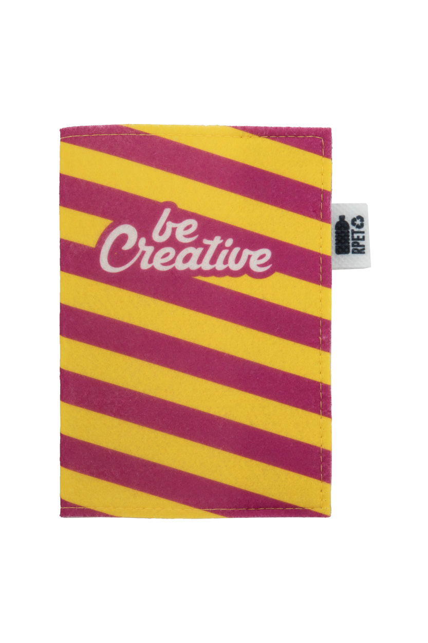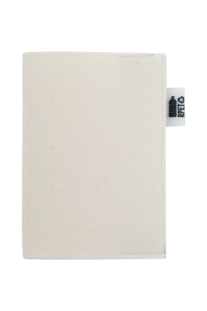 Individuelle Reisepasshülle aus RPET-Filz mit vollfarbig bedrucktem Einband und Druckknopfverschluss. Der Preis beinhaltet den Sublimationsdruck. Mit RPET-Label. Mindestbestellmenge: 50 Stk.