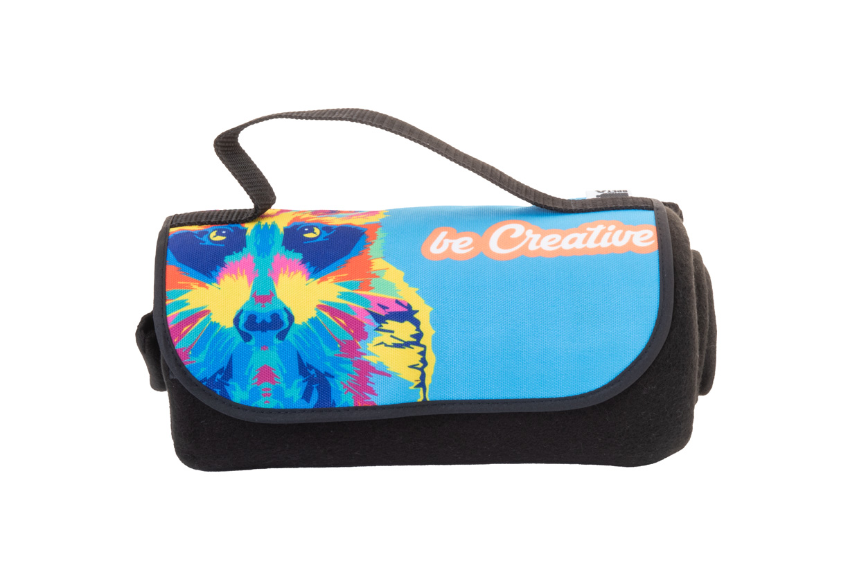 Individuelle RPET-Polarfleecedecke (200 g / m²) mit Klettverschluss-Tragegriff und Sublimationsdruck. Material:600D RPET-Polyester (mit RPET-Etikett). Mindestmenge 25 Stück.
