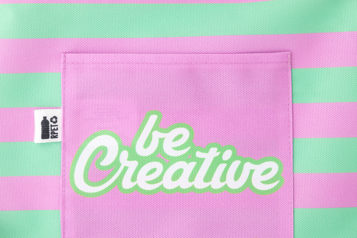 Maßgefertigte Kinderschürze aus 600D RPET Polyester mit Vordertasche und Sublimationsdruck. MOQ: 25 Stück.