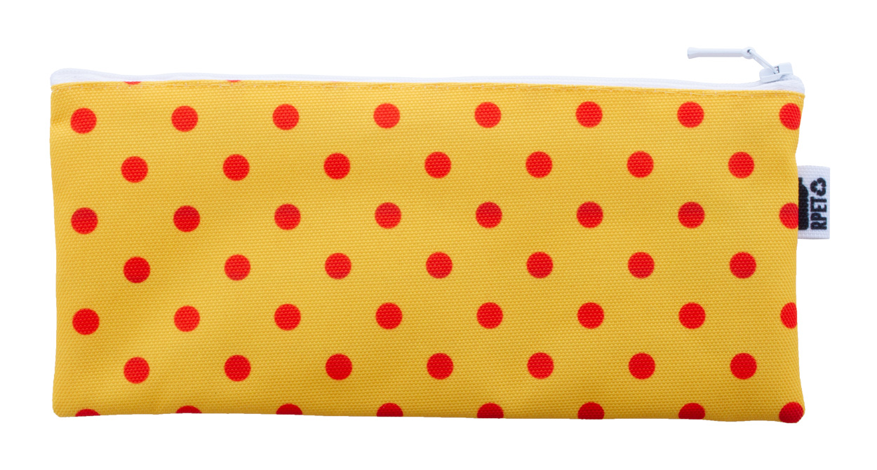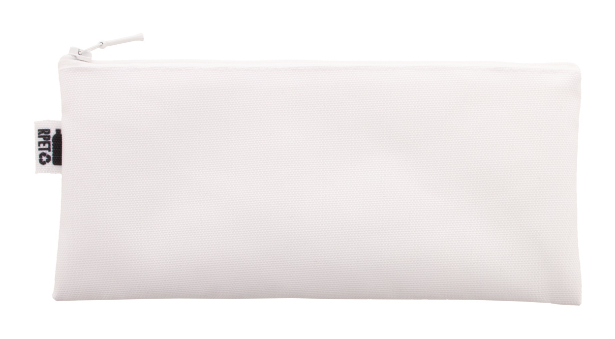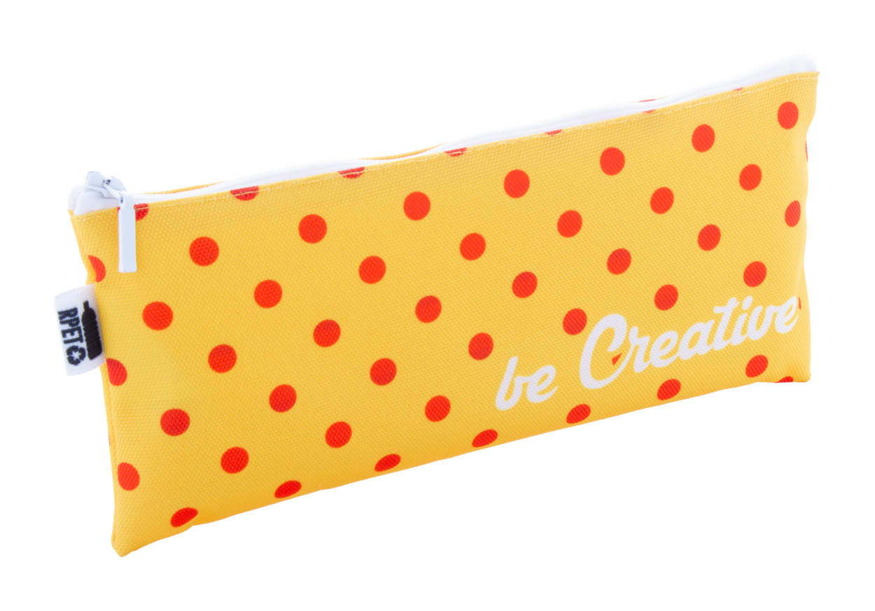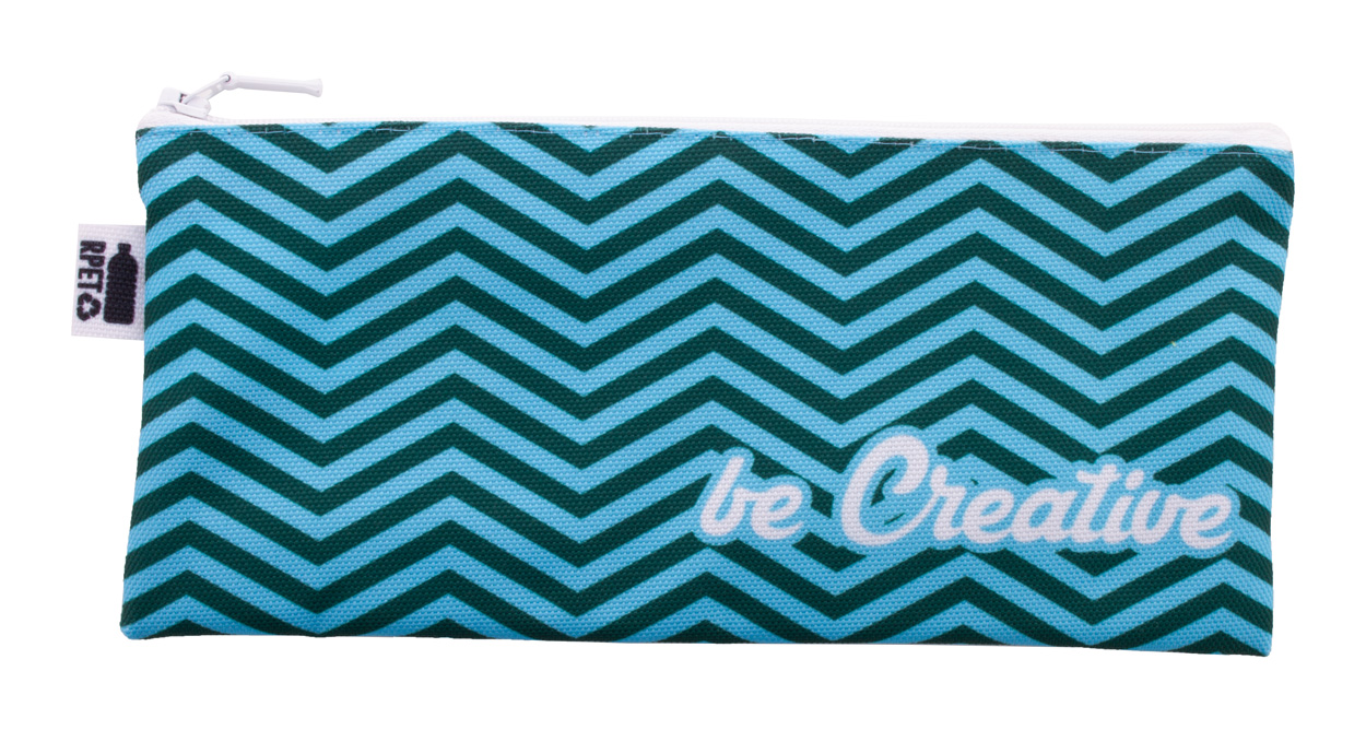 Individuelle Reißverschluss-Stiftetasche aus 600D RPET Polyester mit vollflächigem Sublimationsdruck und RPET-Label. Mindestmenge: 50 Stk.