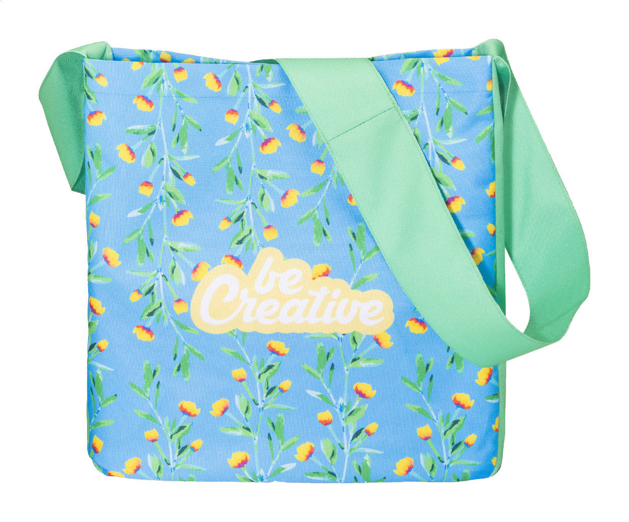 Individuelle Umhängetasche aus 600D RPET-Polyester mit langem Schultergurt und Knopfverschluss. Mit vollflächigem Sublimationsdruck. Mit RPET-Label. Mindestmenge: 25 Stk.