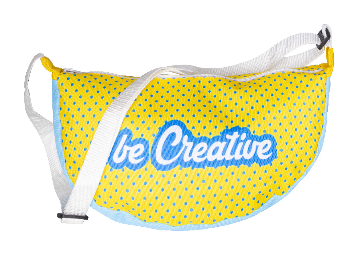 Individuelle Umhängetasche aus 600D RPET-Polyester mit verstellbarem Riemen und Reißverschlussfach. Mit vollflächigem Sublimationsdruck. Mit RPET-Label. Mindestmenge: 25 Stk.